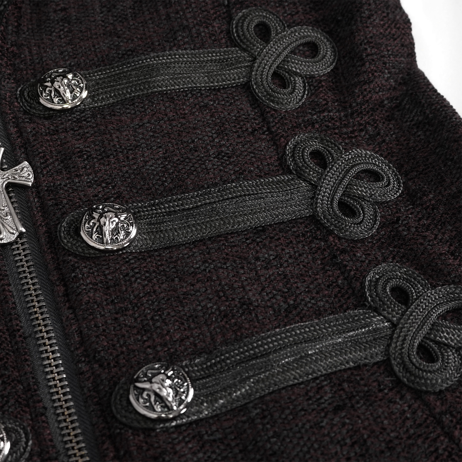 Gothic Vintage Uniform style men's jacket on a zipper. • Note the open laced shoulder details and embossed buttons. • Made of rugged denim fabric. • Laces (on shoulders) can be inlaced and removed...