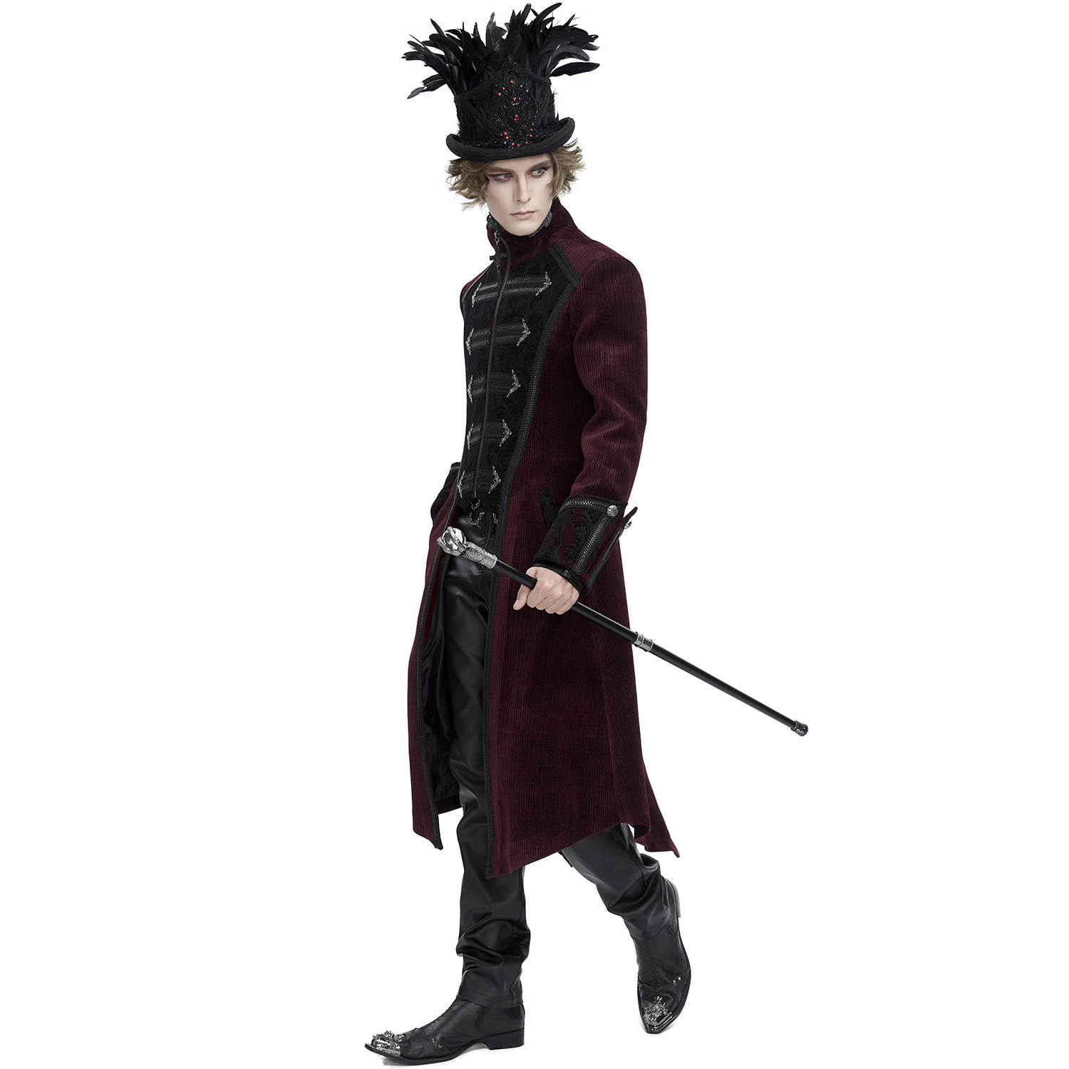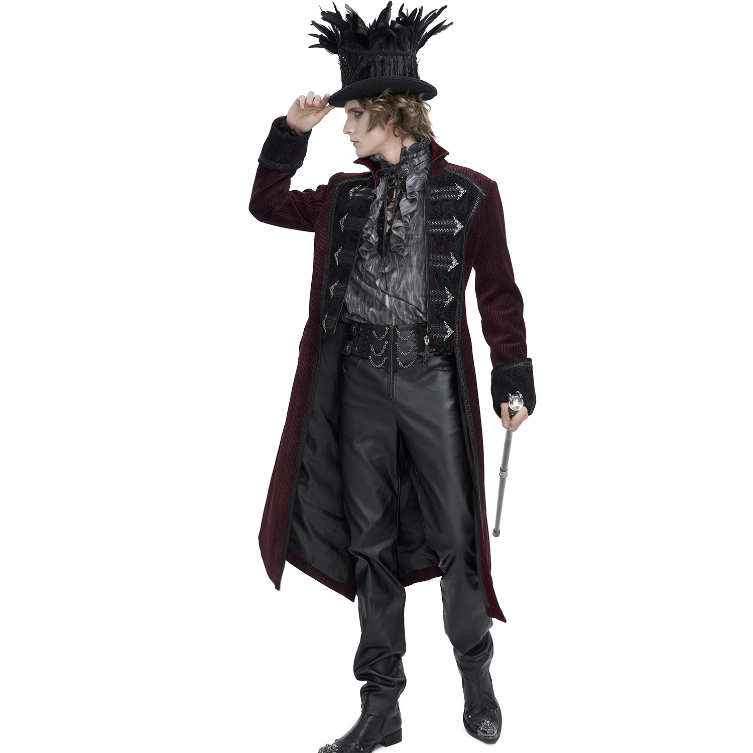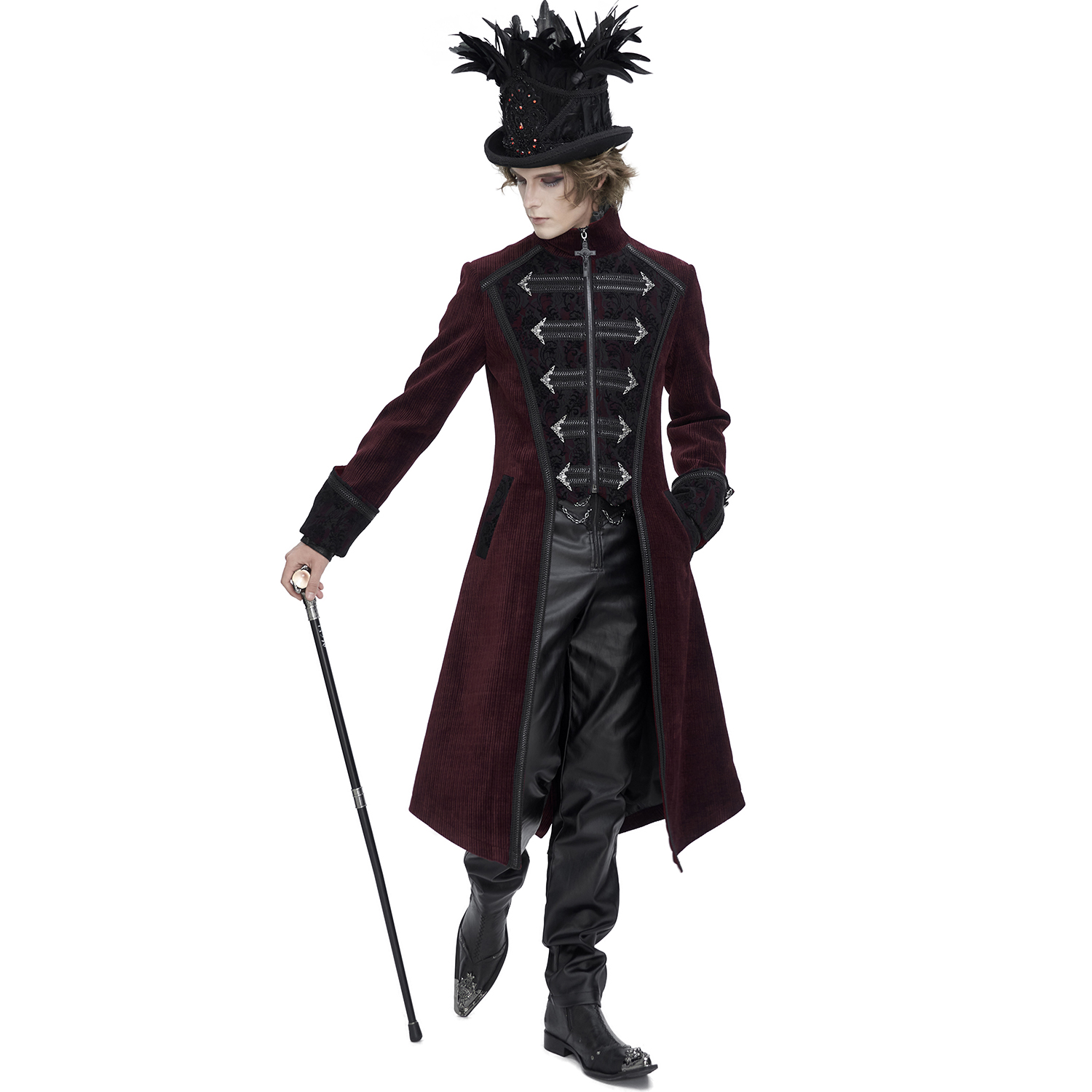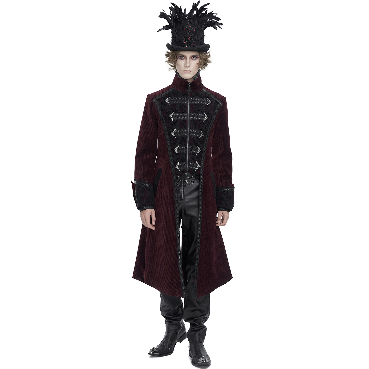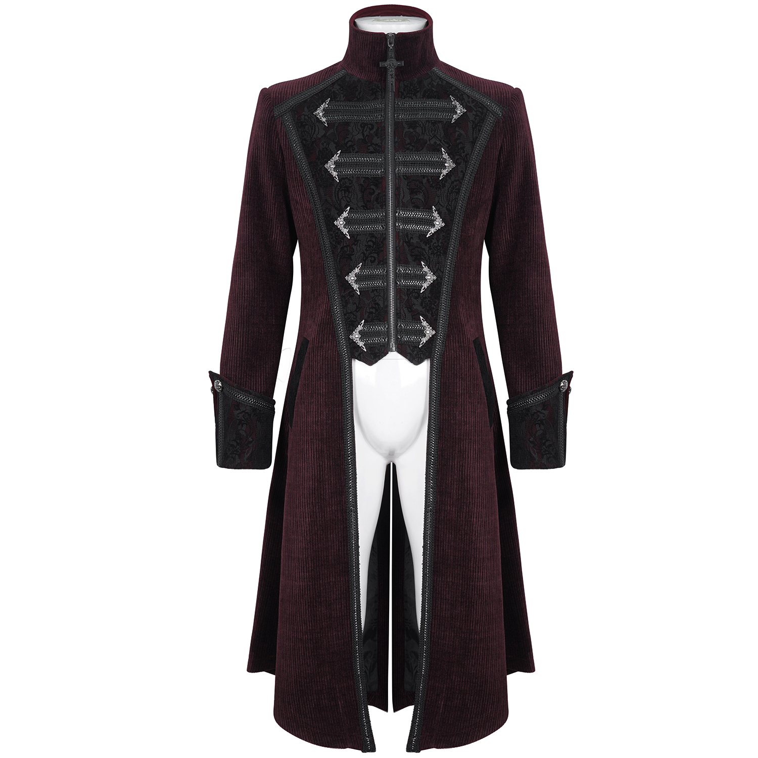 Gothic Coat for men • PU imitation leather with aged effect and black fabric • Mandarin style round neck • Visible zipper • Metal zipper personalized with the brand logo • Wide lapels with...