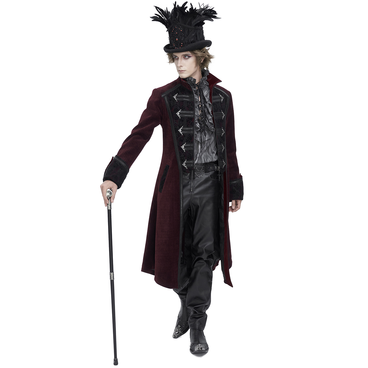 Superb Victorian Gothic Vampiric Men's Vest featuring a long black velvet fitted coat with a cashmere-embossed print and a full-length black leatherette outer cape attached to the shoulders. •...