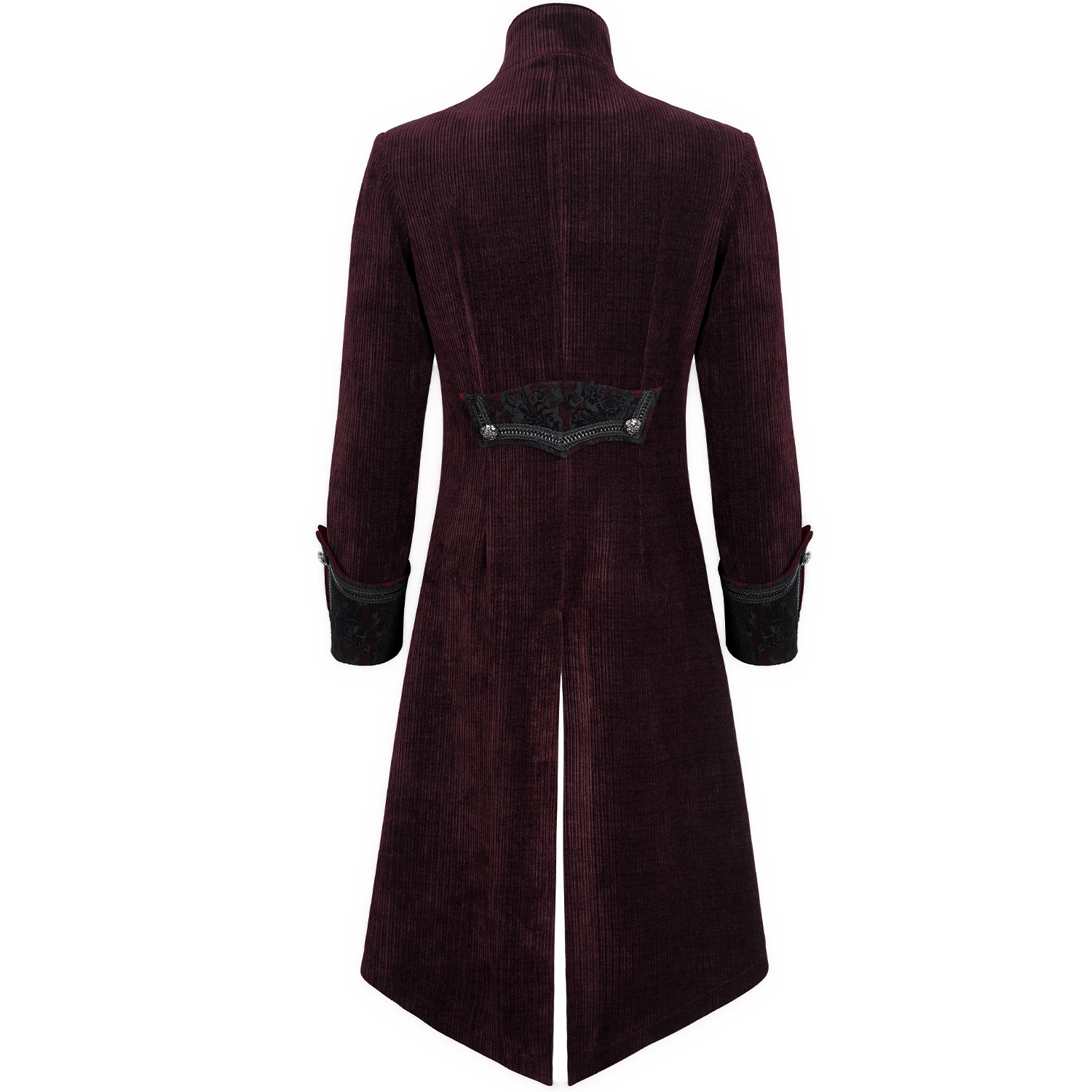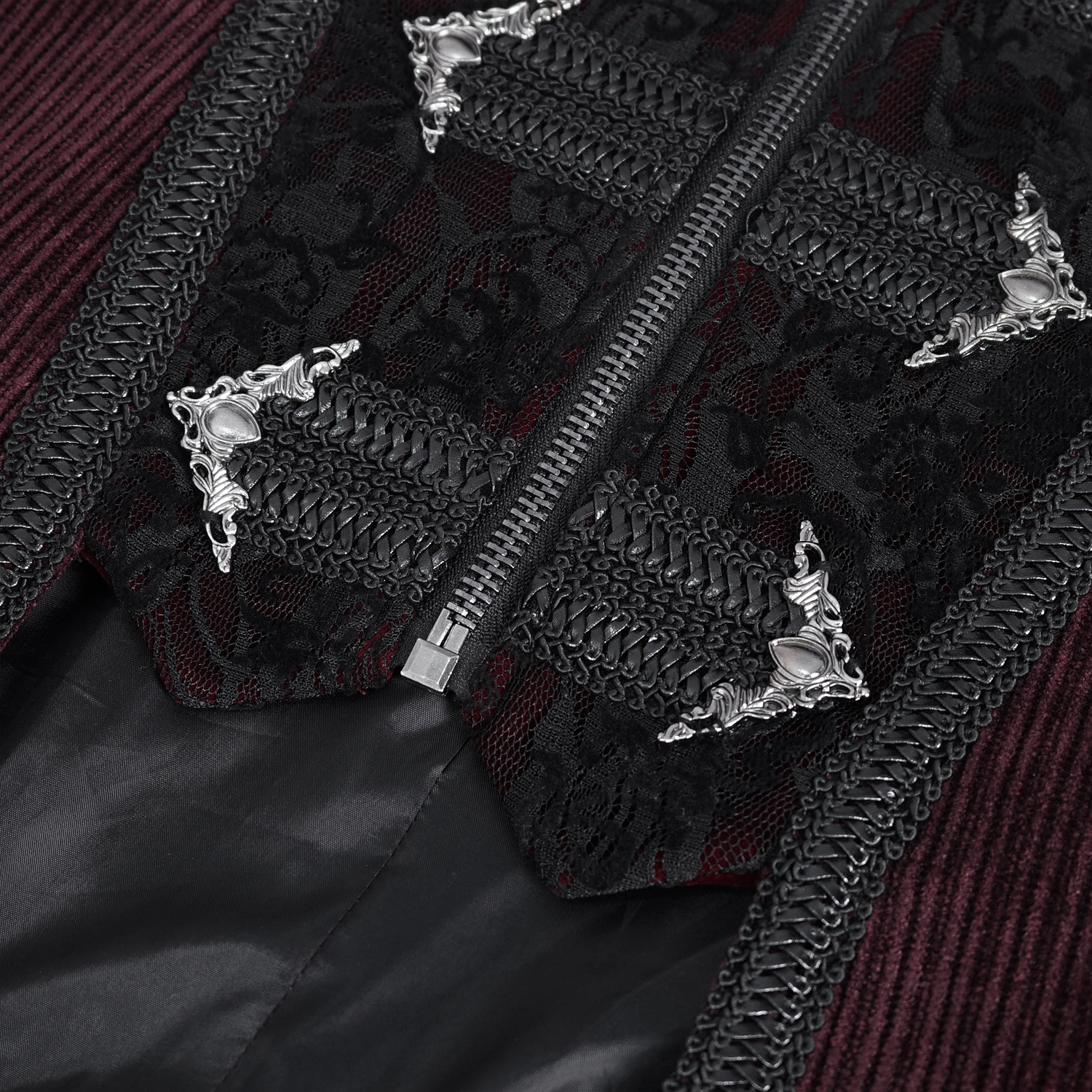 • Turn-back sleeves with black tulle and burgundy velvet, embellished with black braid and metal buttons
