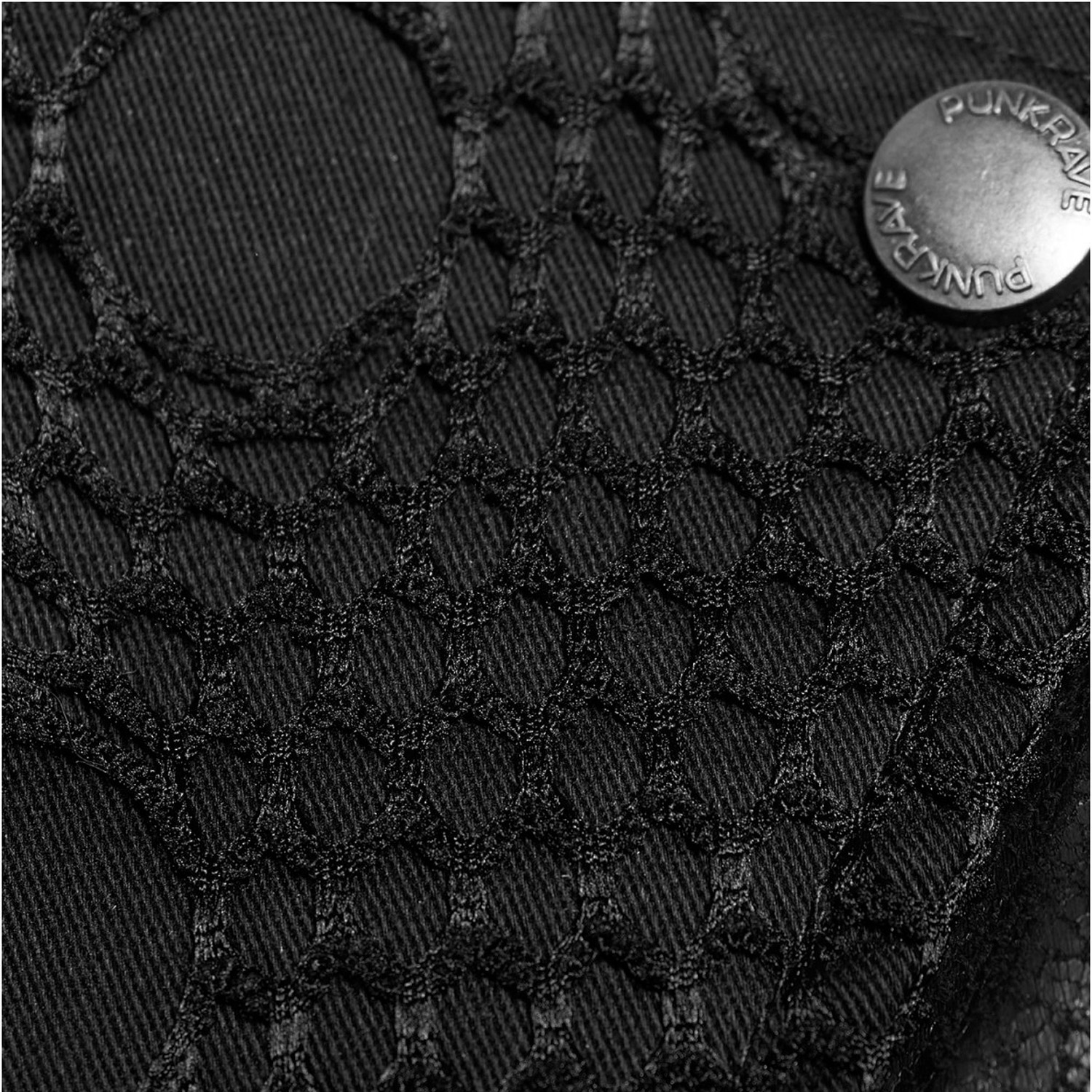 • The jacket is decorated with synthetic leather details, ripped off mesh fabric, zippers, eyelets