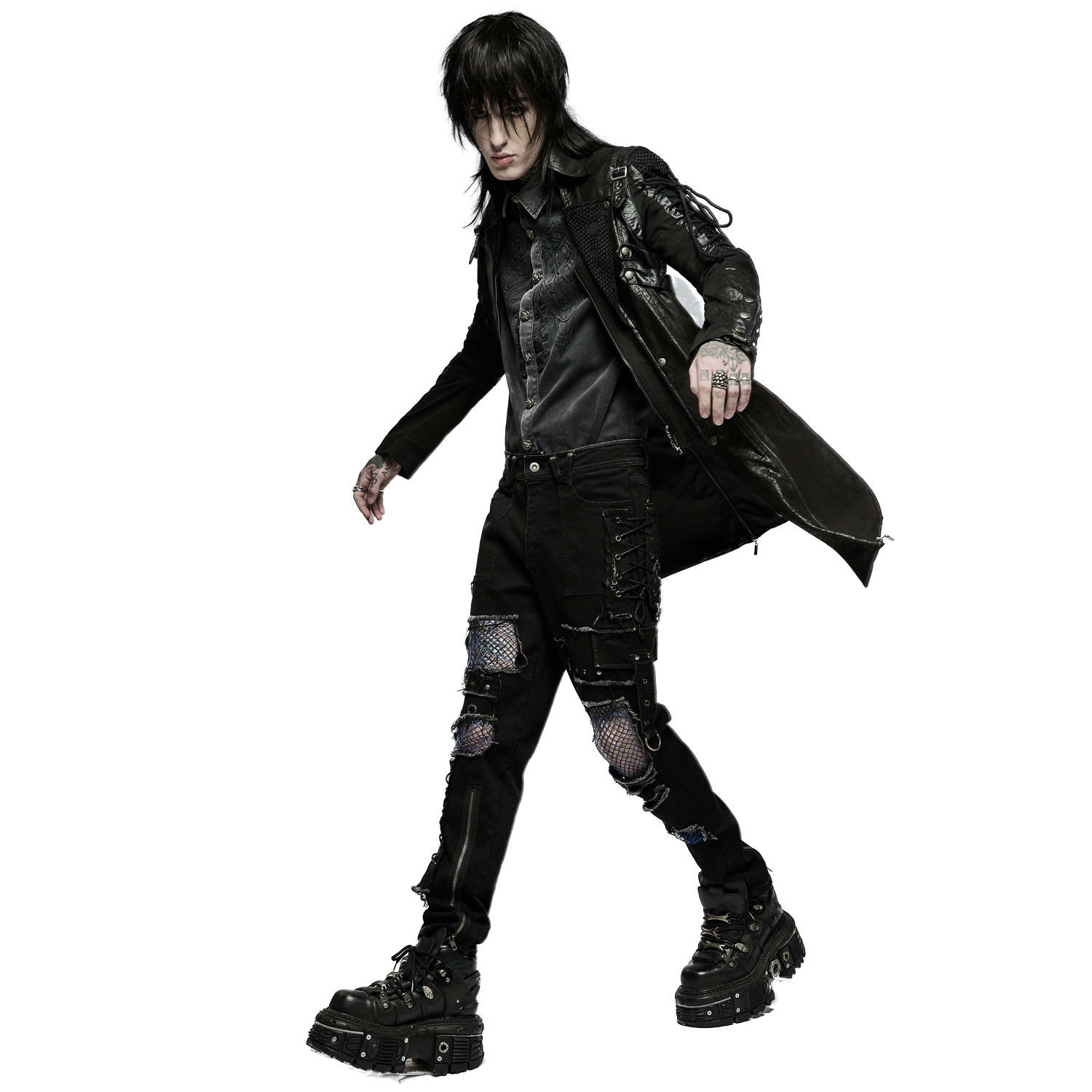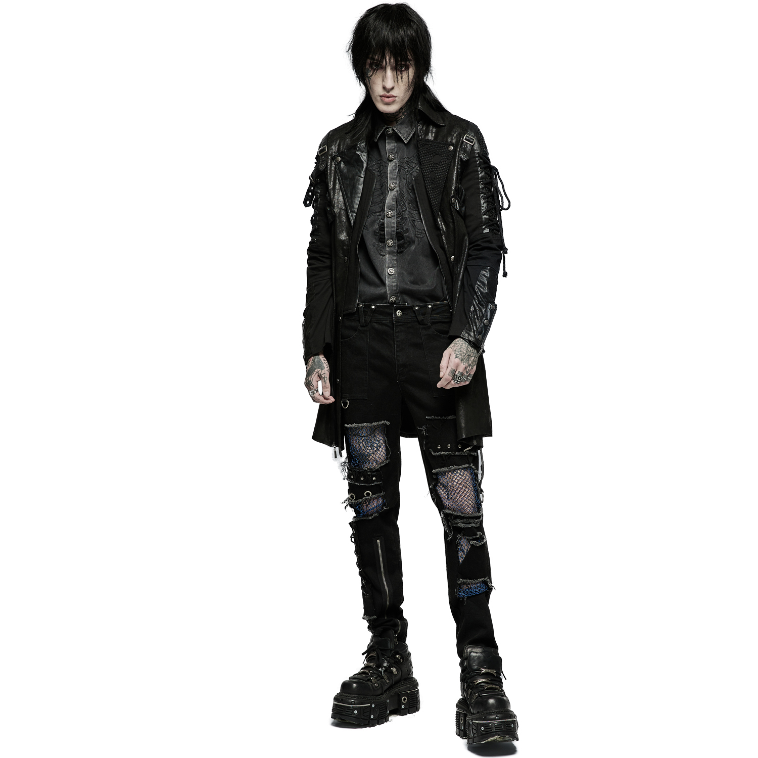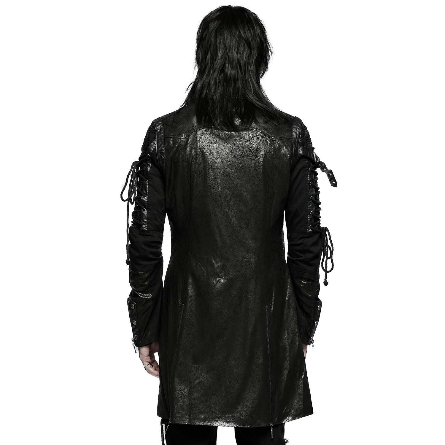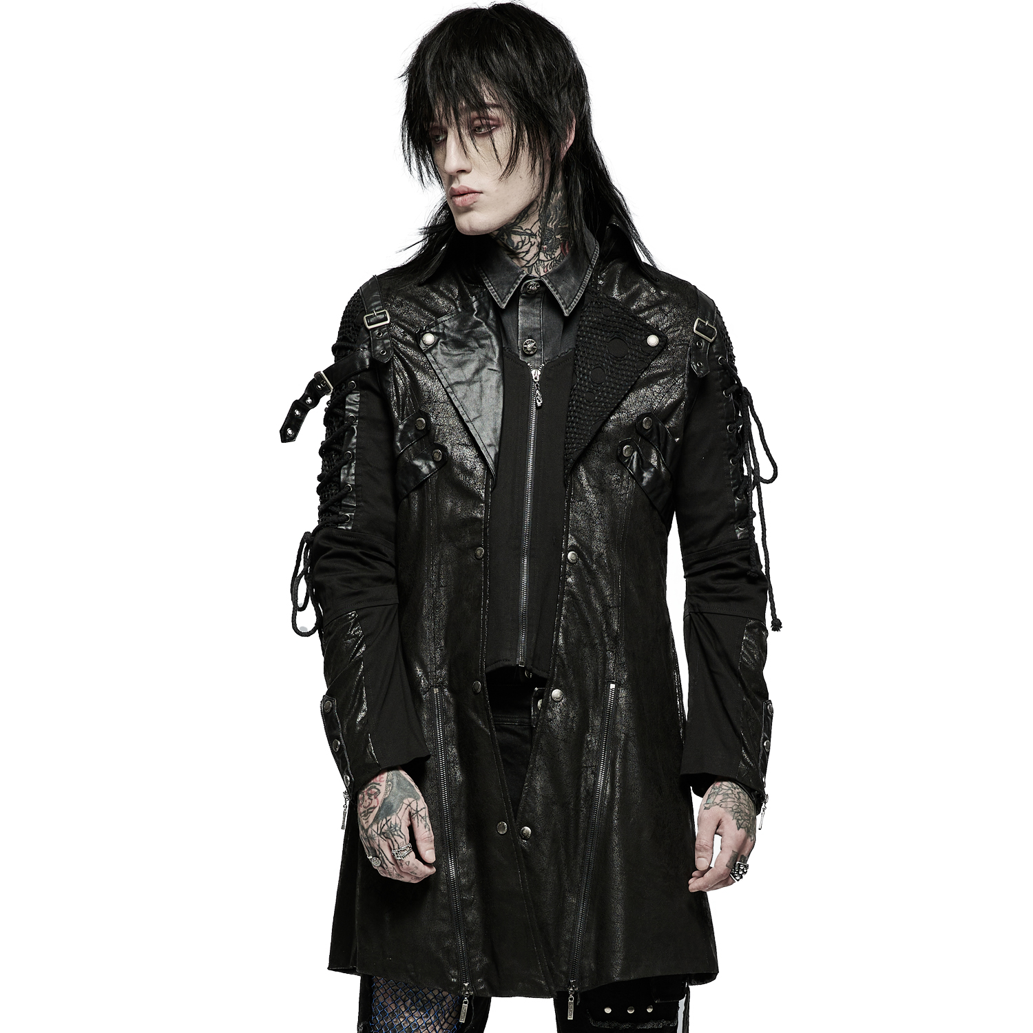 Gothic male's black jacket decorated with synthetic vegan leather details, mesh fabric, zippers, and studded eyelets.