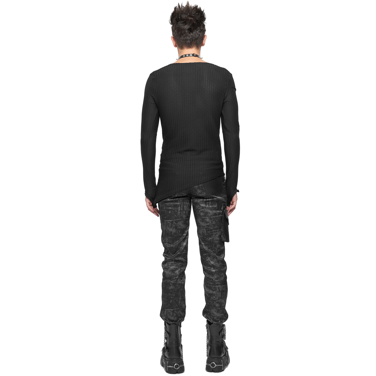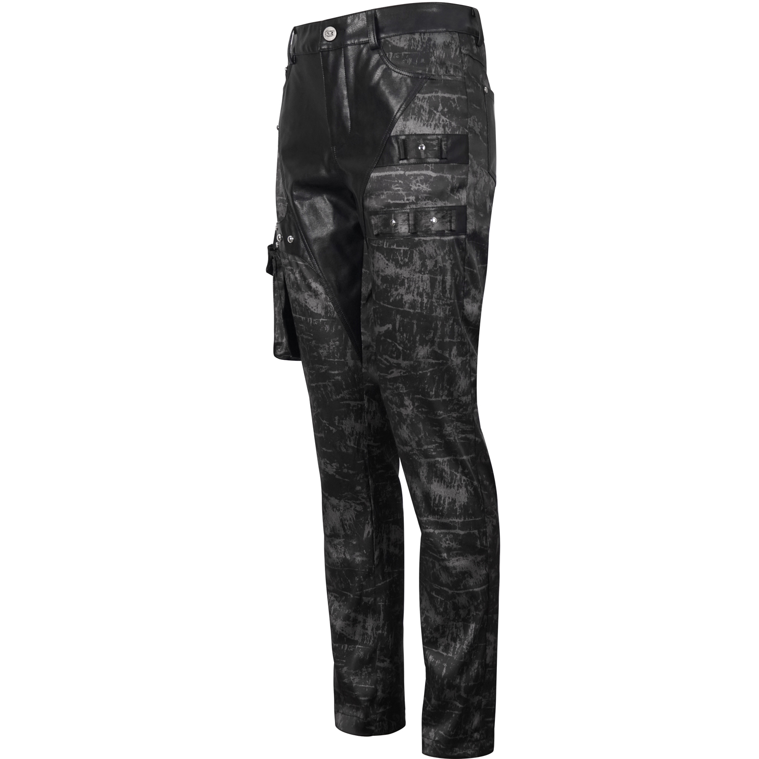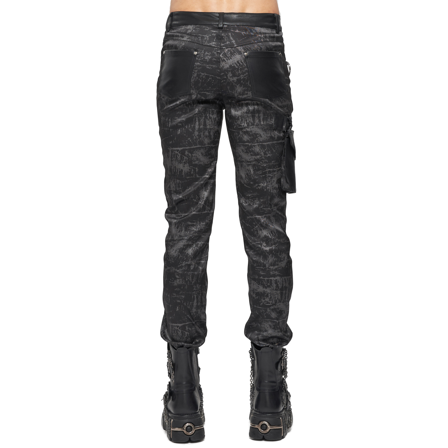 Gothic men's black trousers with stitching details, patches and zip features. • 5 pockets : 2 front, 2 back and 1 zipped channel flap pocket on the right thigh. • Front zip and skull button closure...