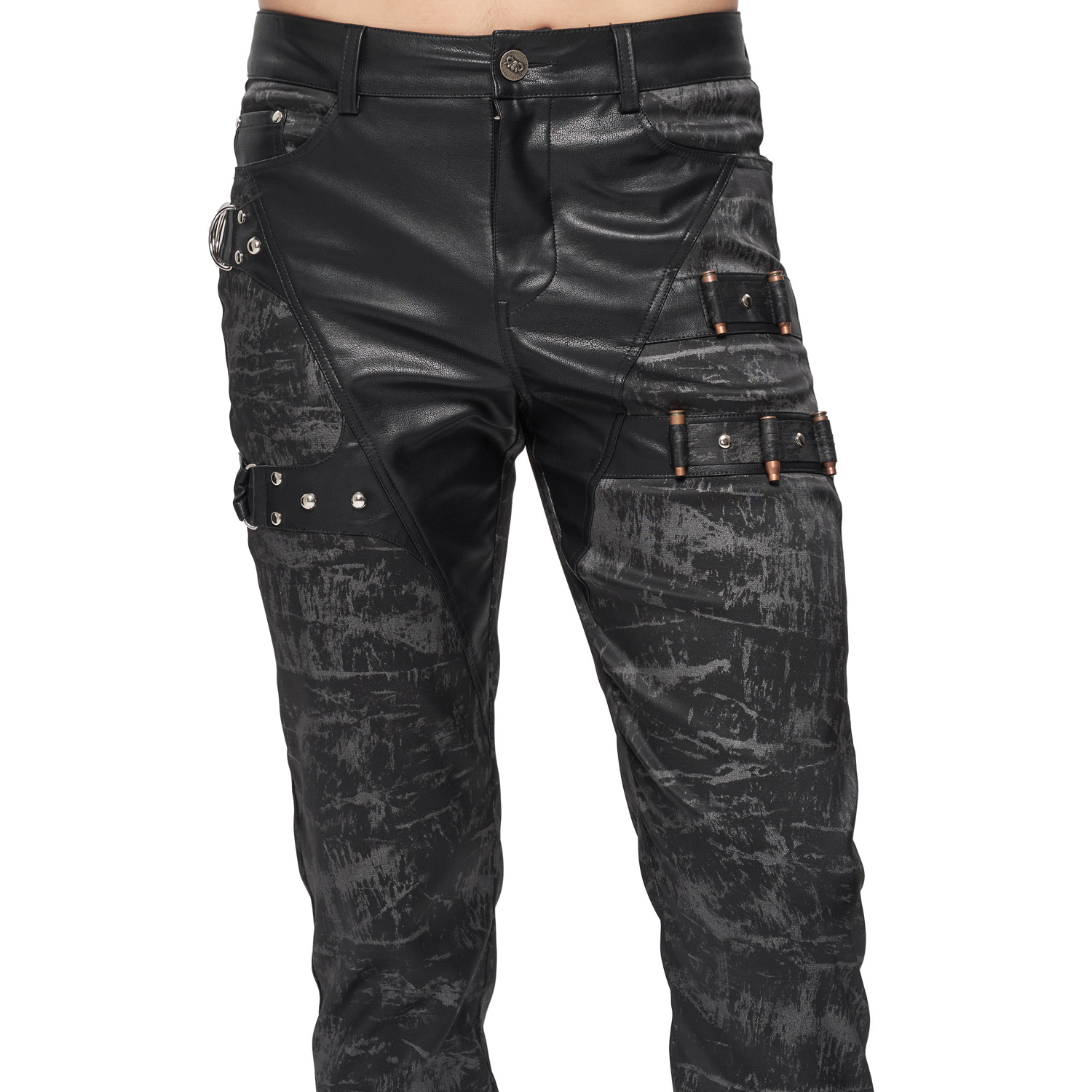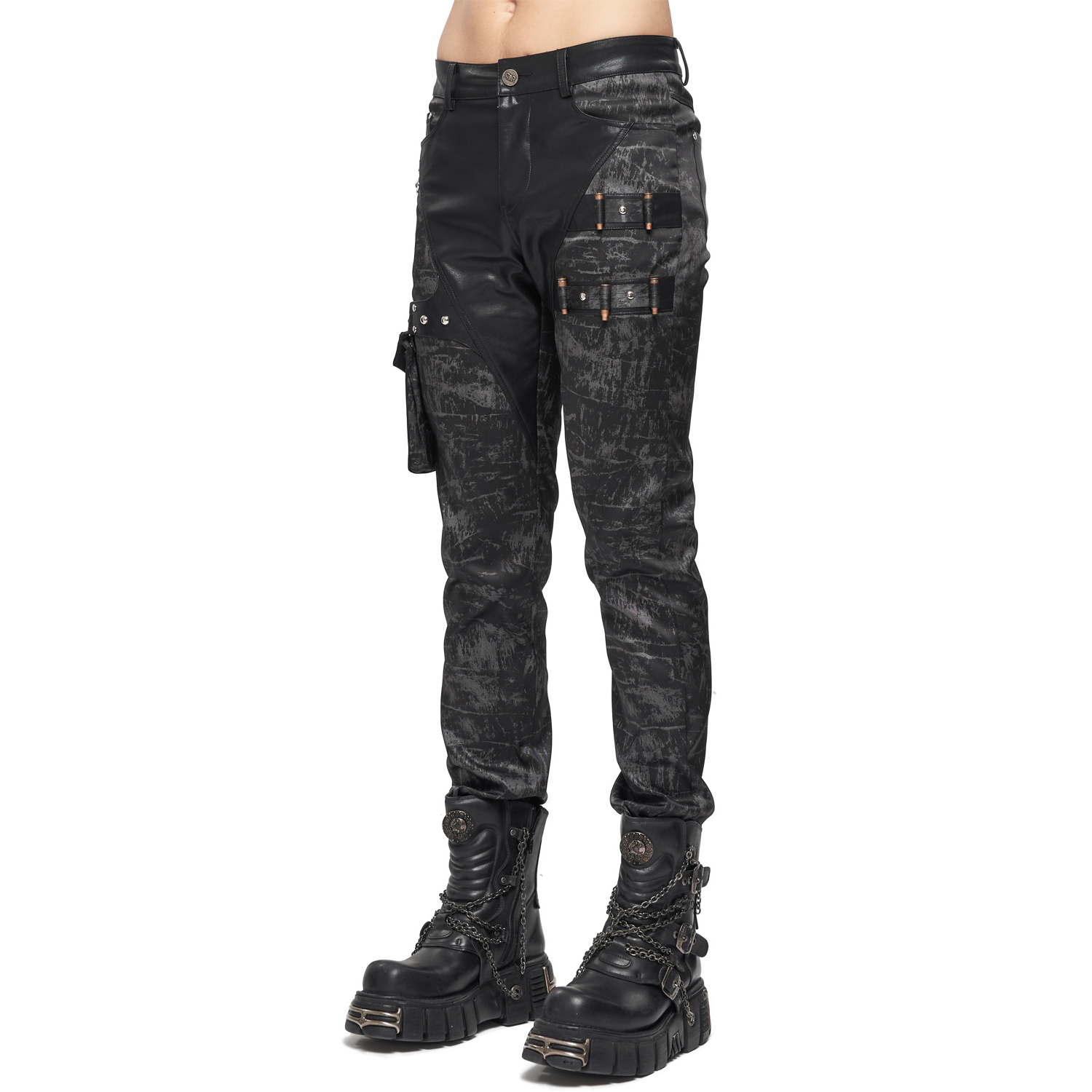 Men's post apocalyptic style denim pants. • Stretch cotton aged effect and jet black wash • Soft grained faux leather • Faux leather side panels at front and waist to hem • Metal rivets • Faux...