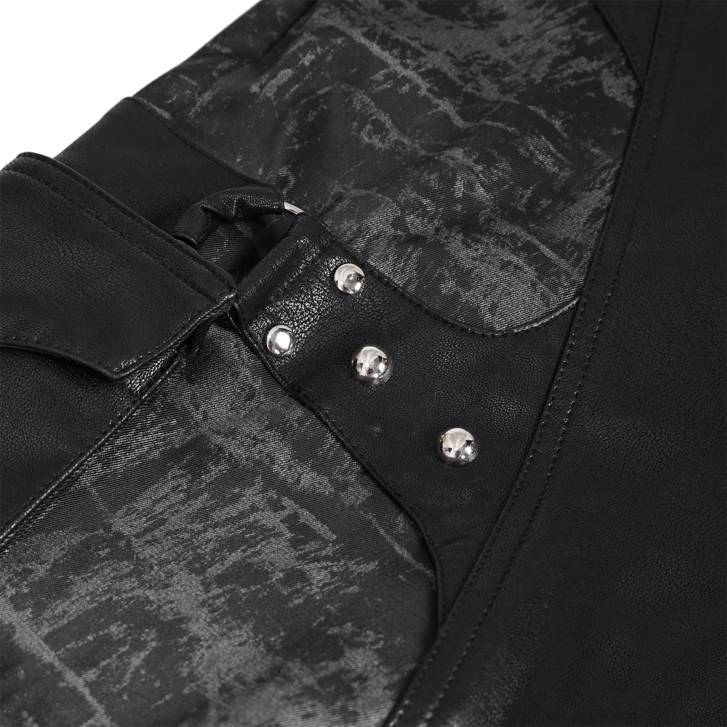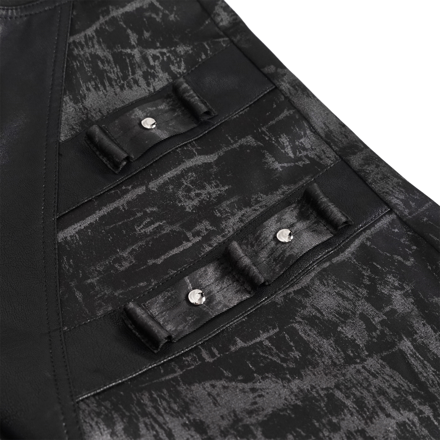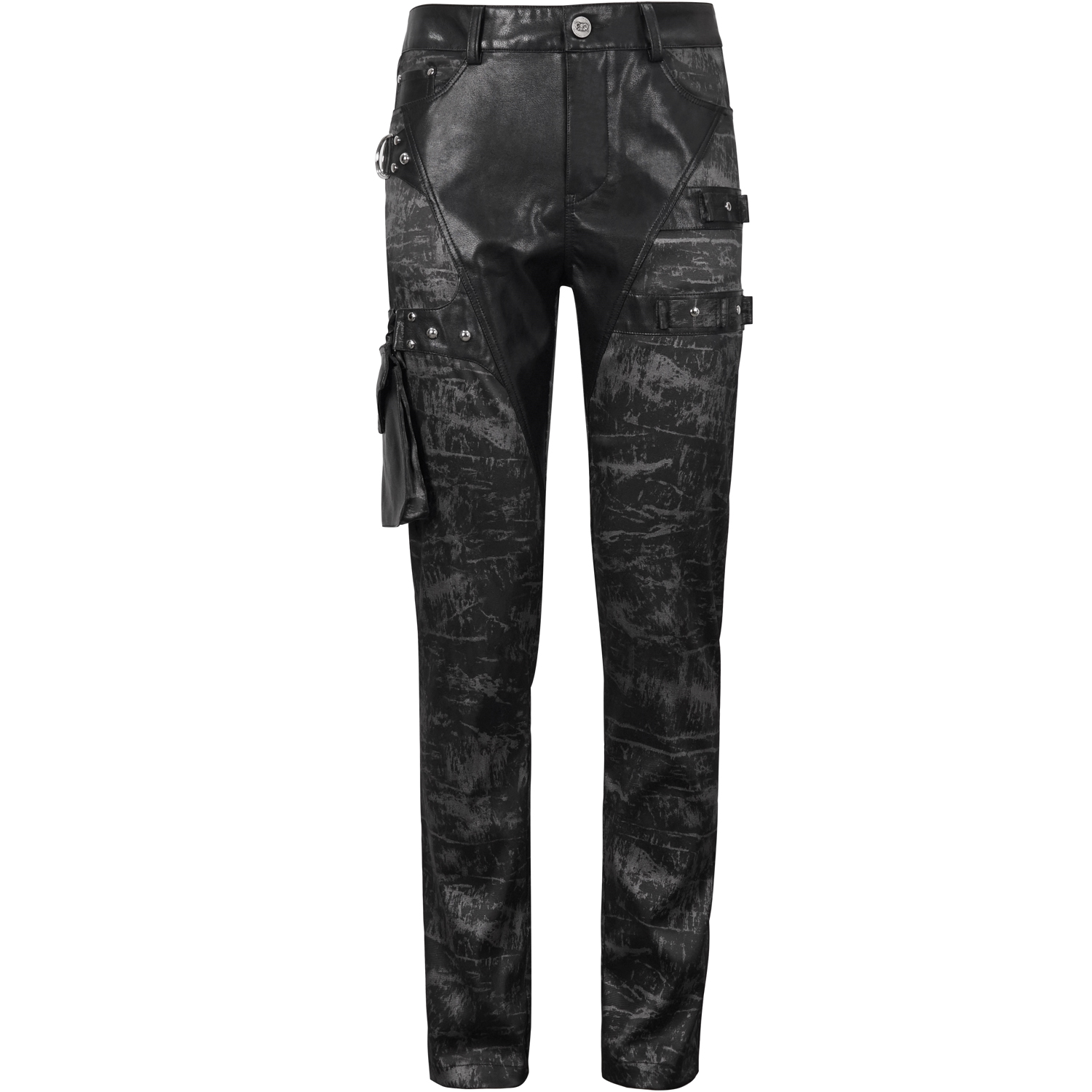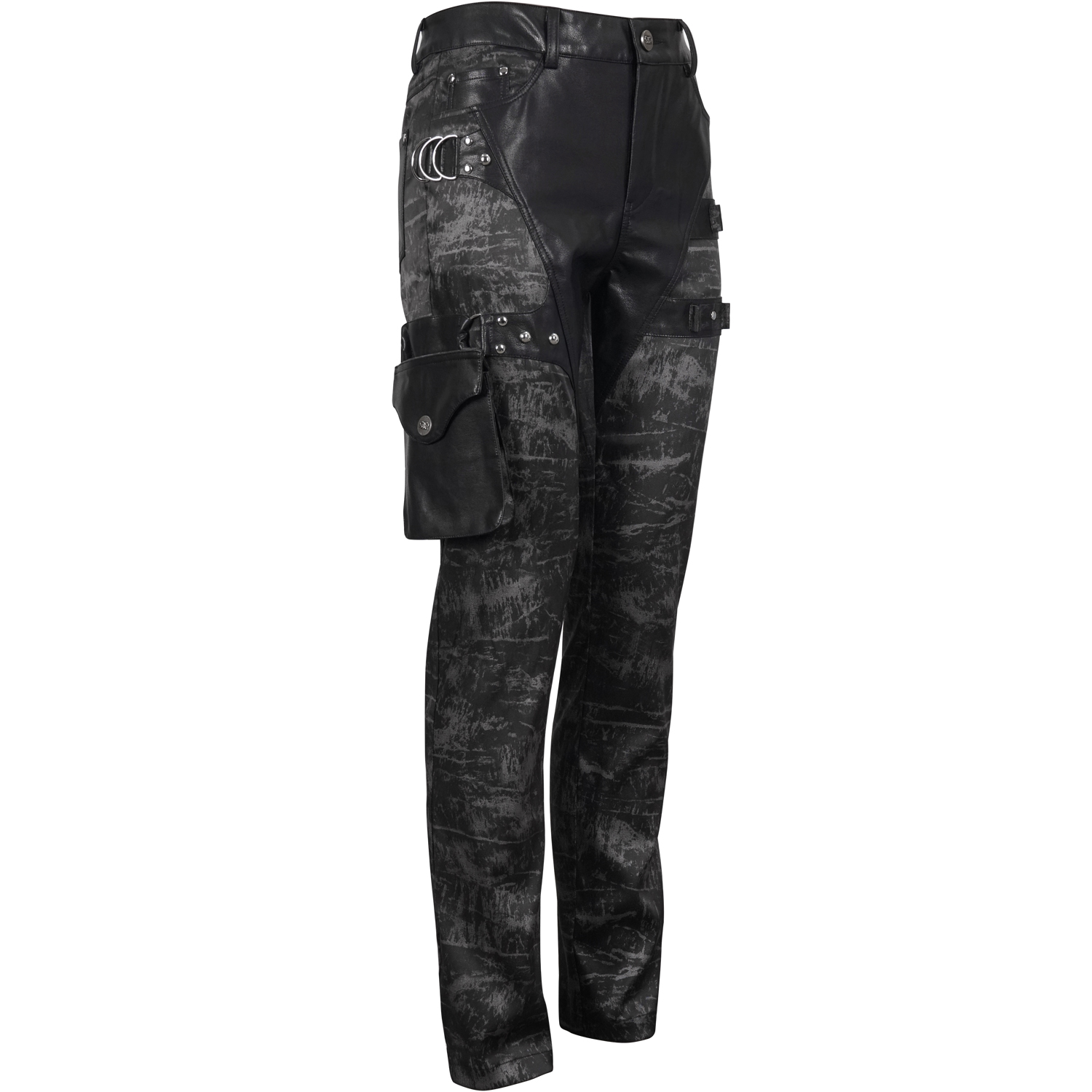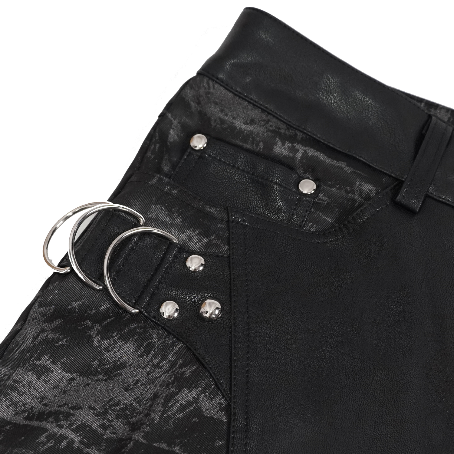 • Made from high-quality, elegant black fabric • Riveted O-rings on both thighs over two faux leather panels • Regular fit • Four pockets • Concealed zipper with a skull-shaped metal button •...