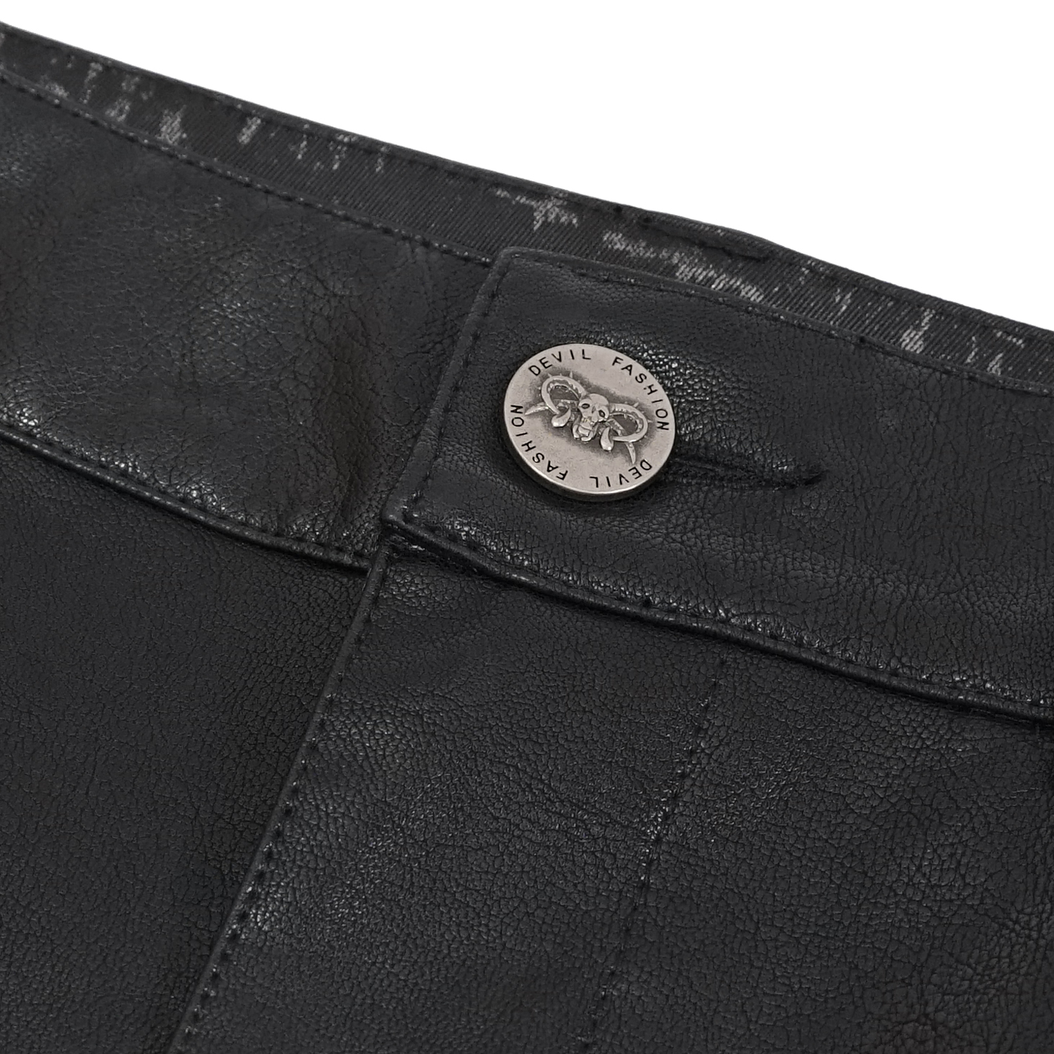 • Black faux leather, shiny finish • Zip fastening • Skull metal button • Four pockets, two of which are zipped on the front • Quilted inserts under the waistband and on the thighs • Straps...