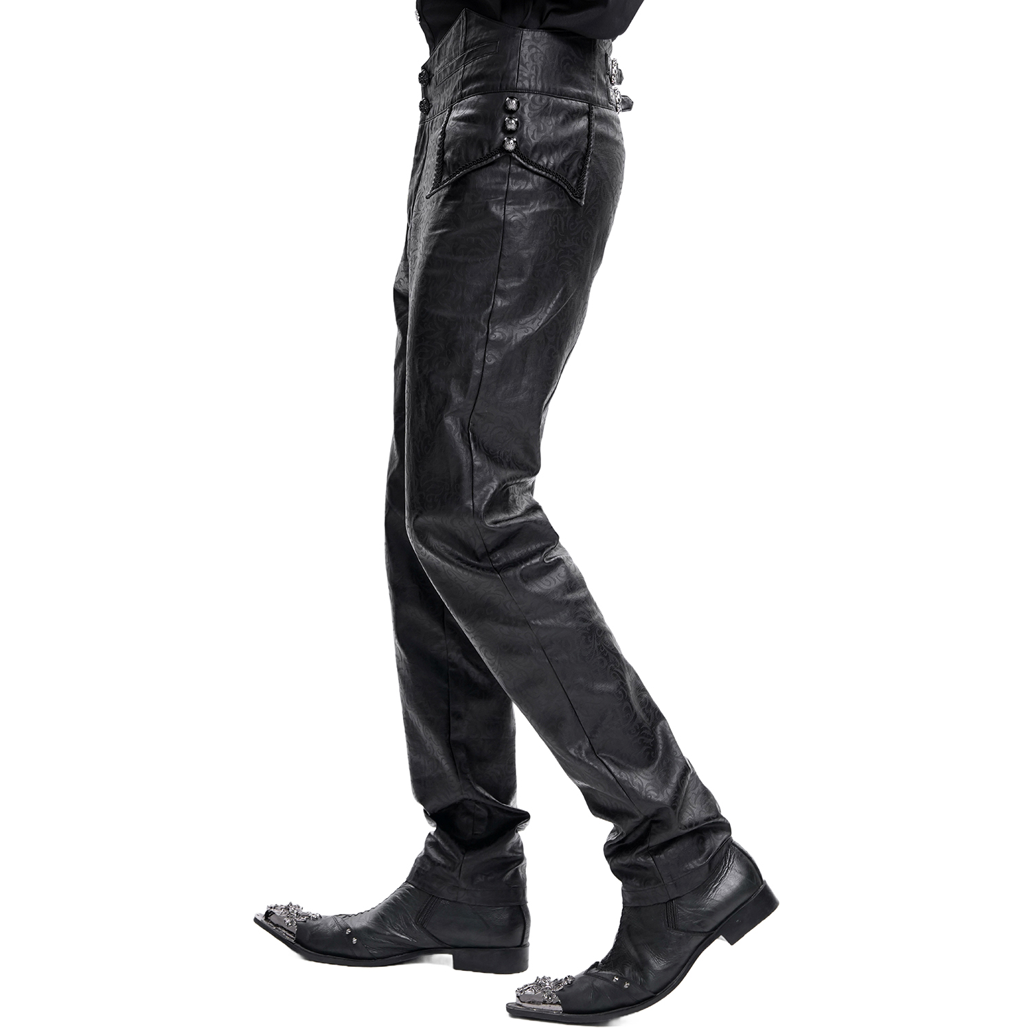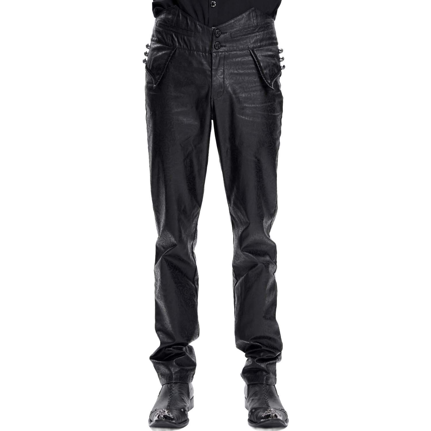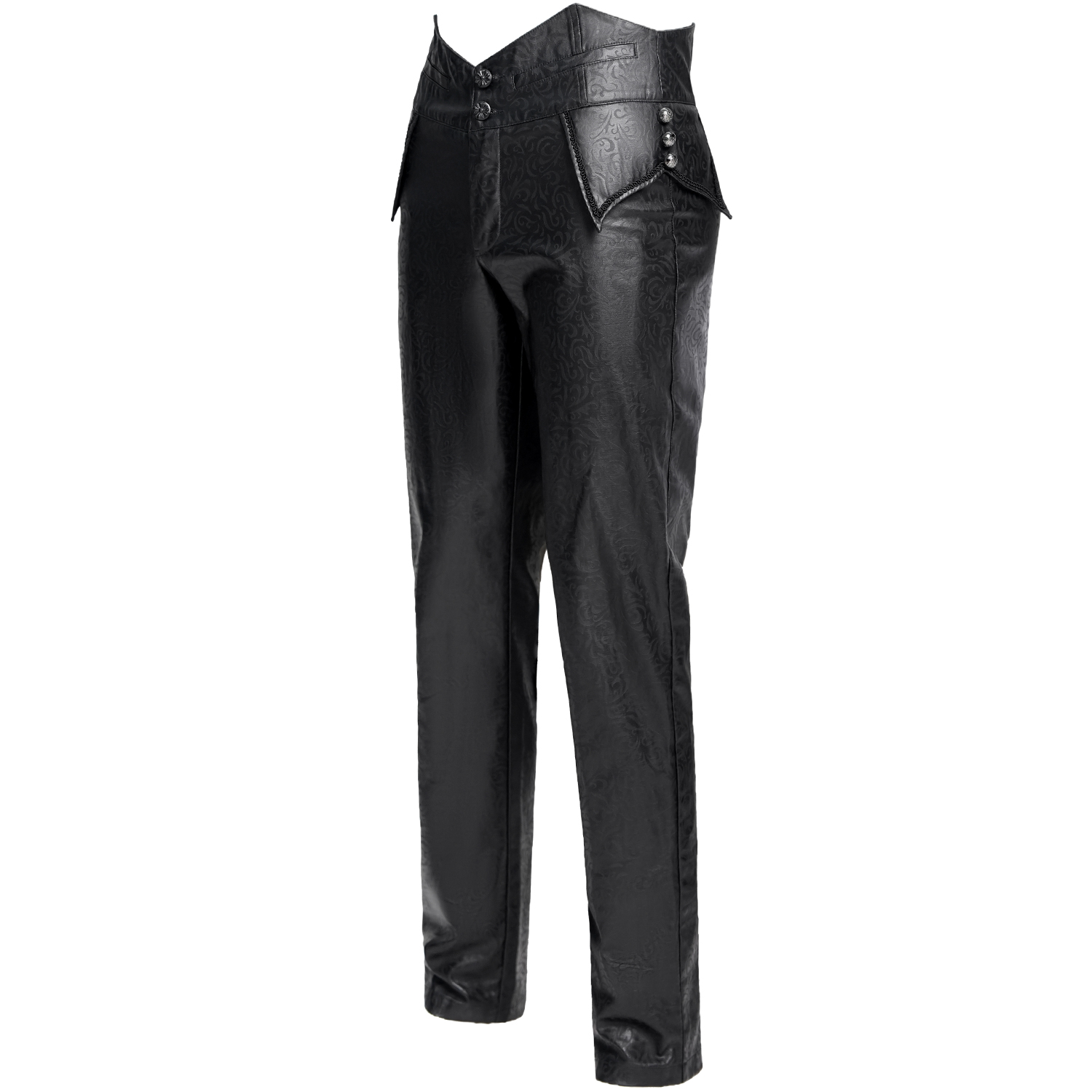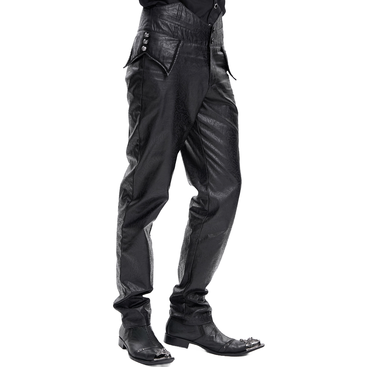 Gothic vampire style pants for men. • Black jacquard printed with floral patterns • Four pockets, two front and two behind • Metal zipper • Black lace belt • Embroidered front pockets on...