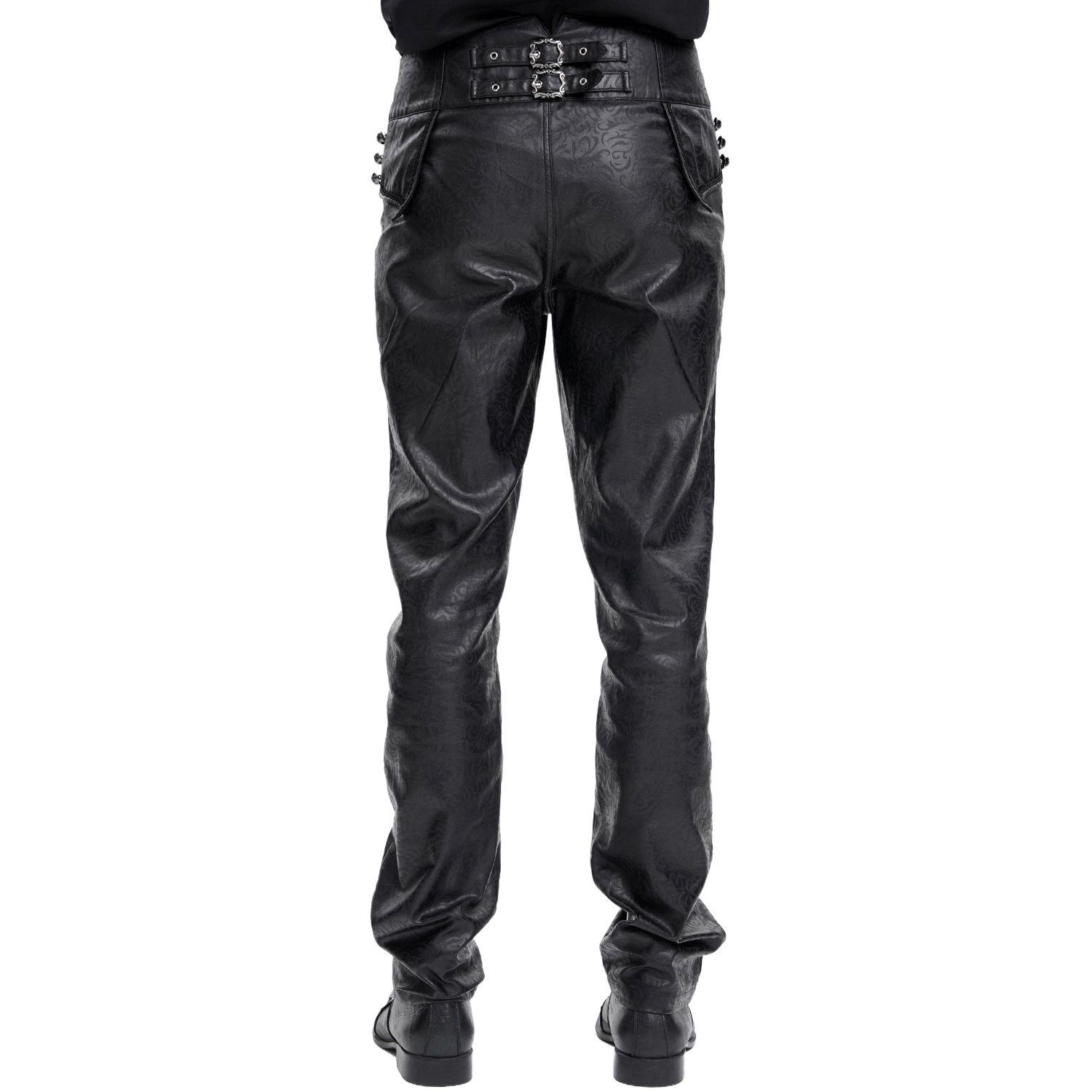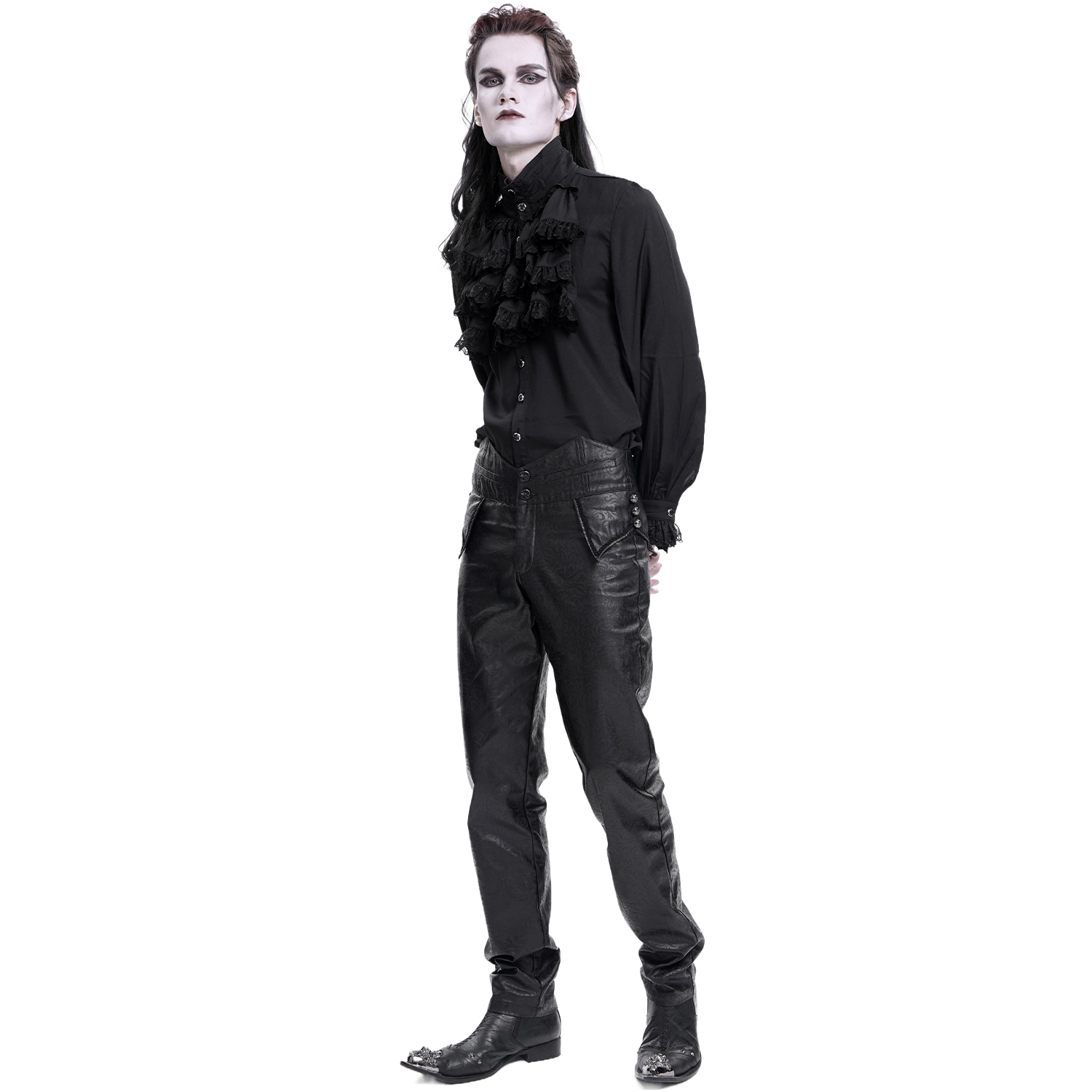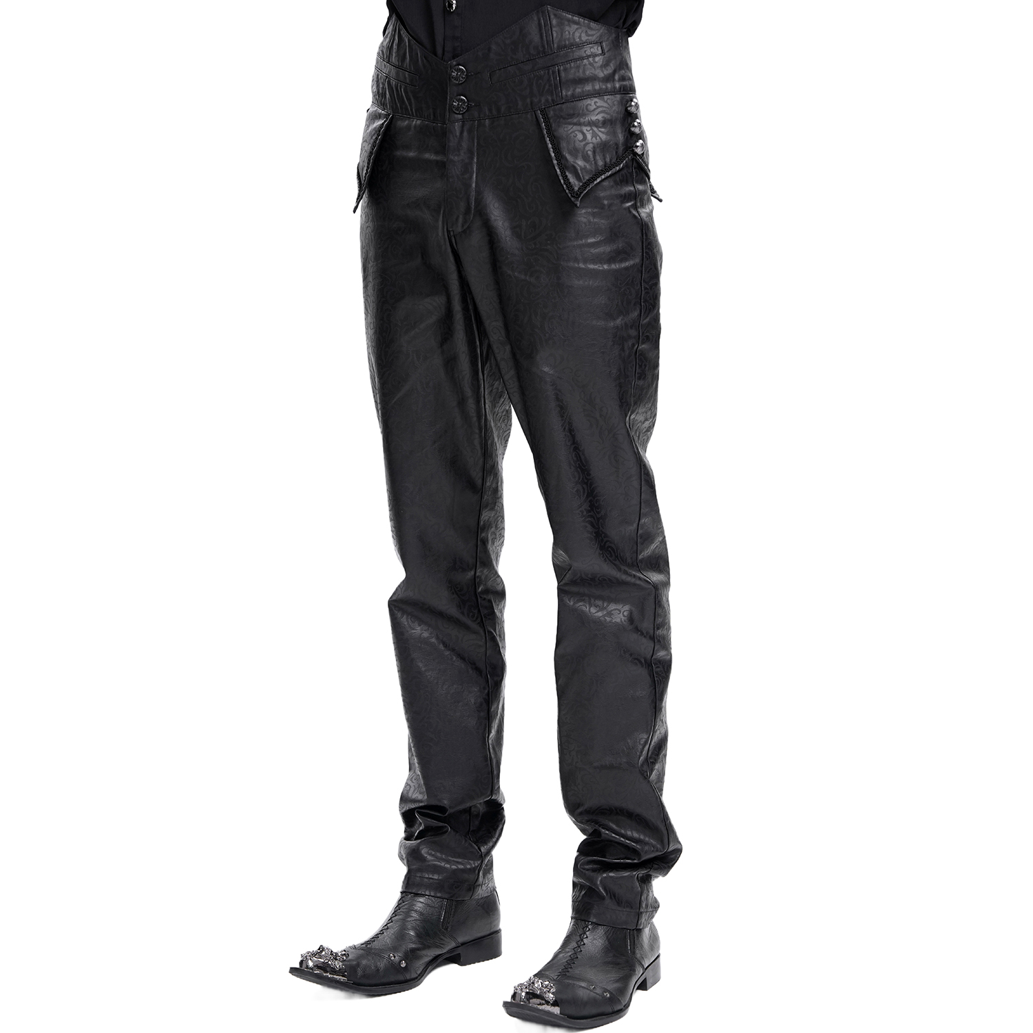 Gothic vampire style pants for men. • Black jacquard printed with floral patterns • Four pockets, two front and two behind • Metal zipper • Black lace belt • Embroidered front pockets on...