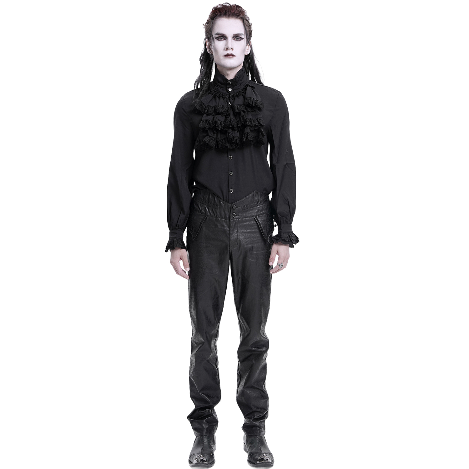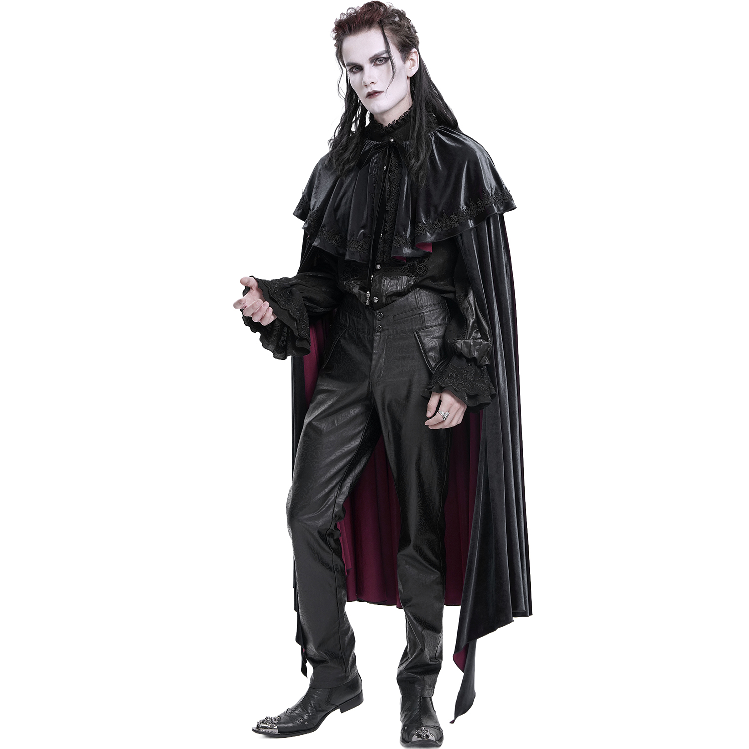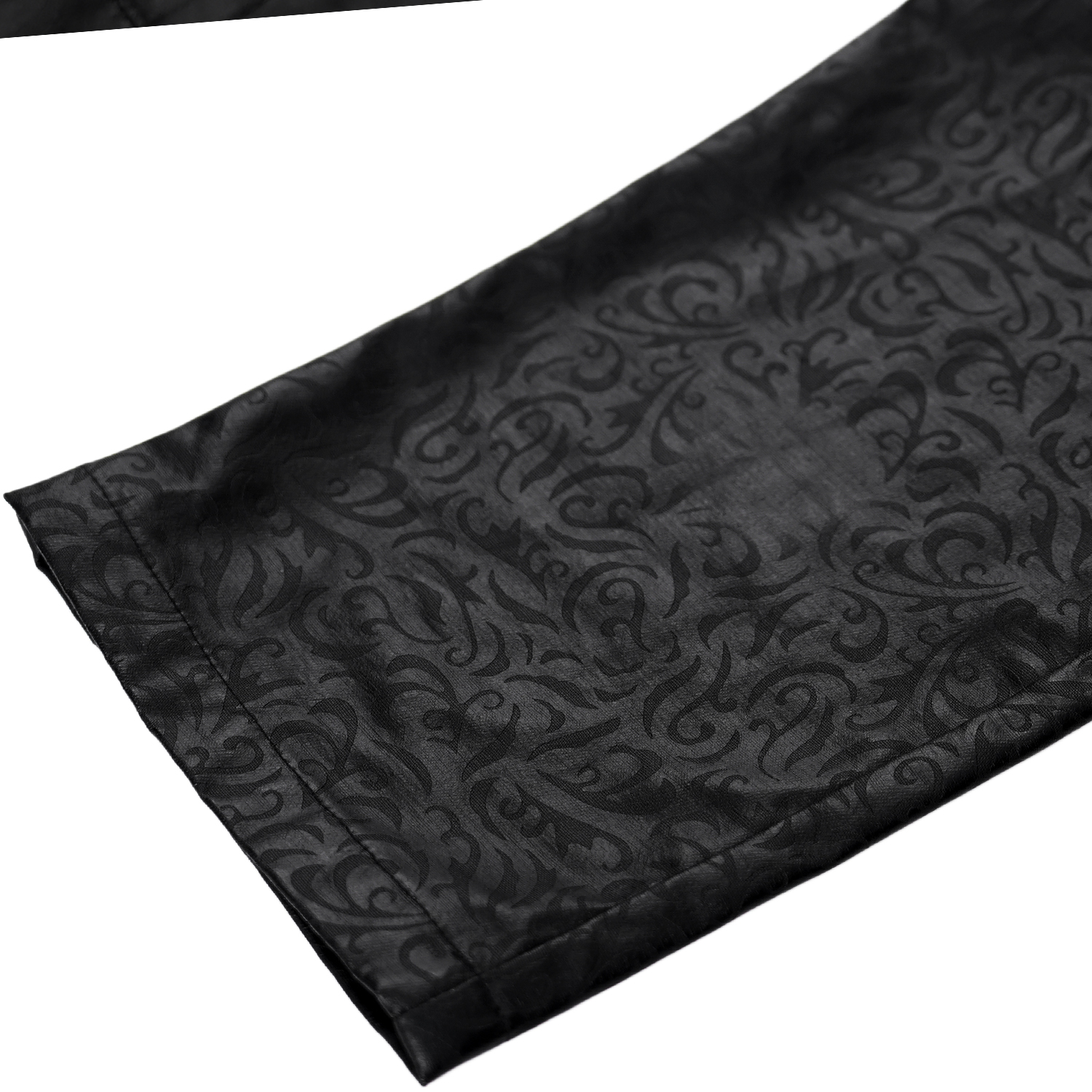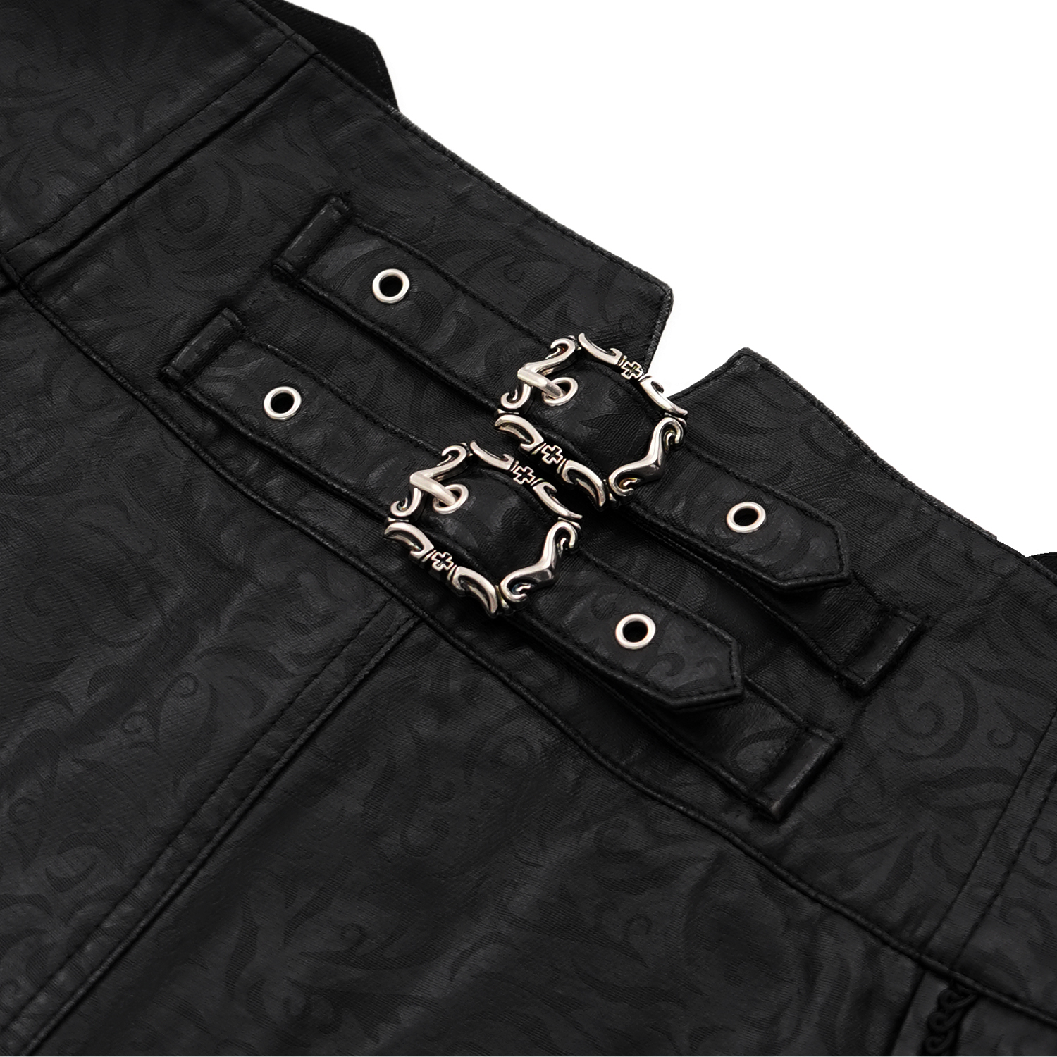 Gothic vampire style pants for men. • Black jacquard printed with floral patterns • Four pockets, two front and two behind • Metal zipper • Black lace belt • Embroidered front pockets on...