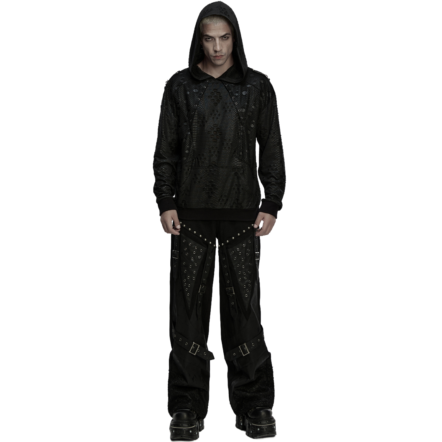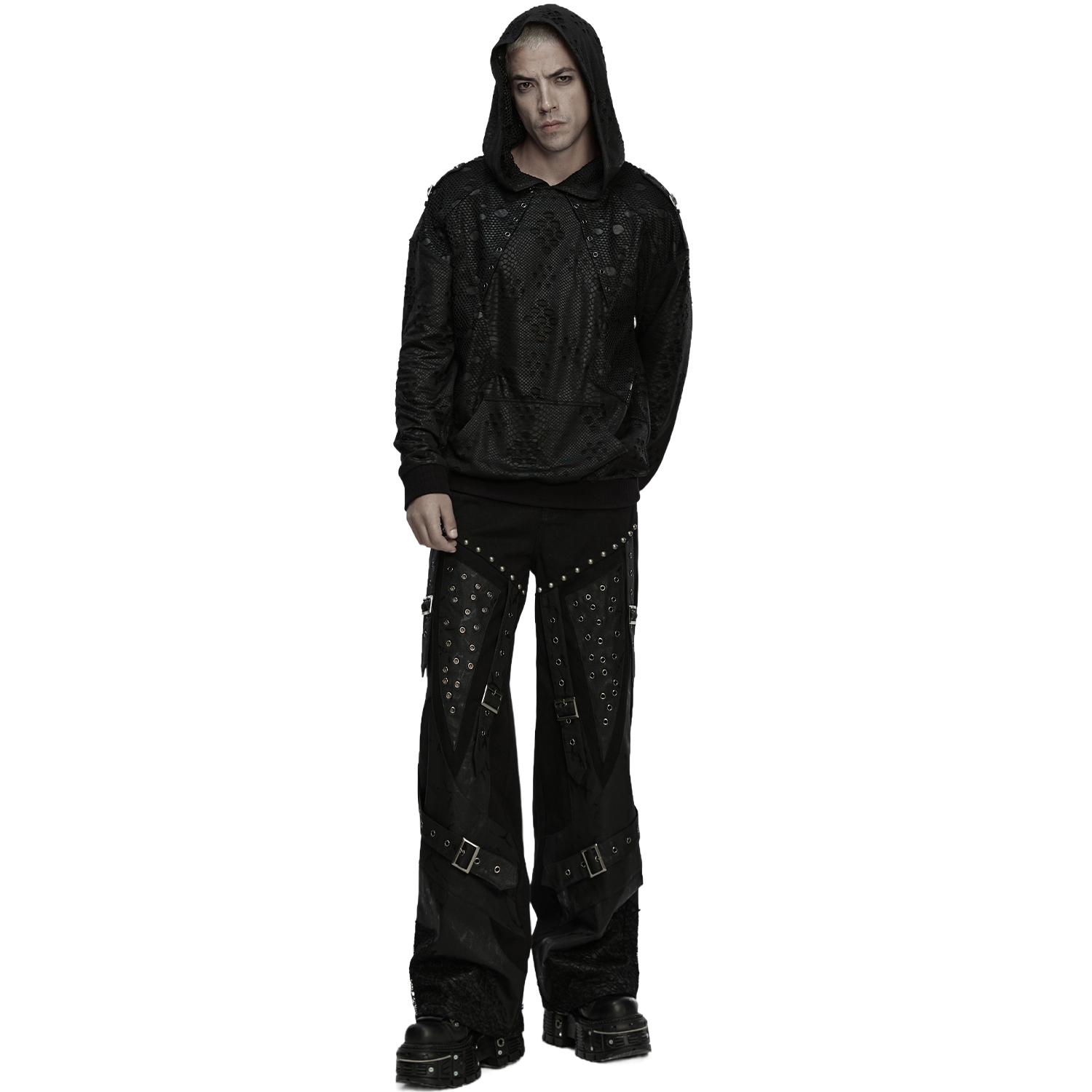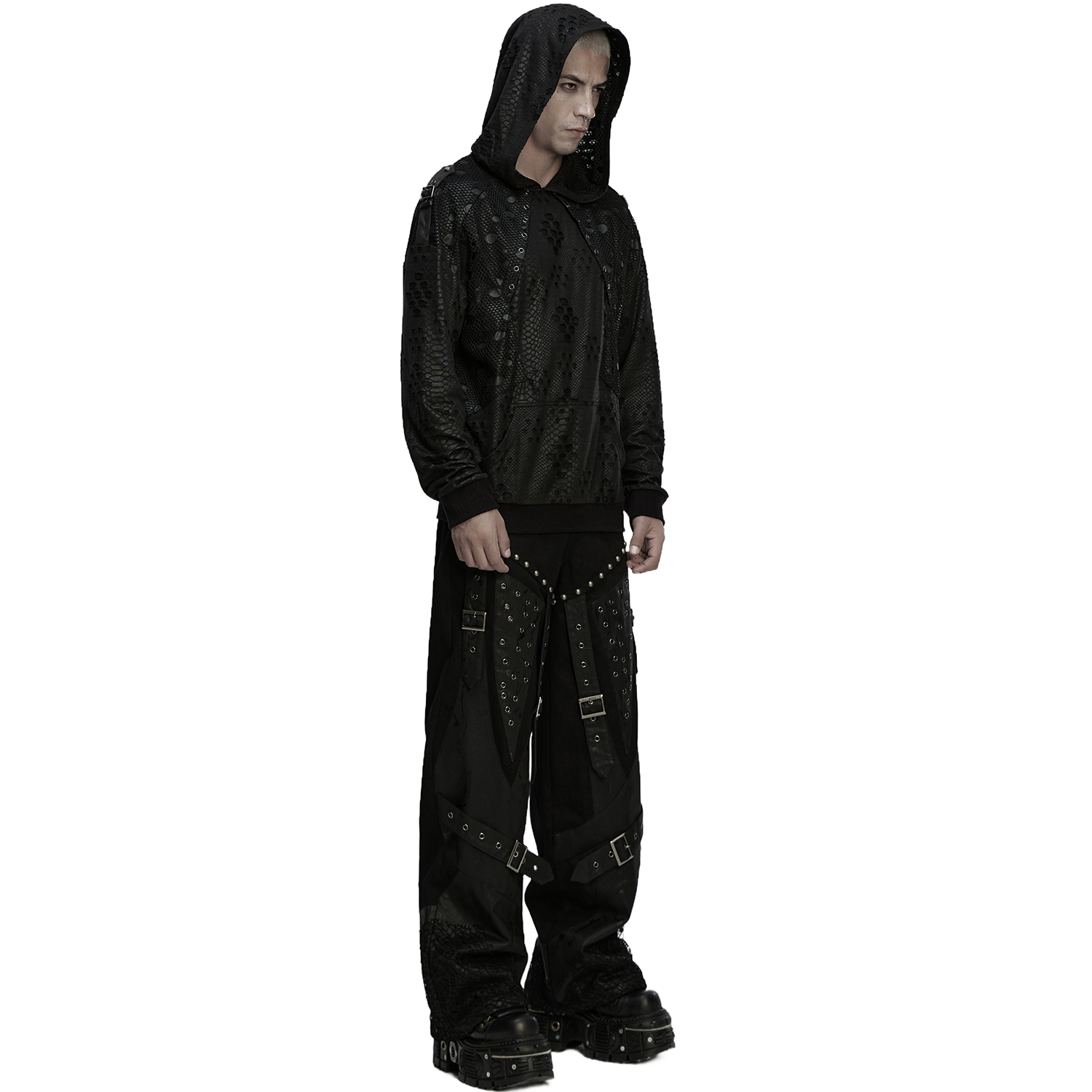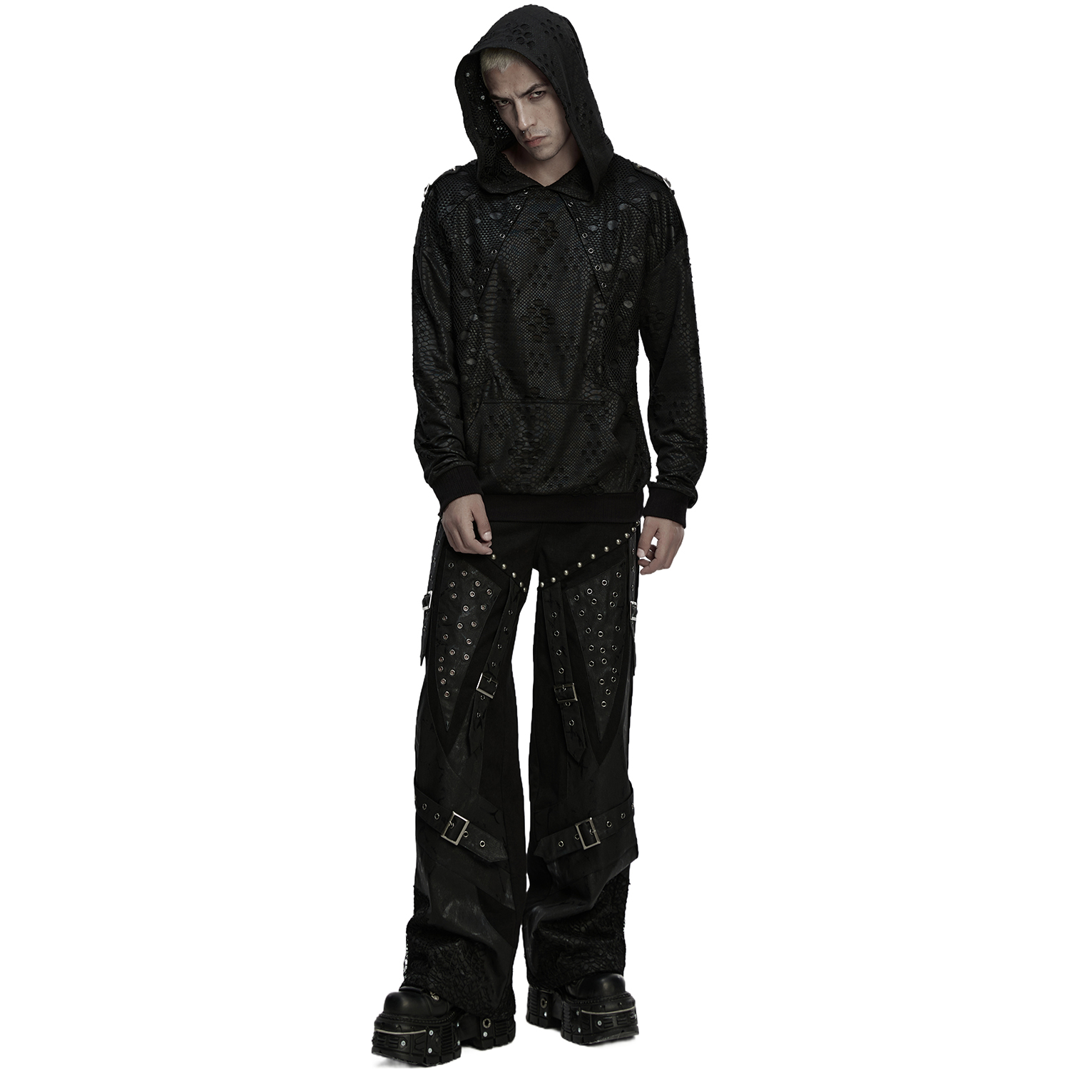• Made from high-quality black stretch twill • Frayed holes on the front • Three straps with adjustable buckles on the right leg • Decorative zipper with a skeleton hand puller on the right hip •...