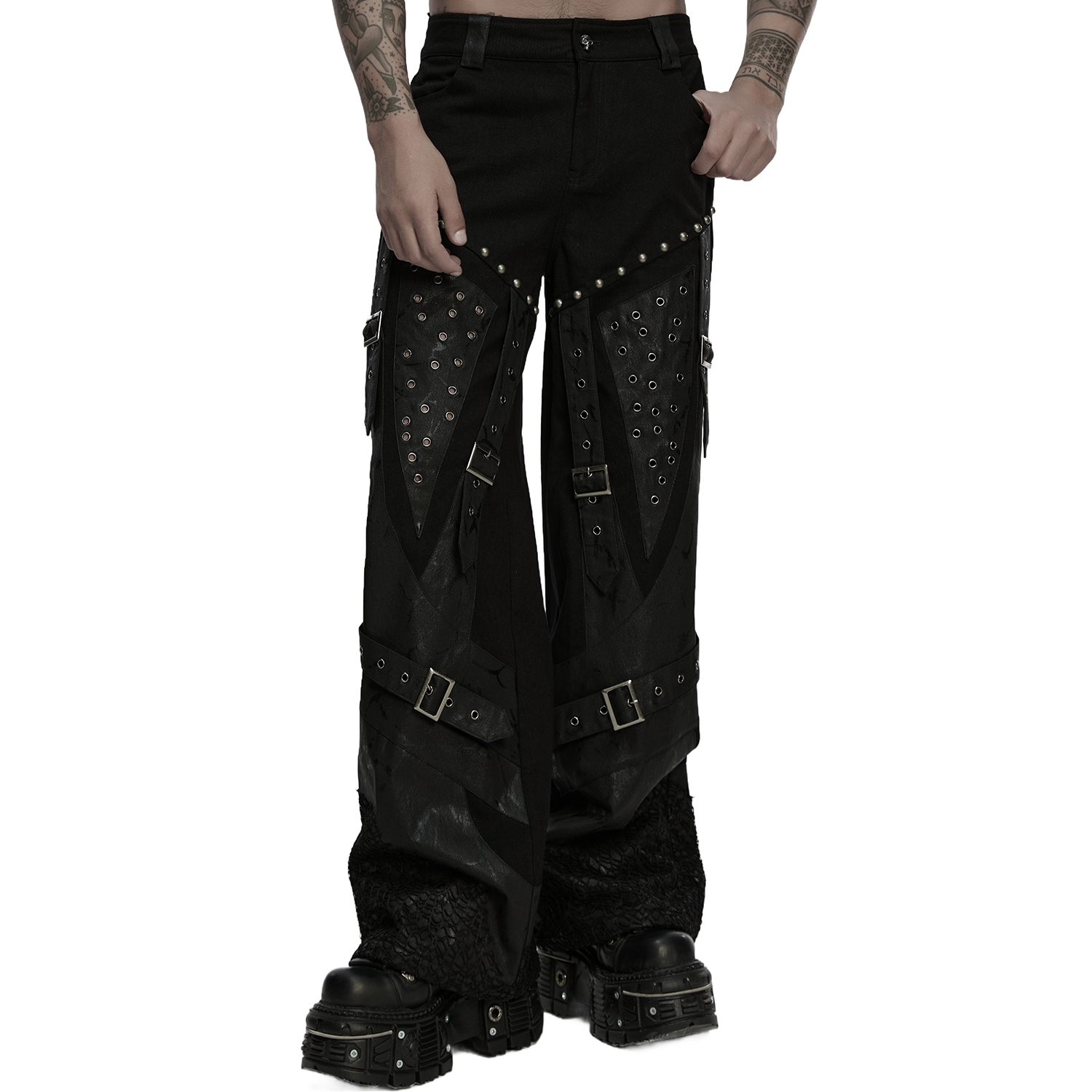Gothic/Punk style pants with large pocket on the right side. • Large pocket with spikes and metal skull attached by two carabiners and a strap all around the right thigh • Two decorative zippers on...