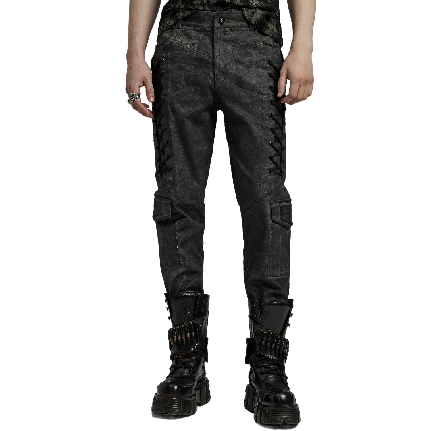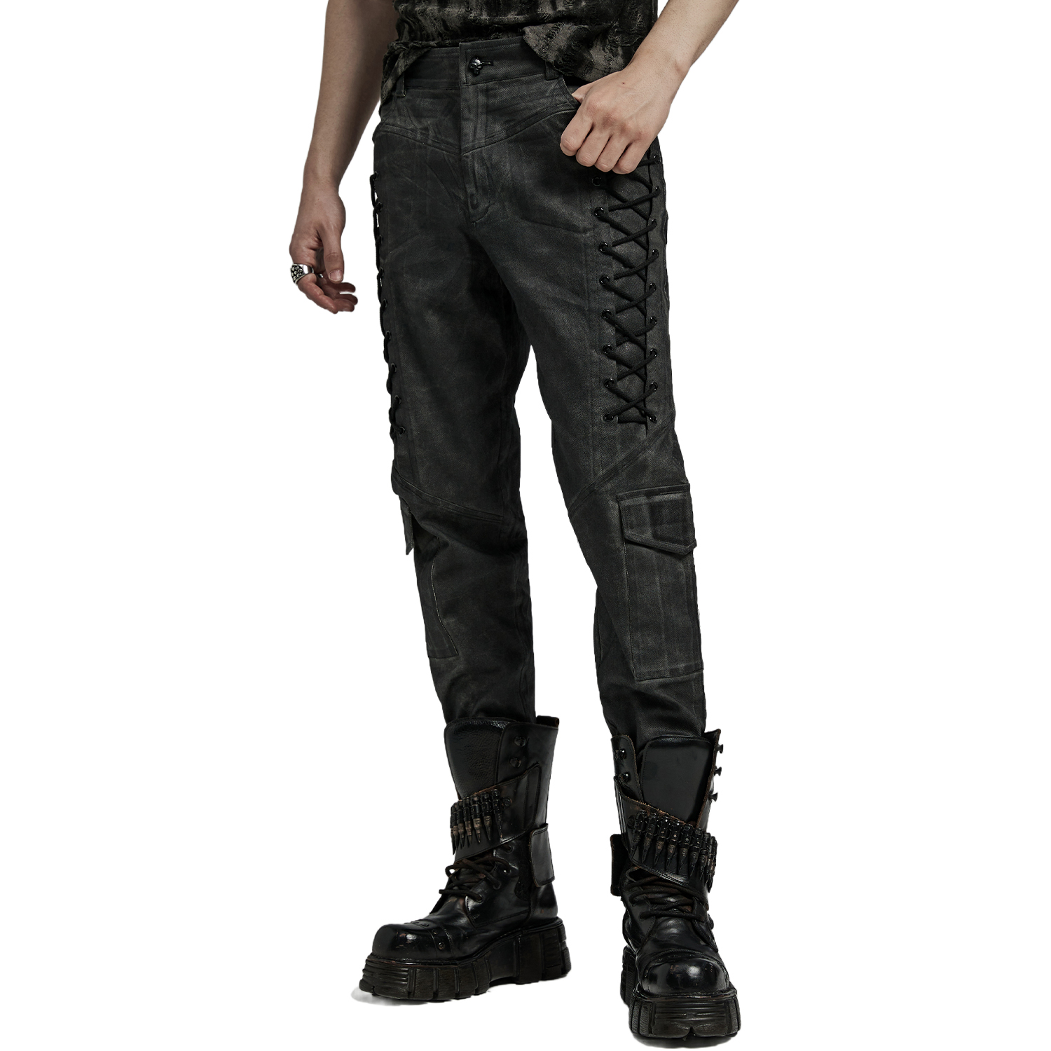 Gothic vampire style pants for men. • Black jacquard printed with floral patterns • Four pockets, two front and two behind • Metal zipper • Black lace belt • Embroidered front pockets on...