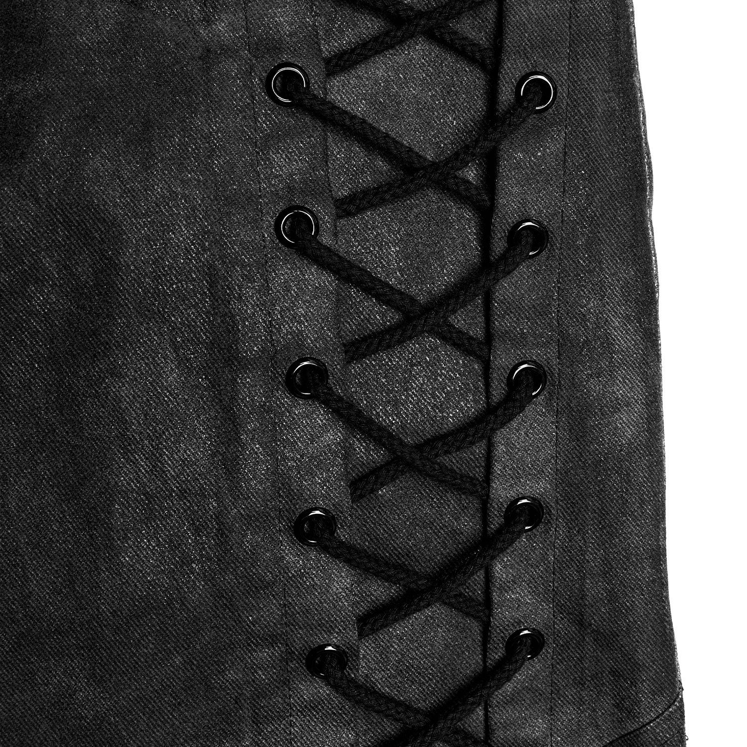 • Twill with an aged pattern • Raw edges on the thighs • Adjustment eyelets and laces • Hand painted upper part • Cut-out lower part • 95% Cotton, 5% Spandex By Devil Fashion SIZES CHART IN...