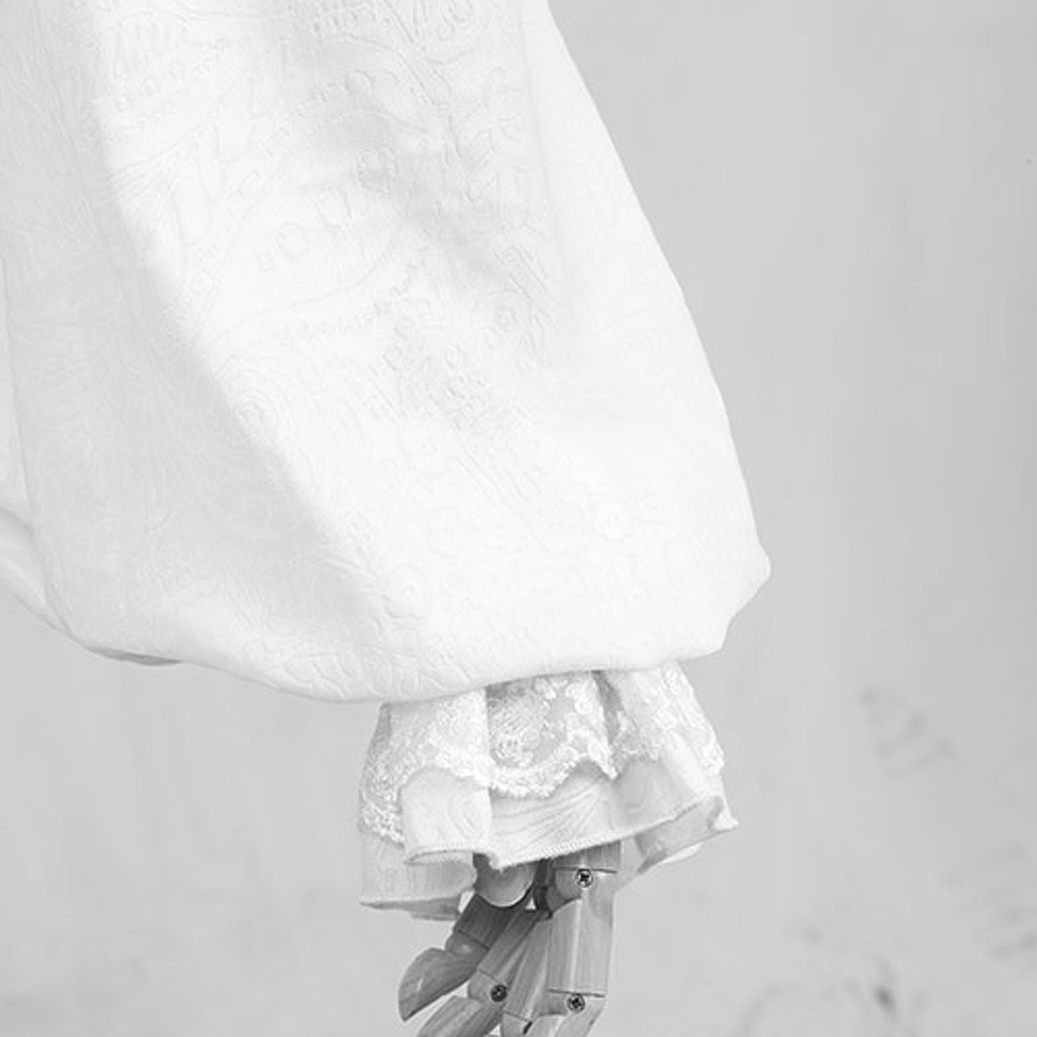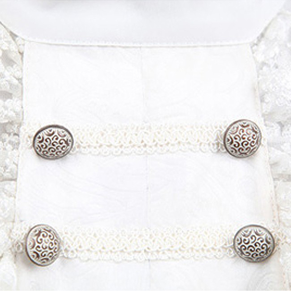 • In white jacquard • High ruffled neckline • Ruffles and delicate lace on the chest • Detachable chains with crosses, pearls, and black stones • Engraved metal buttons • Puffed sleeves •...