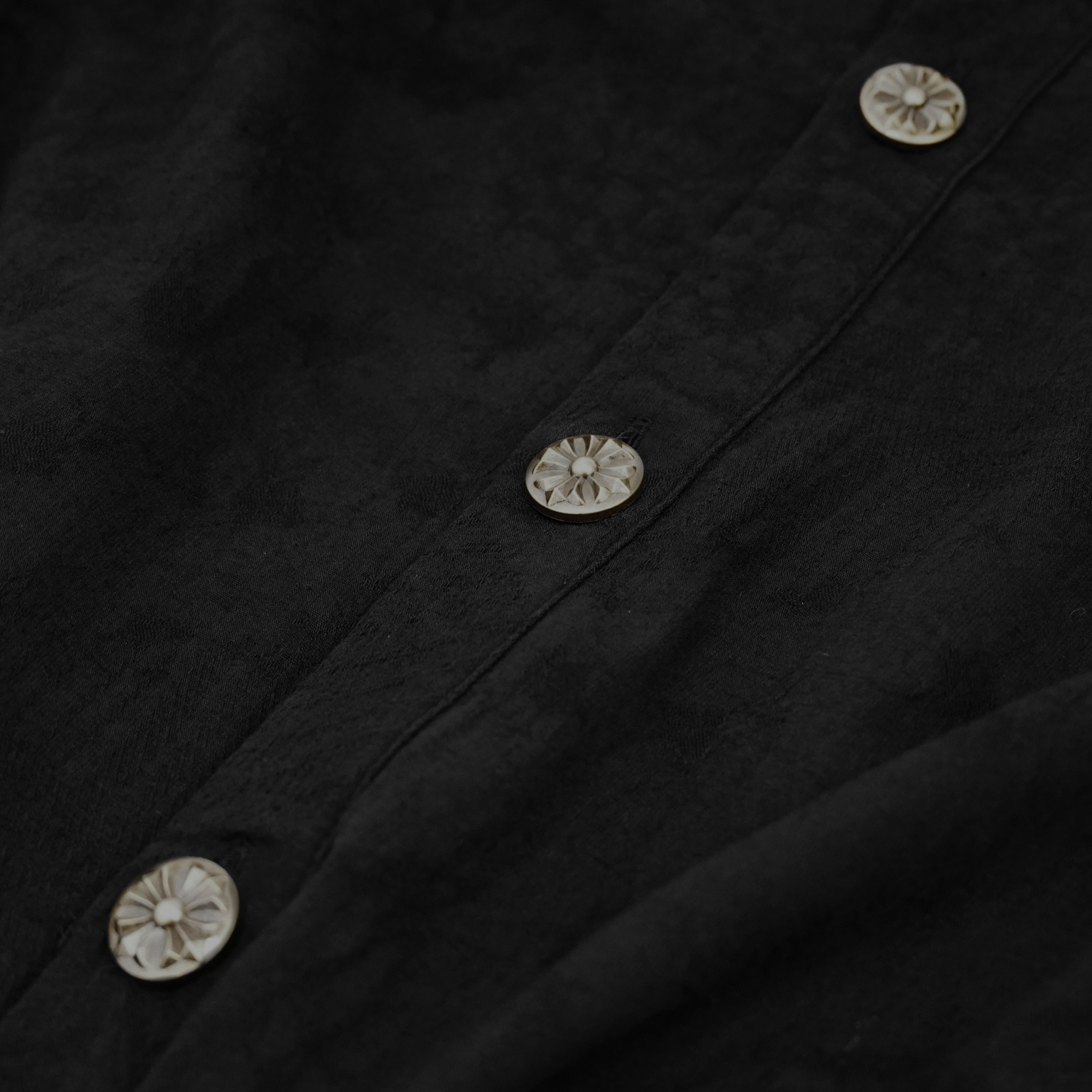 • In black Paisley jacquard, matched with black lace with black rose pattern. • Removable jabot in black three-dimensional lace with black pearls all around the neck • Large black brooch also...