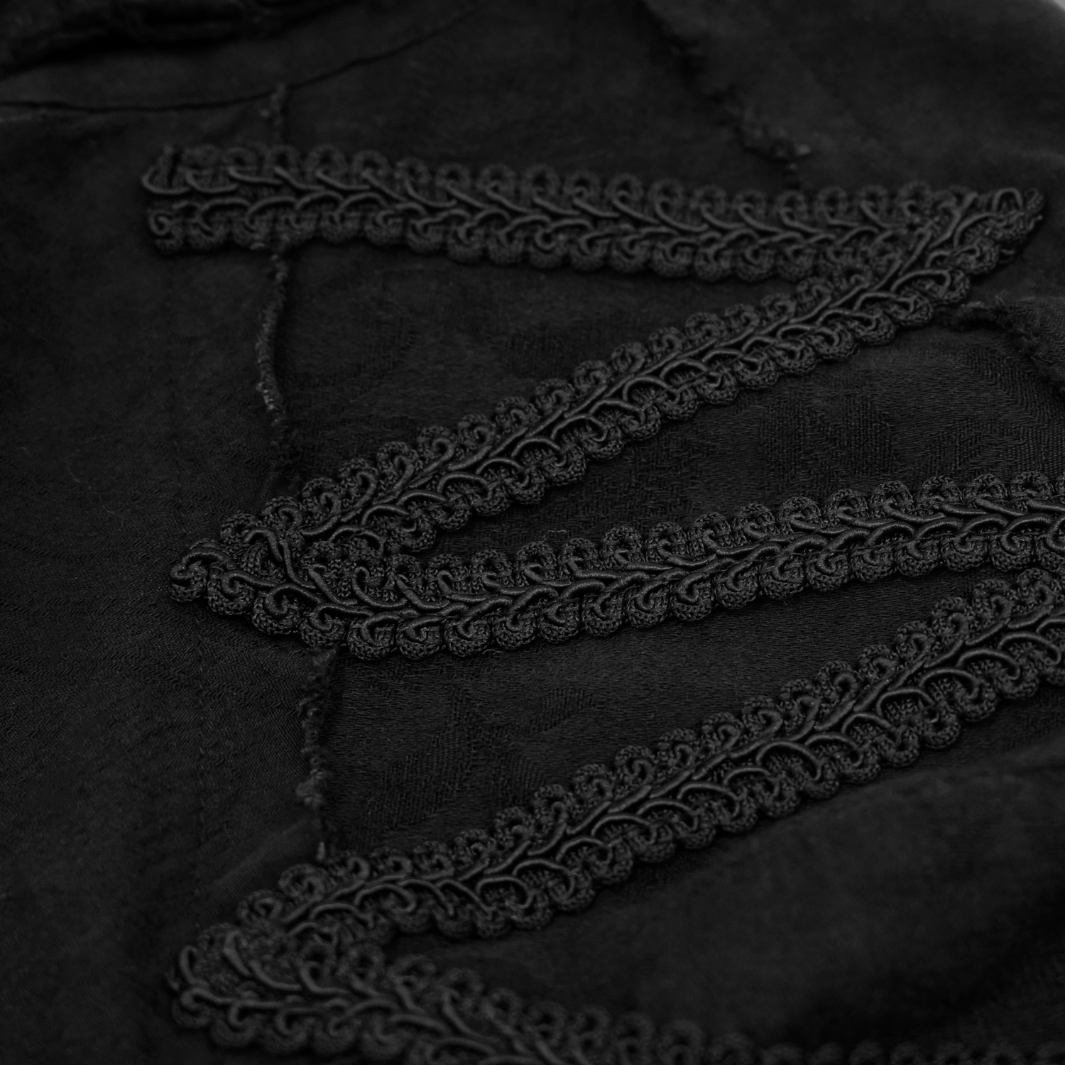 • Front pleated design with black coffin-shaped embroidery • Hand-embroidered gothic floral braid on the side • Front closure with engraved buttons • Black lace ruffled sleeves and collar •...