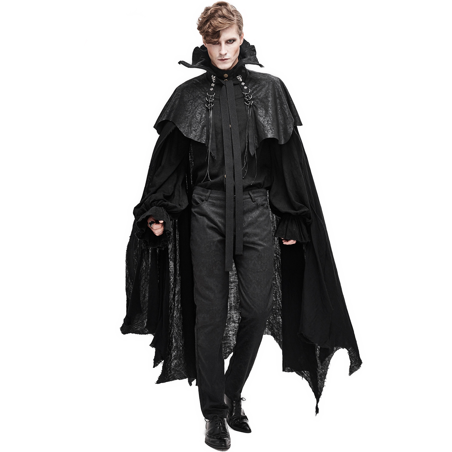 • Long gothic cape in faux linen • Large stand-up collar with metal frame • Frayed hem • Soft printed fabric shoulder pads with an aged nubuck look • Fastens with a tie at the front • Large skull...