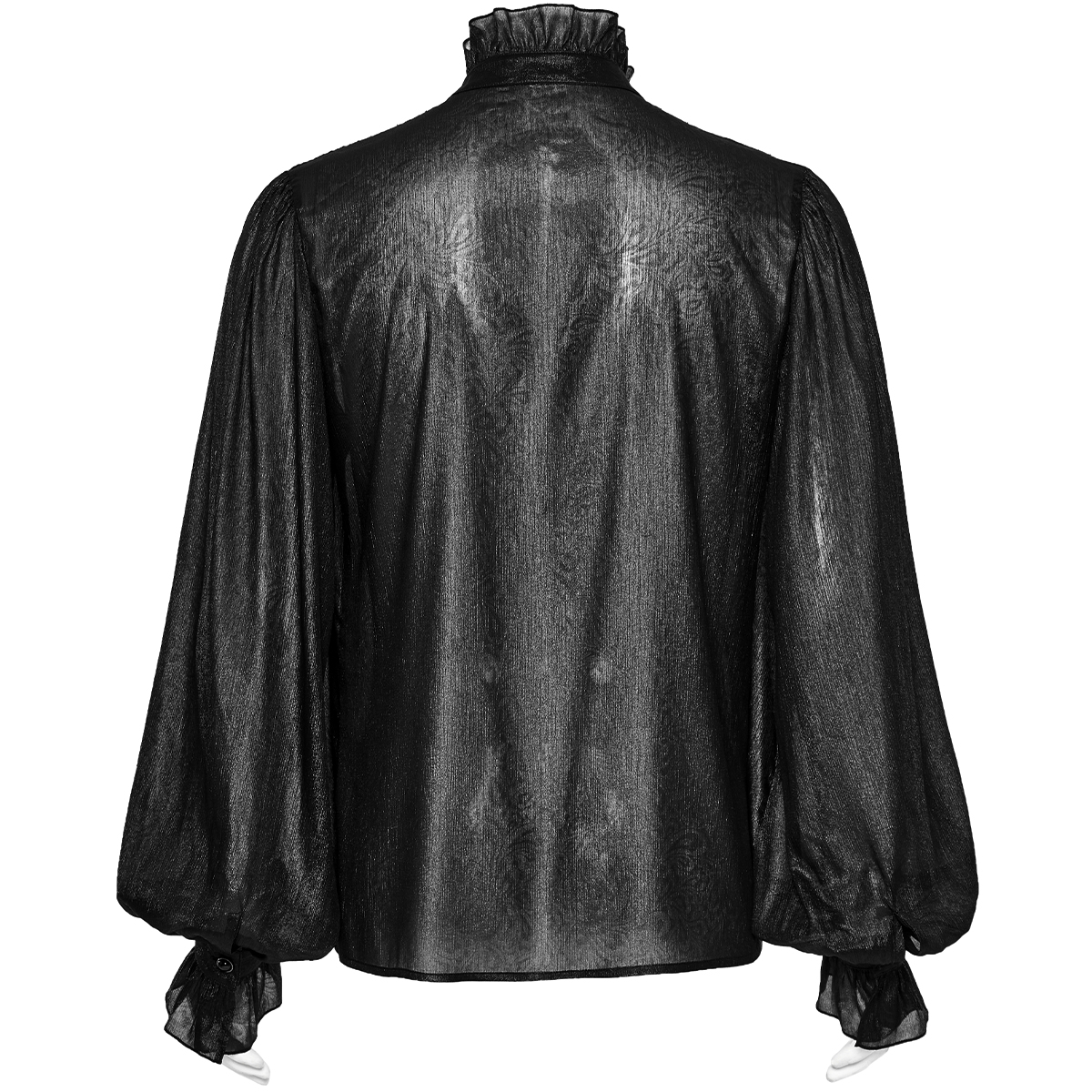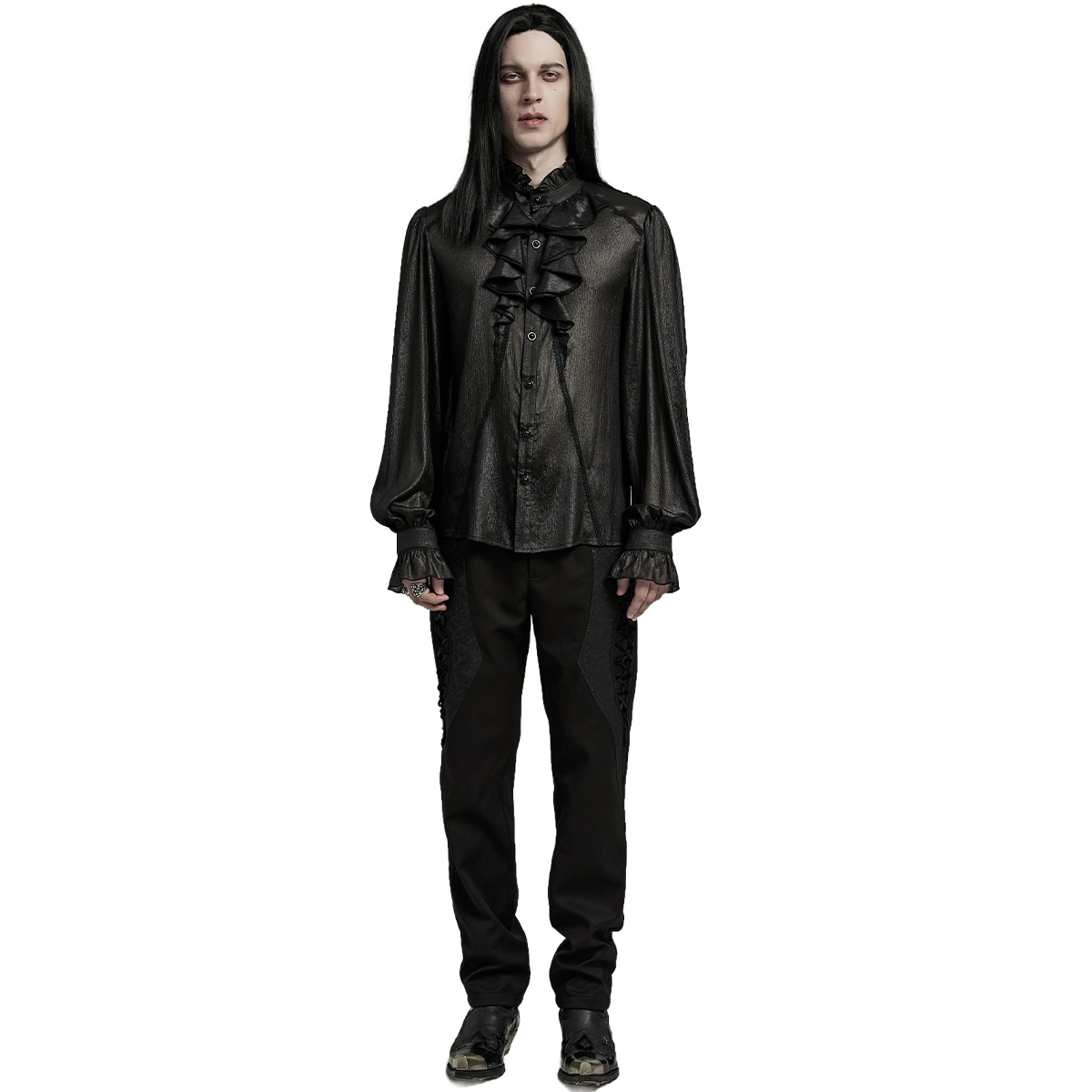 Men's Victorian Gothic Style Black Shirt • Embossed buttons in dark silver color • Cuffs edged with lace • High collar edged with ruffled lace • Embroidery on each side on the front • Also...