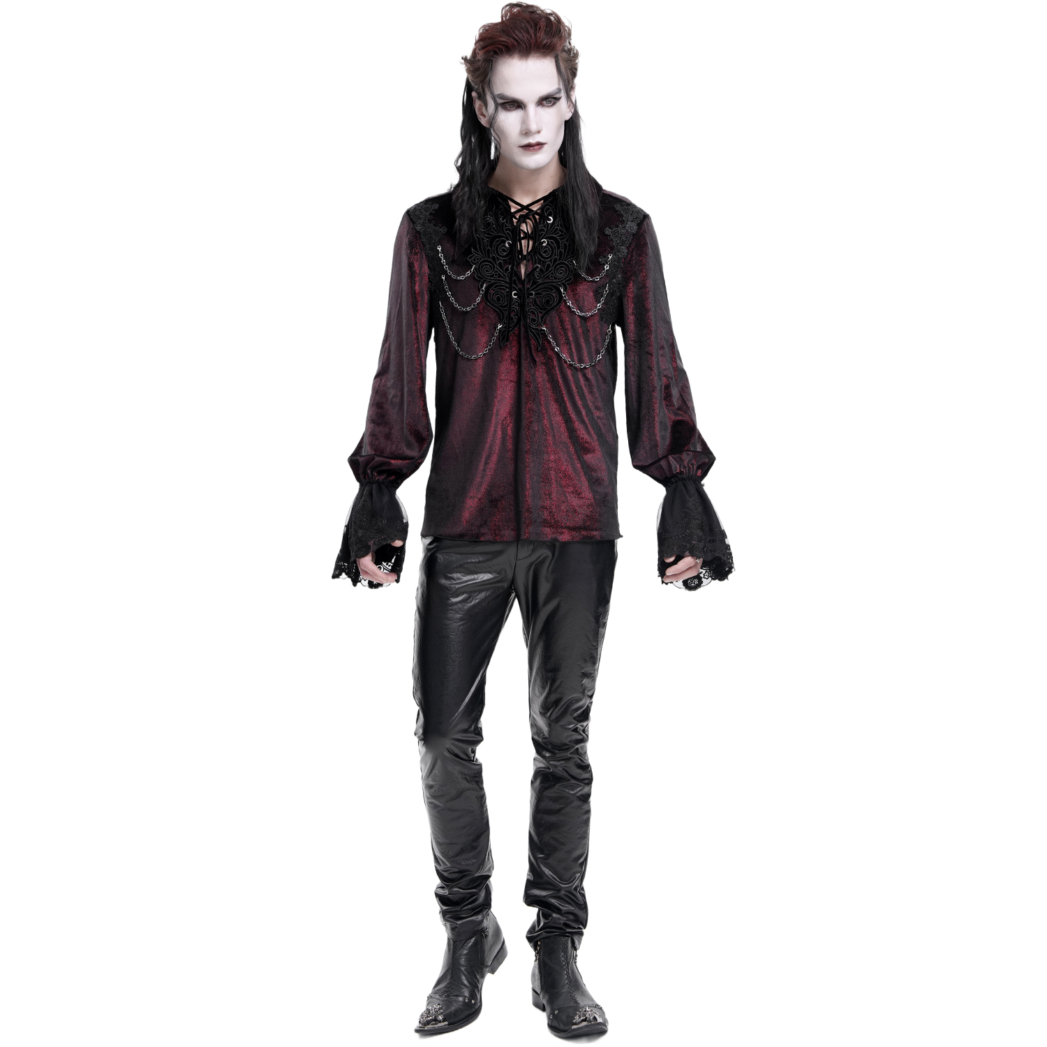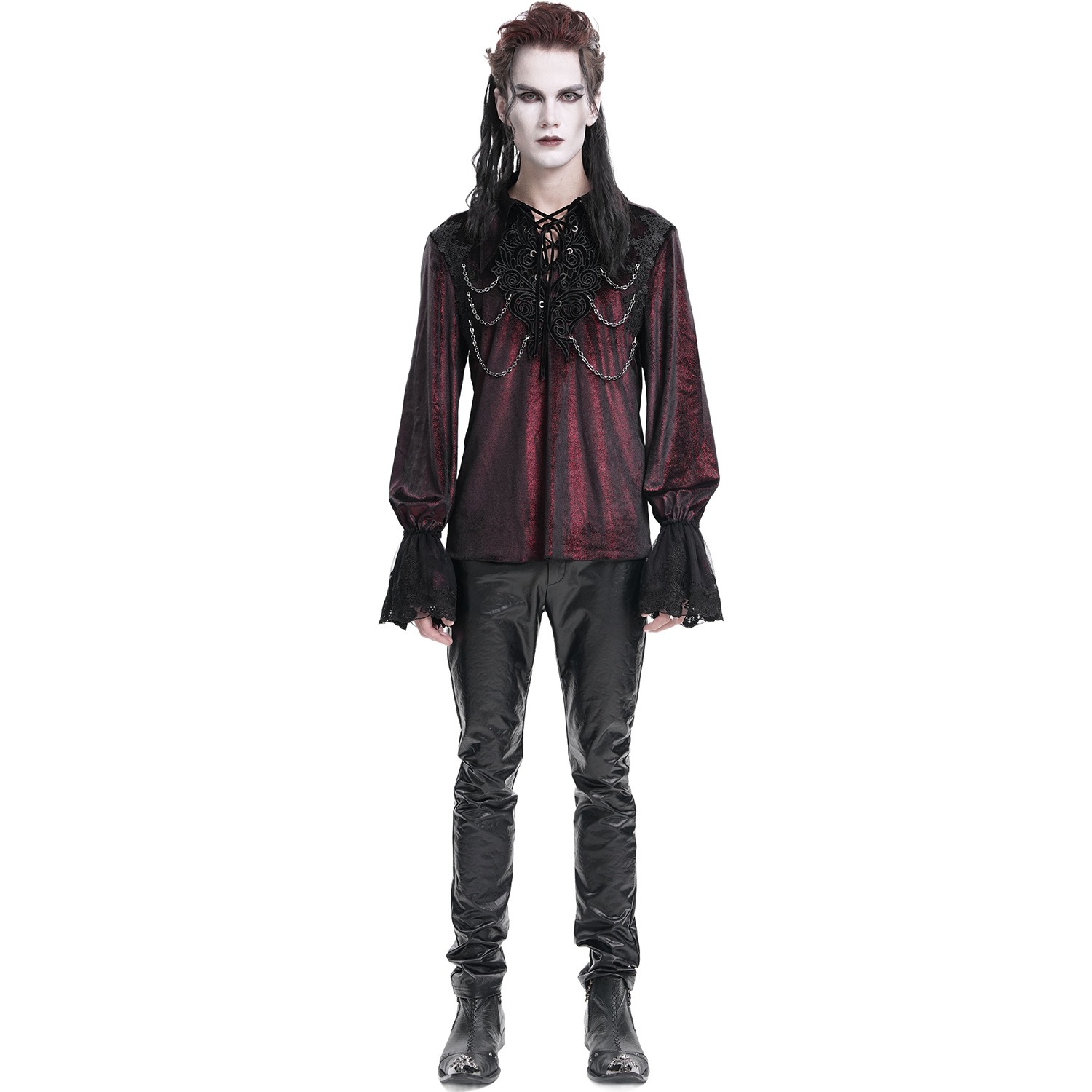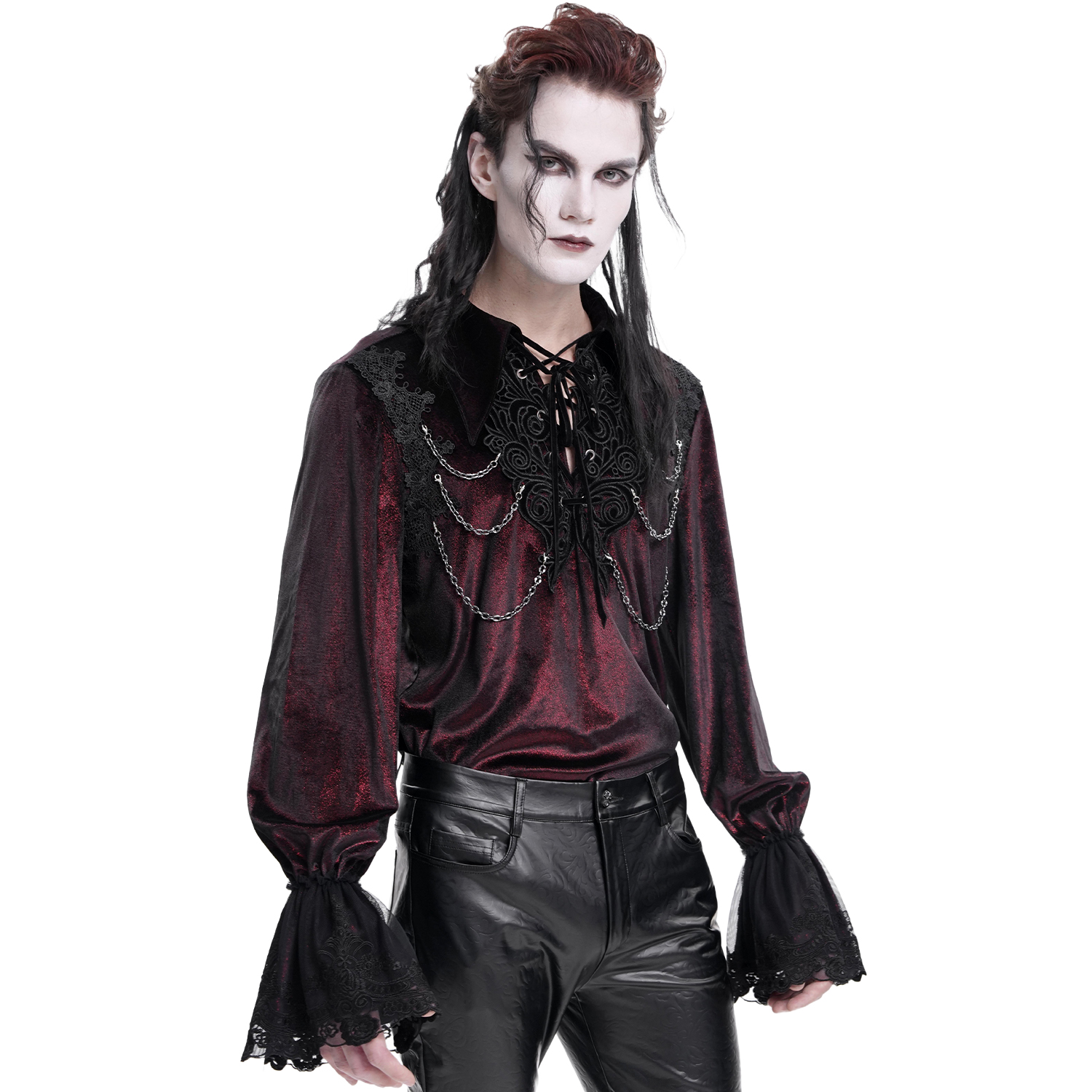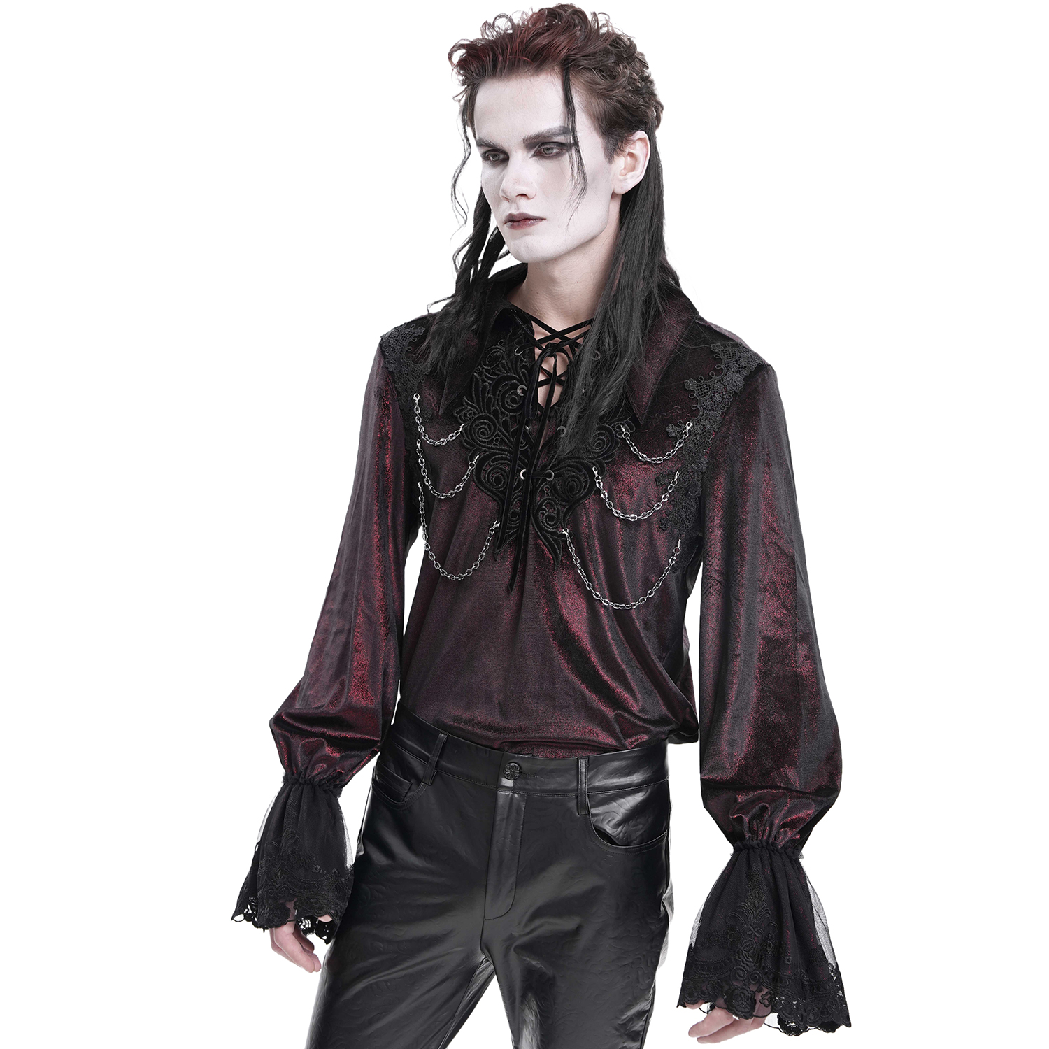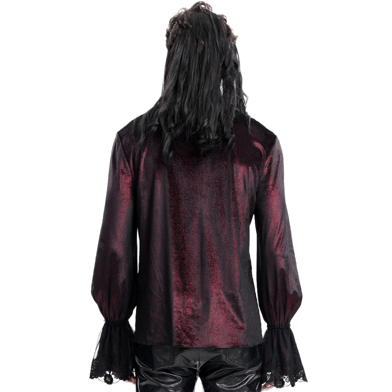 Men's Victorian Gothic Style Black Shirt • Embossed buttons in dark silver color • Cuffs edged with lace • High collar edged with ruffled lace • Embroidery on each side on the front • Also...