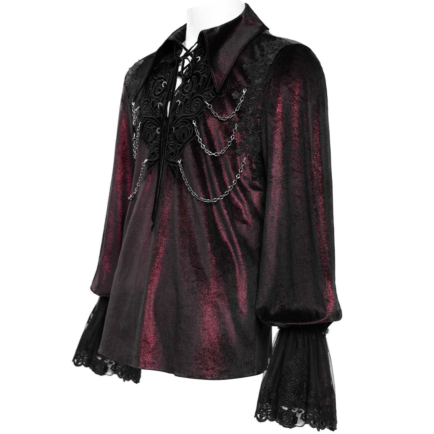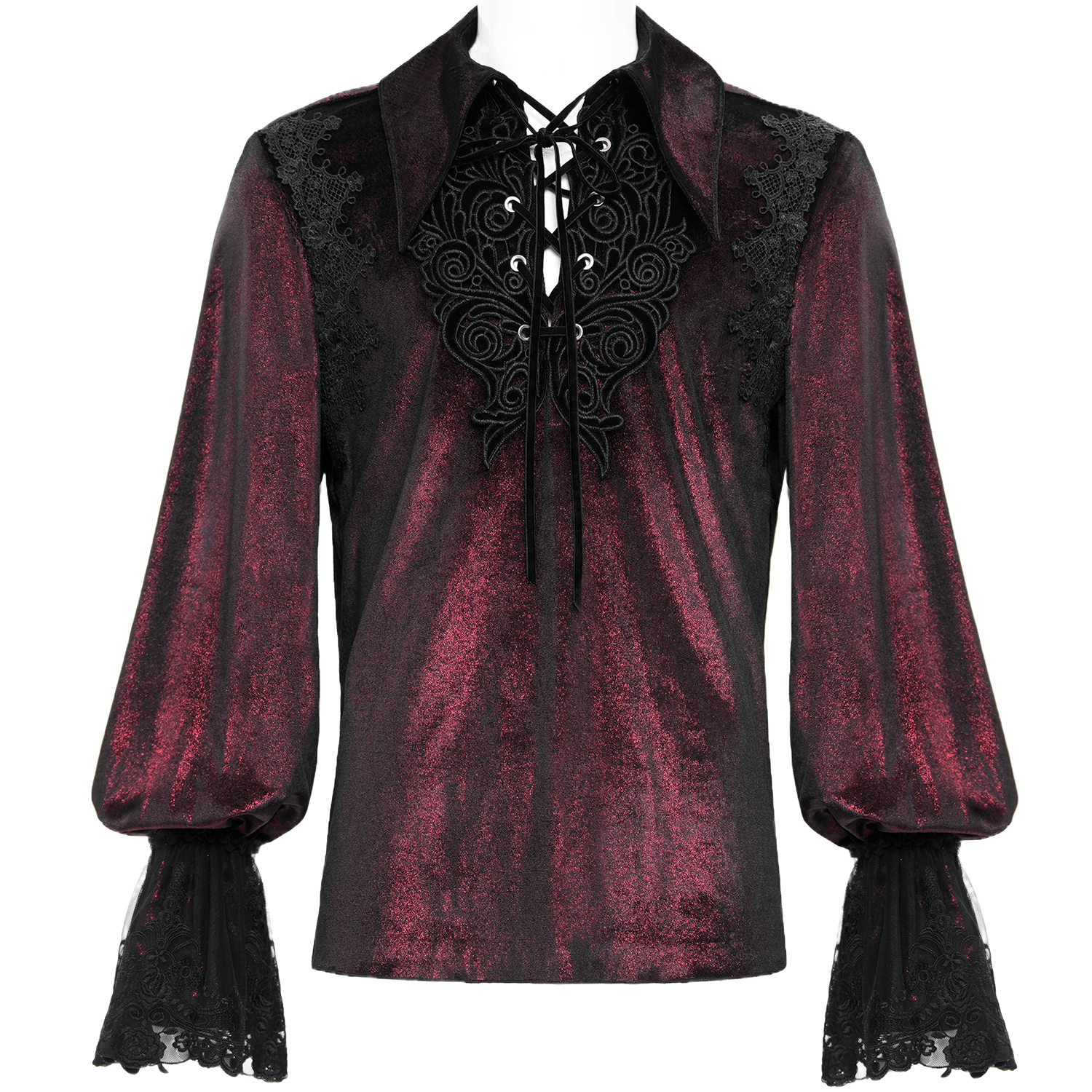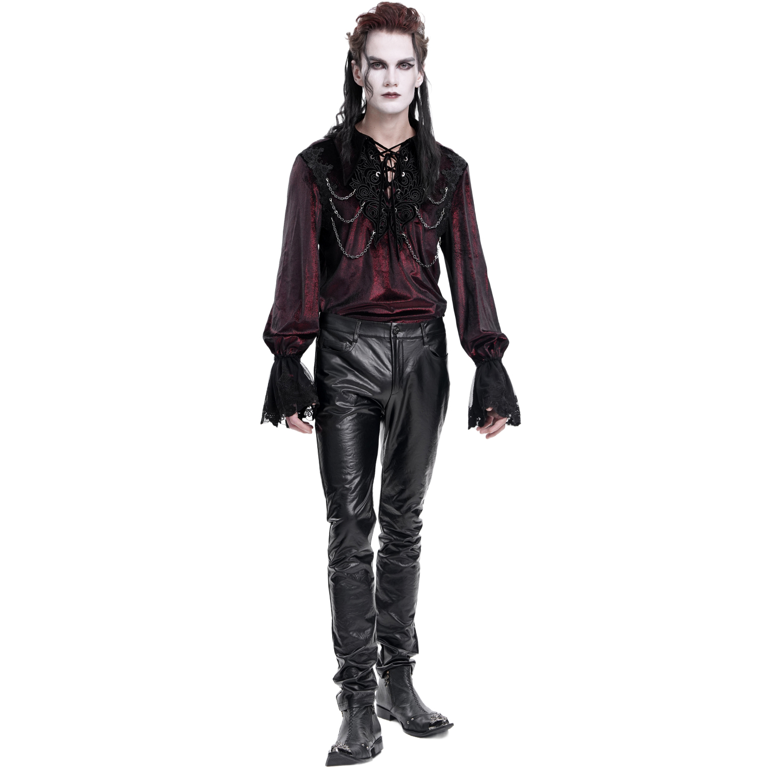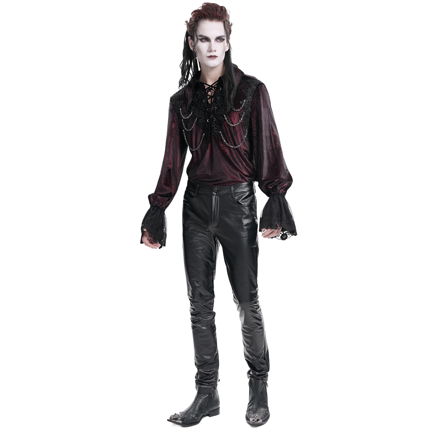 Men's Victorian Gothic Style Black Shirt • Embossed buttons in dark silver color • Cuffs edged with lace • High collar edged with ruffled lace • Embroidery on each side on the front • Also...