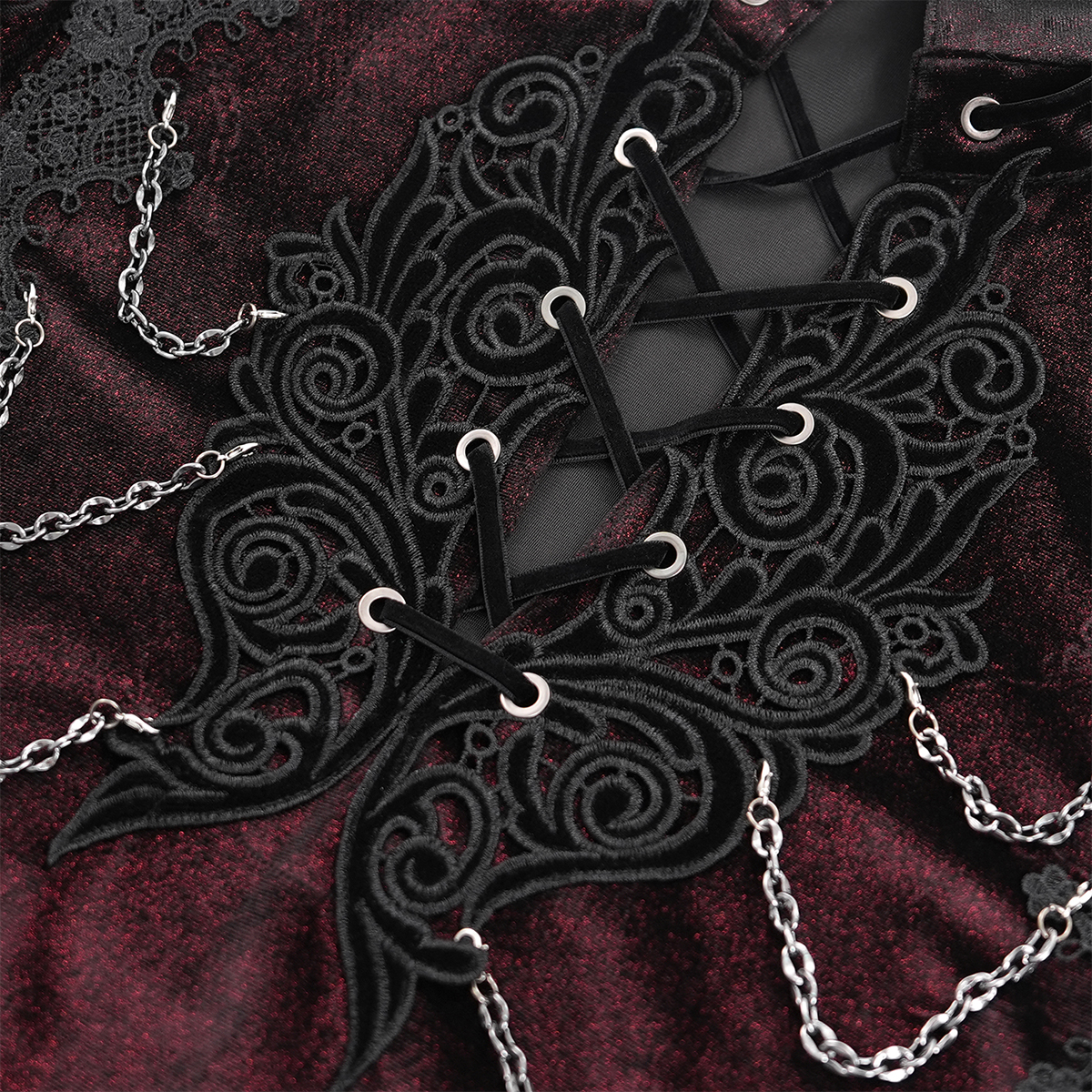 • Front pleated design with black coffin-shaped embroidery • Hand-embroidered gothic floral braid on the side • Front closure with engraved buttons • Black lace ruffled sleeves and collar •...