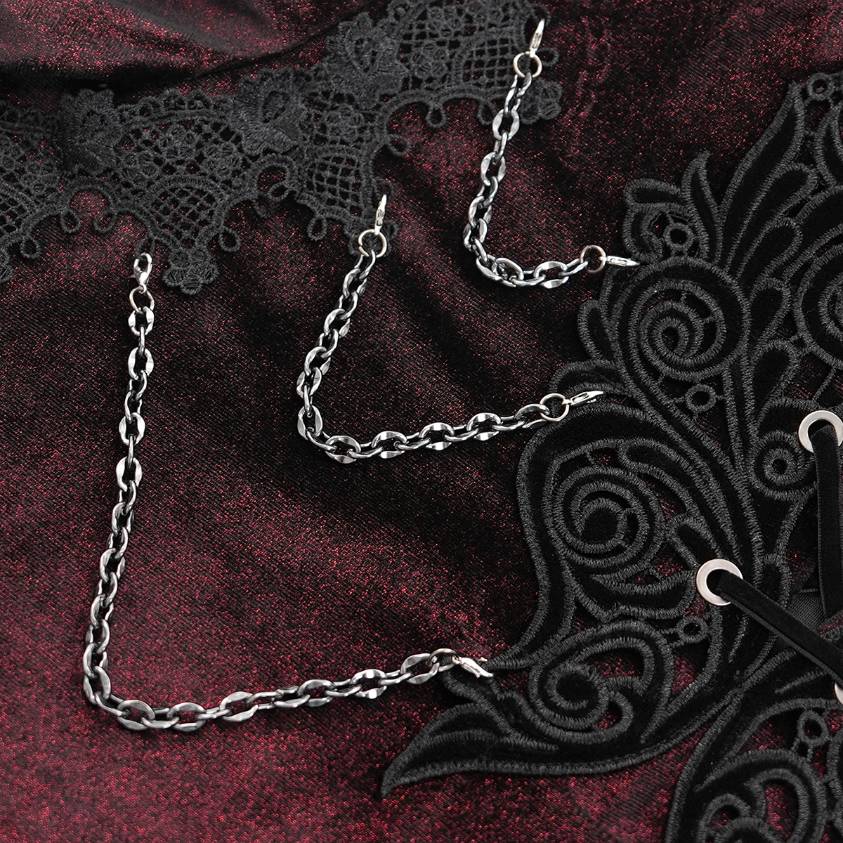 • Black jacquard printed corset belt • The solid color on the center front gives it a coffin shape • The coffin is decorated with ribbons and beads • Removable silver-tone metal chains • Front...