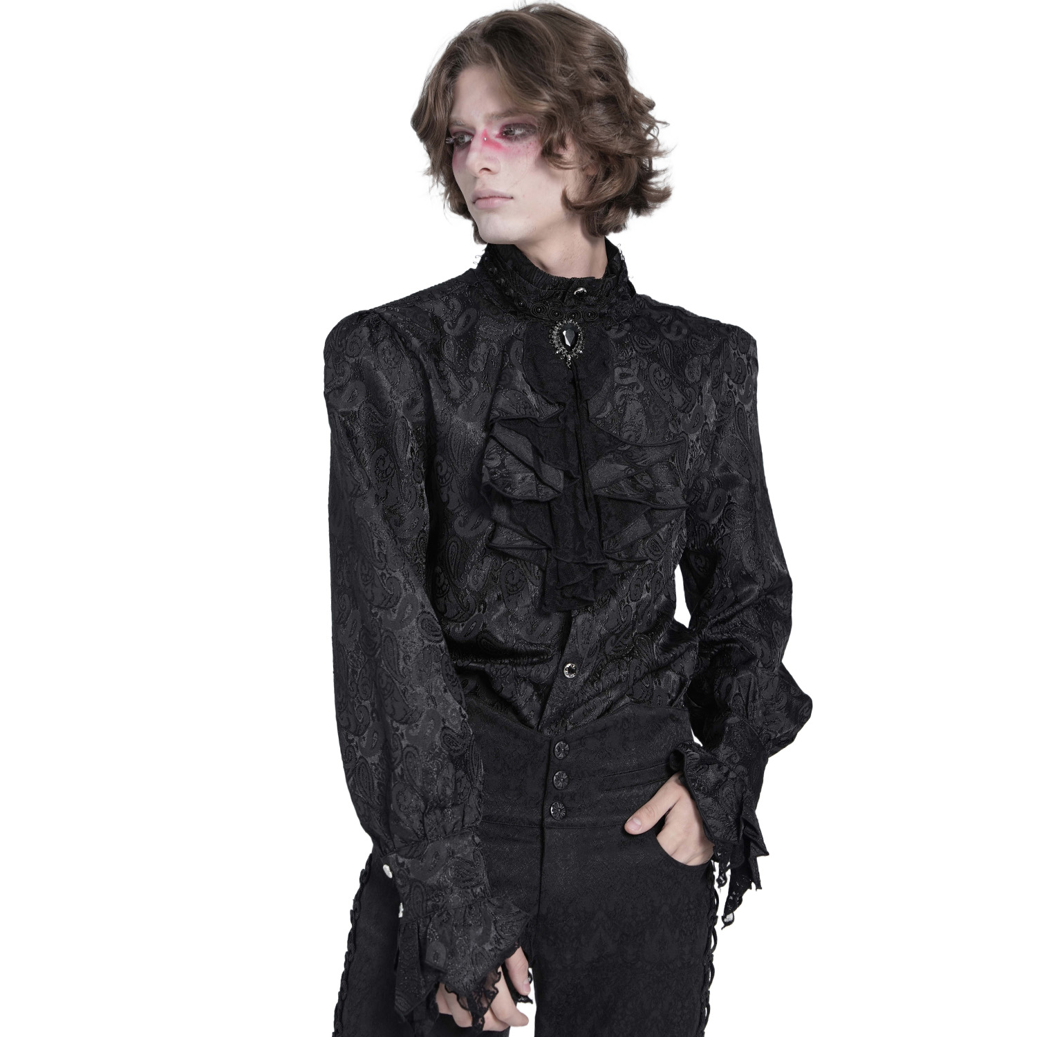 • Paisley pattern fabric • Classic collar • Lace on the shoulders • Lantern sleeves • Lace ruffles at the cuffs • One pocket on the chest • Finely decorated metal buttons • Also available in black...