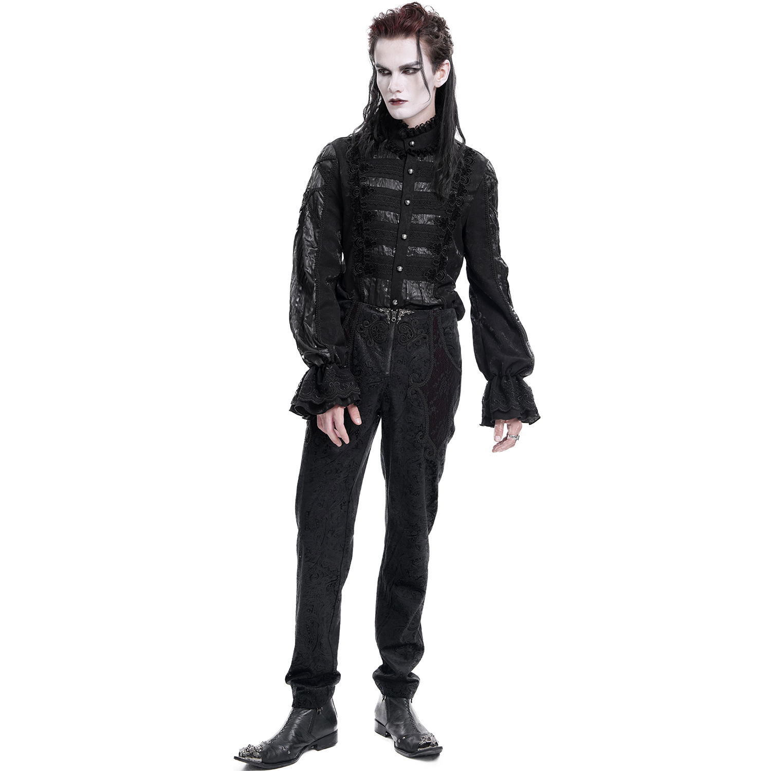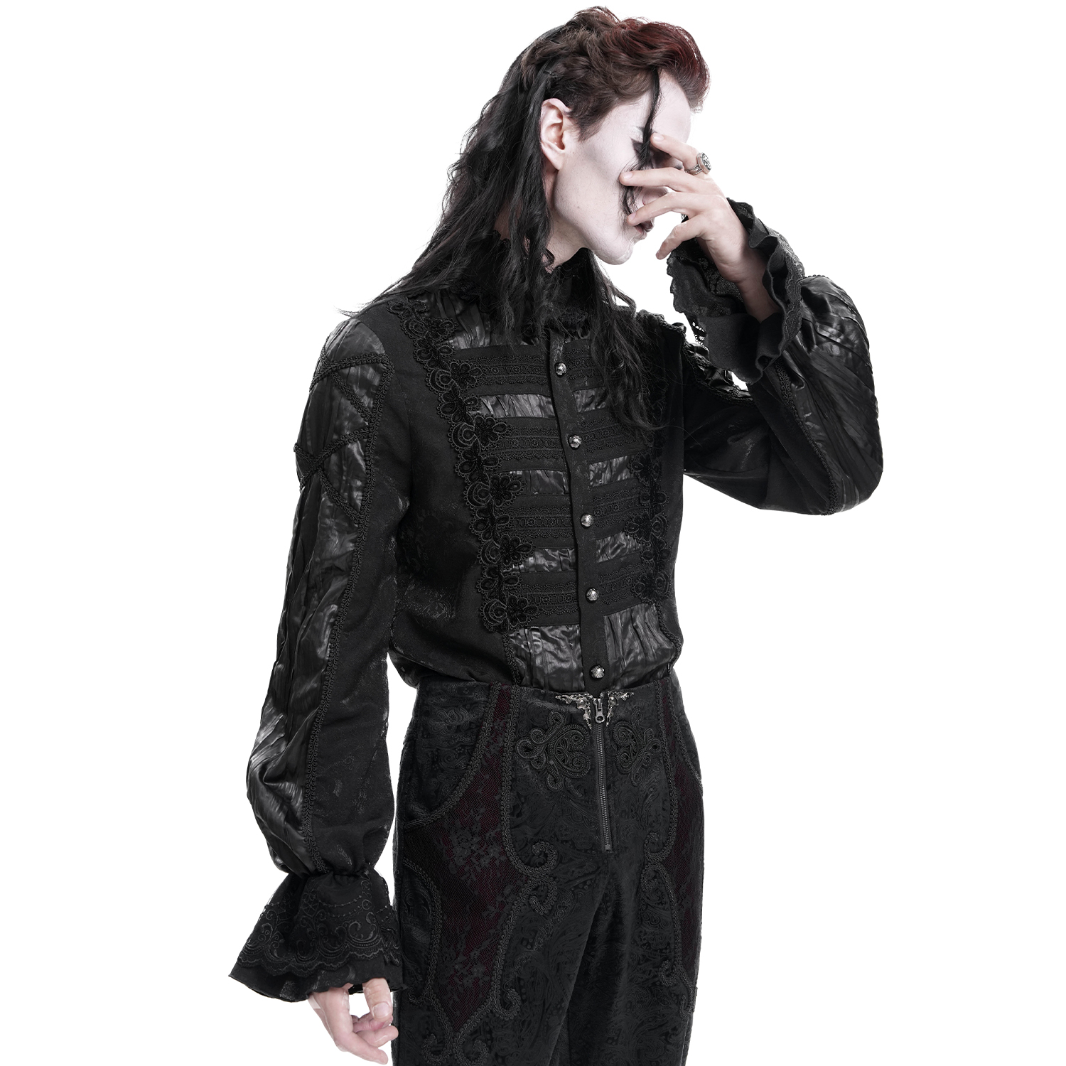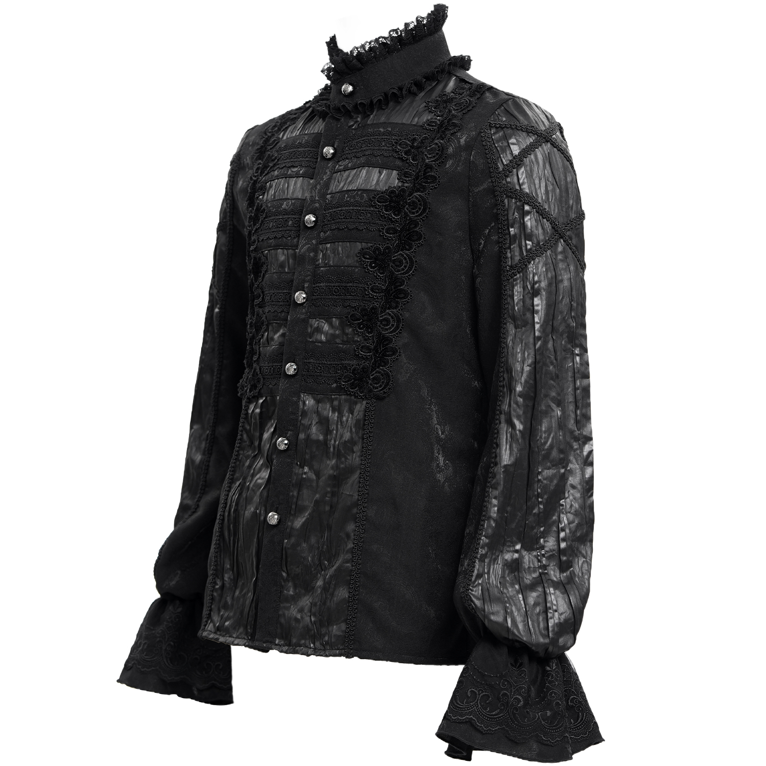Gothic long sleeve shirt for men • Soft, light and semi-transparent black polyester • Black lace with ruffles • Front closure with personalized buttons • Mandarin collar decorated with ruffled...