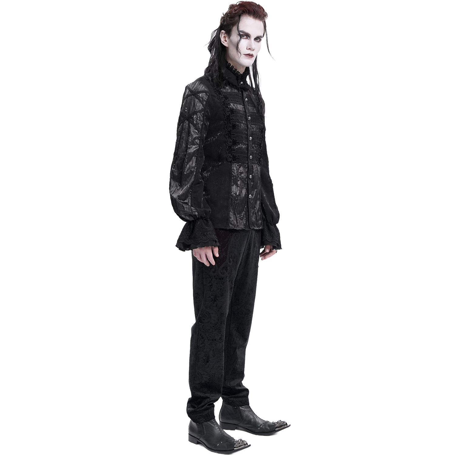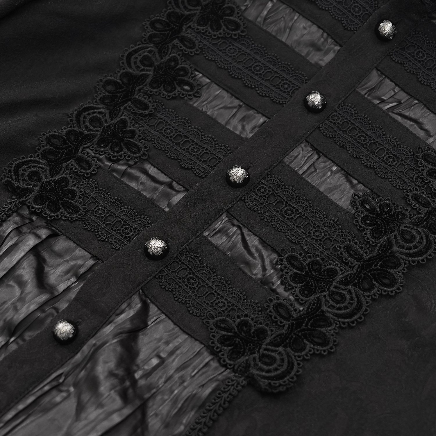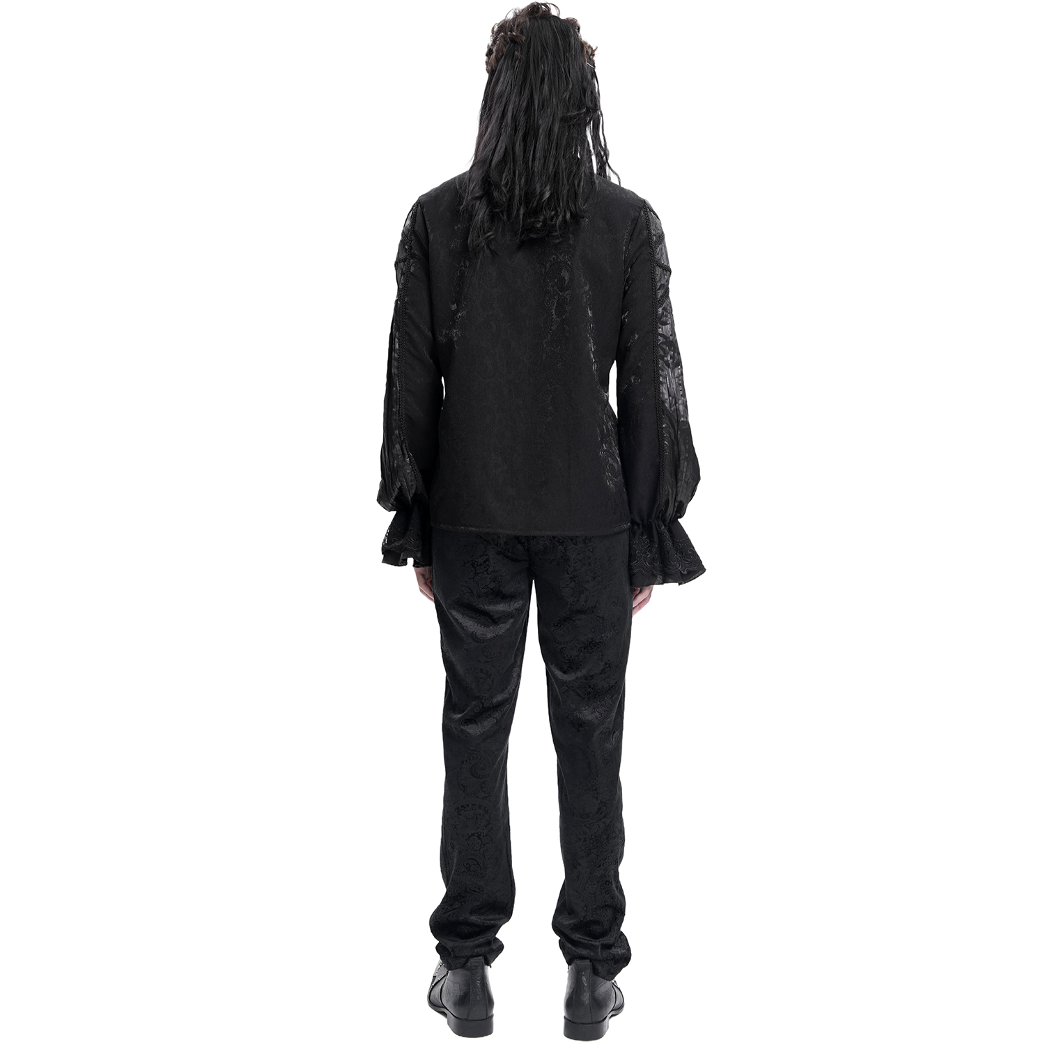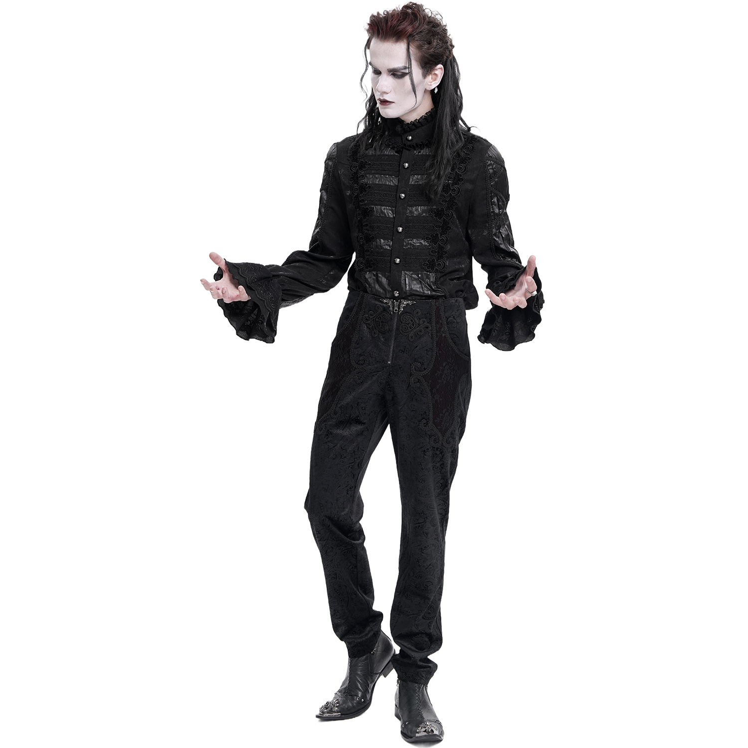 Gothic long sleeve shirt for men • Soft, light and semi-transparent black polyester • Black lace with ruffles • Front closure with personalized buttons • Mandarin collar decorated with ruffled...