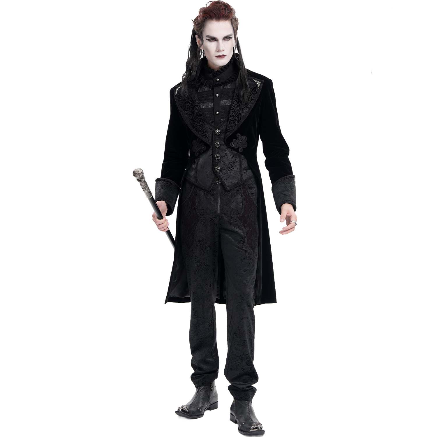 • In non-stretch woven velvet • Two-piece in one design • Stand-up collar • Large lapels decorated with braid on the edges and metal corners • Embossed velvet inner vest • Closes with two-tone...