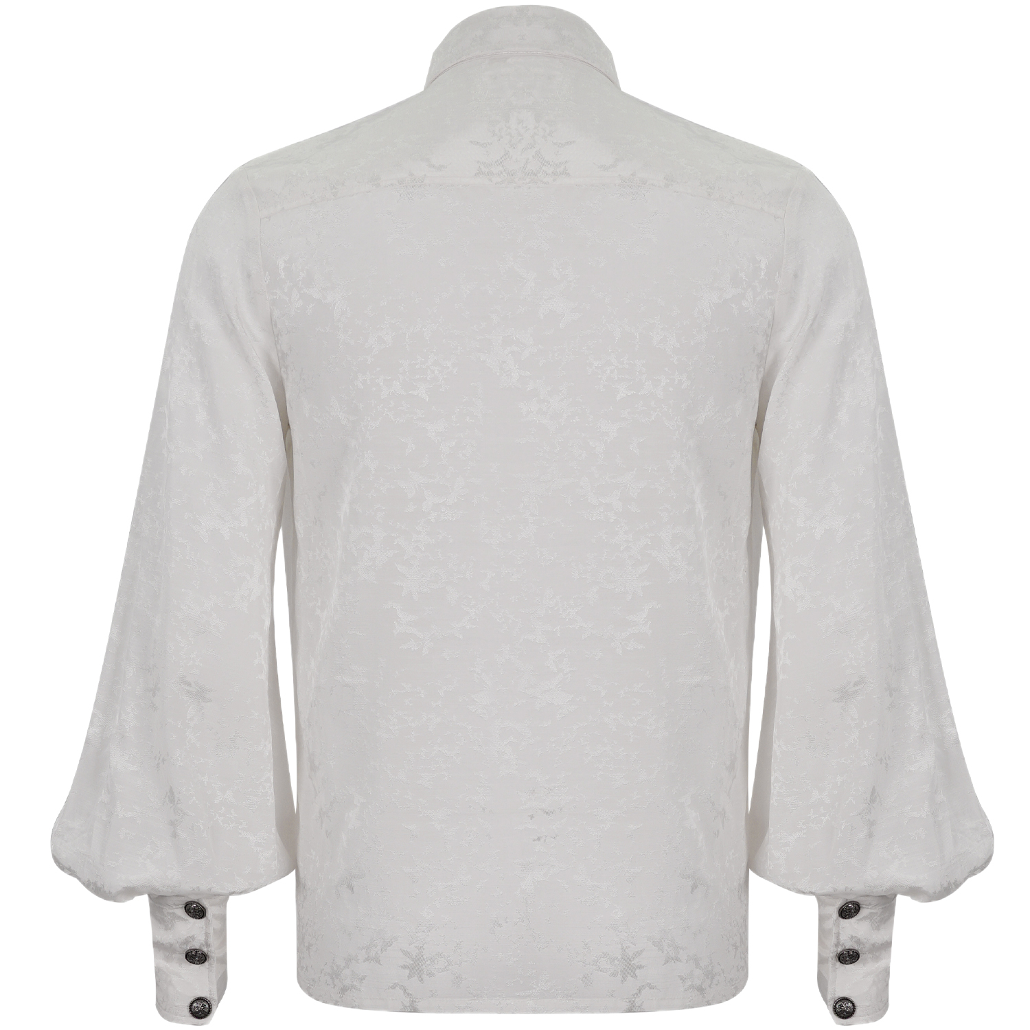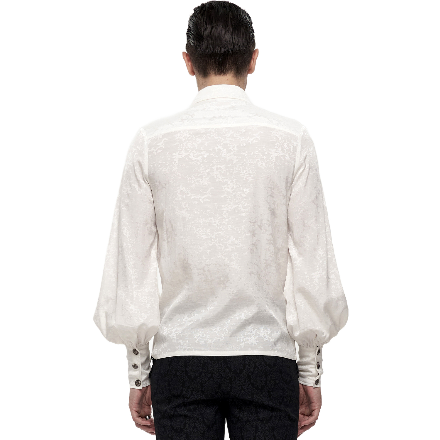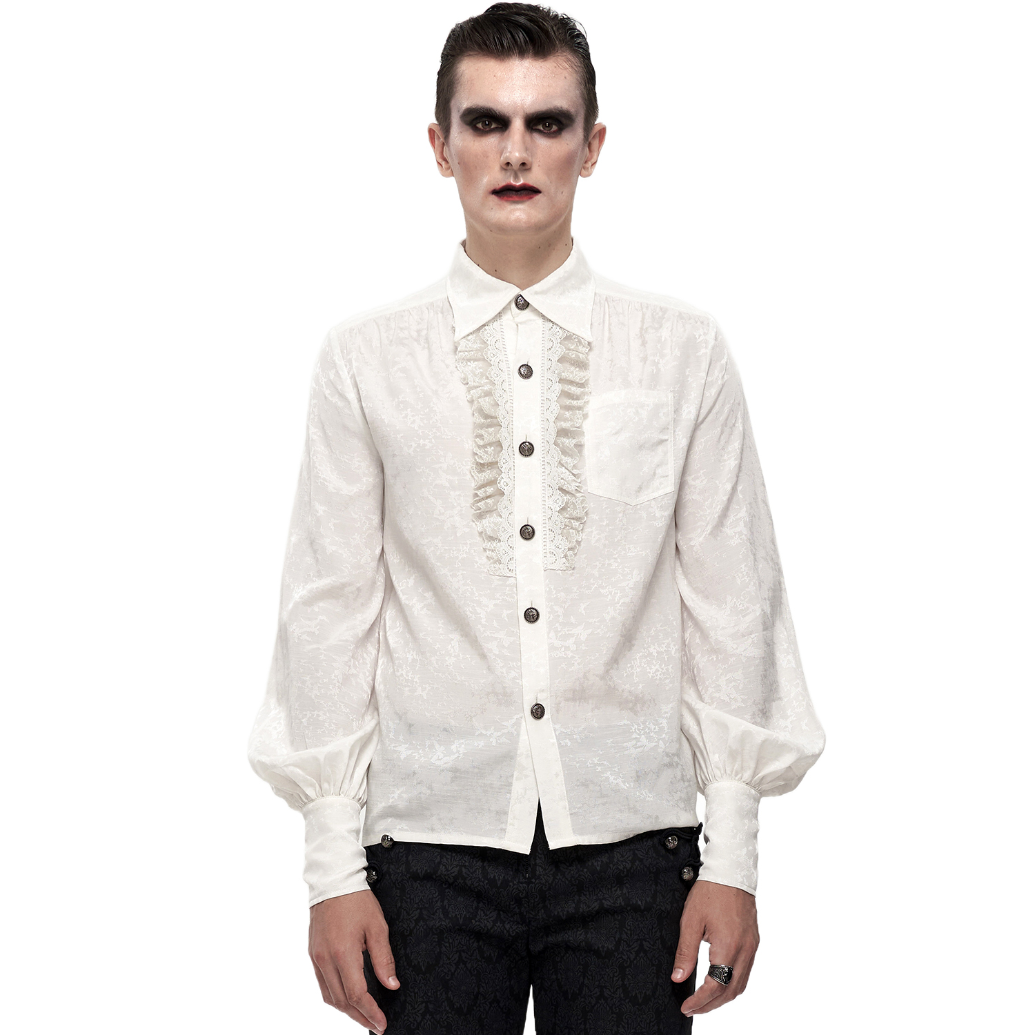 Gothic style ruffled shirt for men • In white jacquard • Cuffs closed with two metal buttons • High collar edged with ruffled lace • Detachable tie • 96% Cotton, 4% Spandex By Punk Rave SIZES...