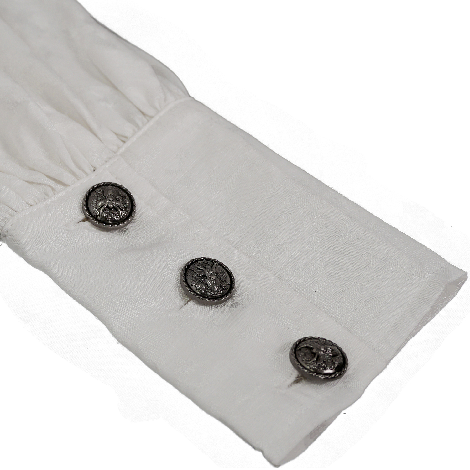 • Button placket and cuffs decorated with patterned silver buttons