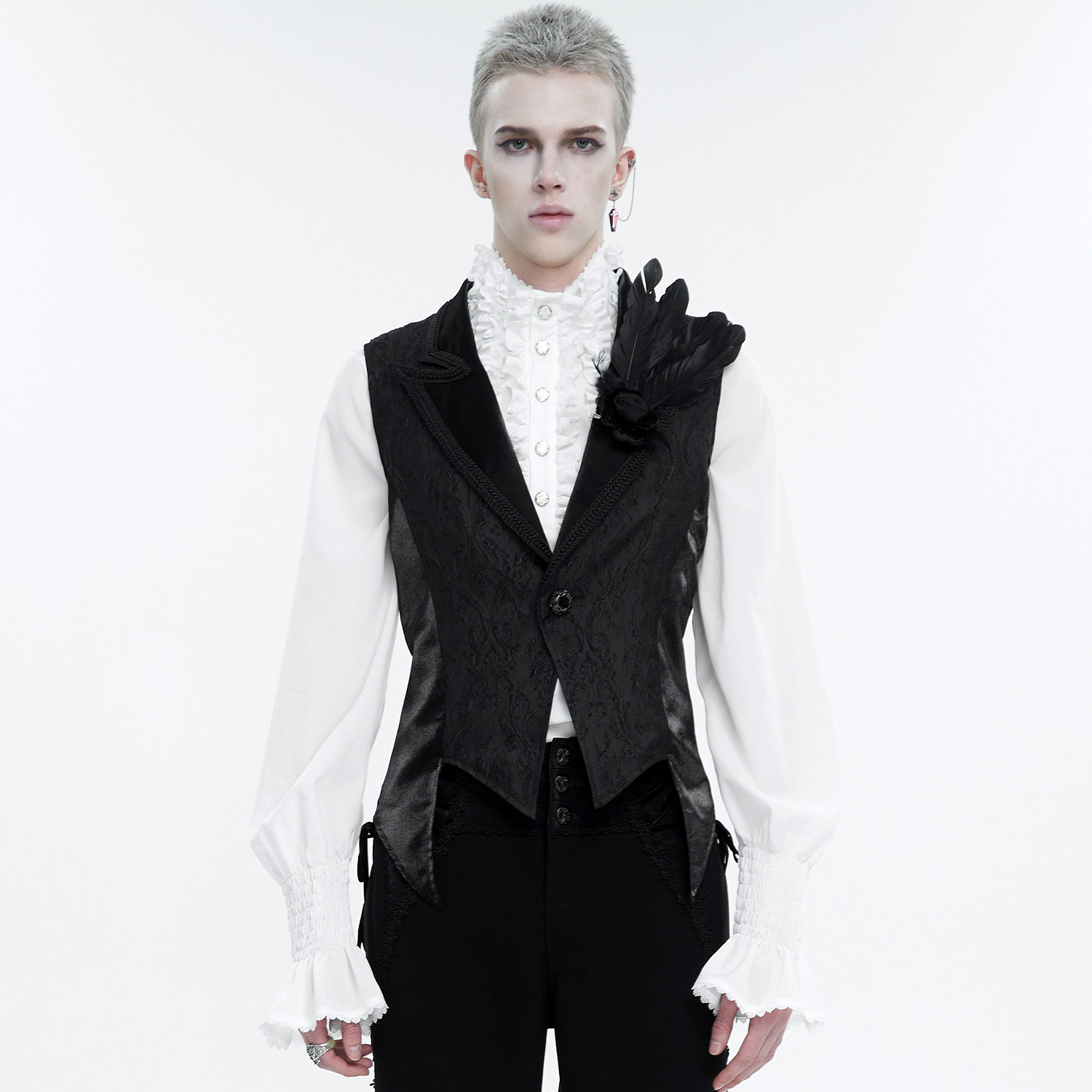 Gothic Victorian style men's black-grey damask vest decorated with satin ribbon ornament straps on the front closure and black embossed buttons. • Eyeleted back strap with silver embossed buckle. •...