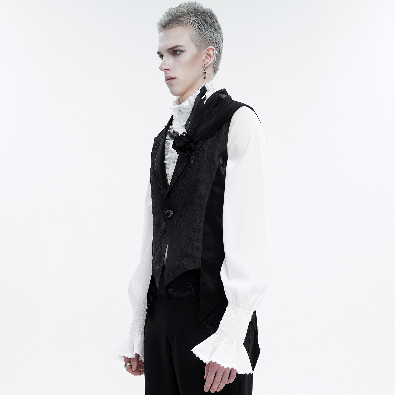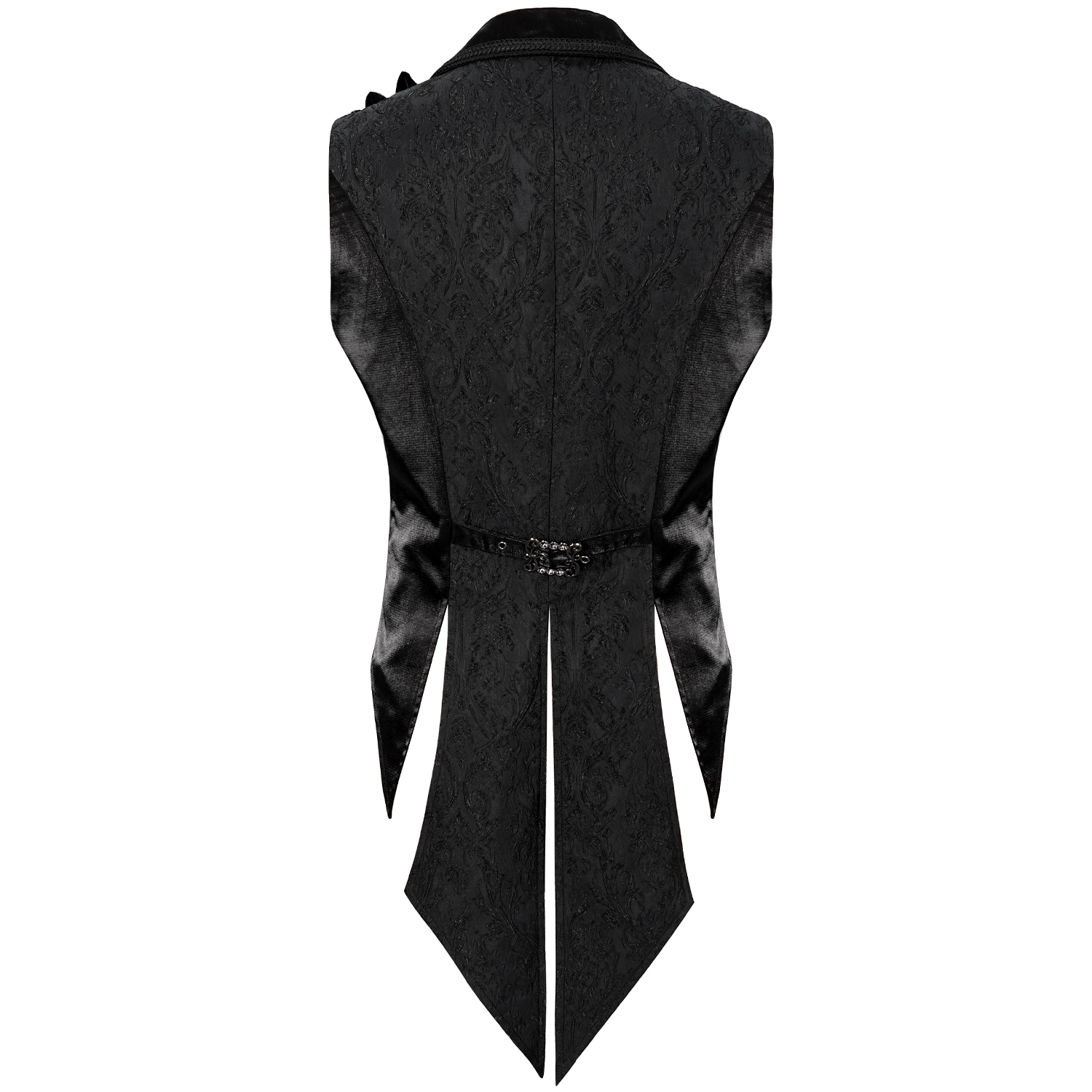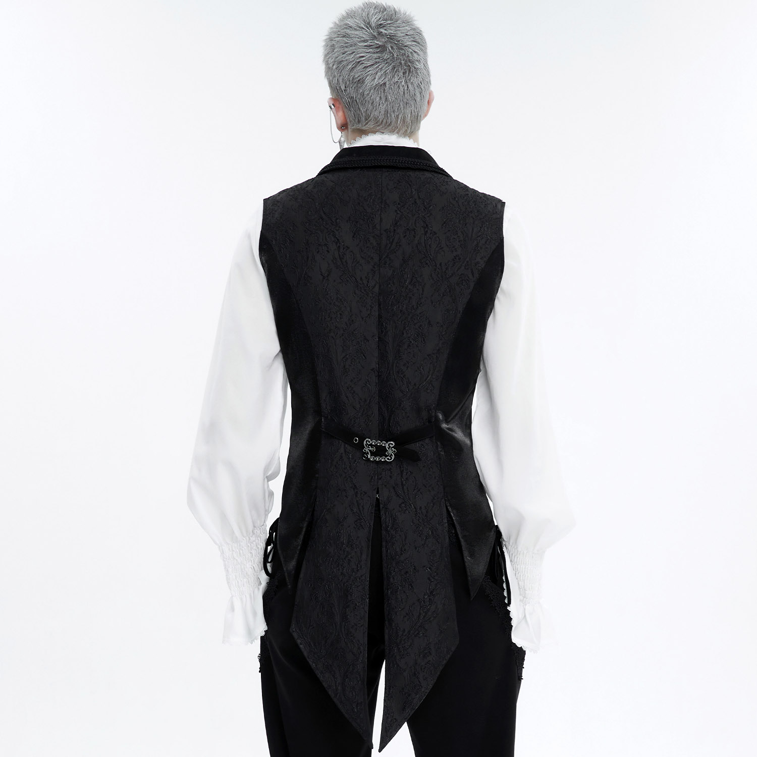 Victorian gothic waistcoat in black jacquard • Pattern has 3D effect • Cross cut on the front • Eight hand sewn buttons • Decorative chain on a strip of lace • Two patch pockets • Adjustable buckle...