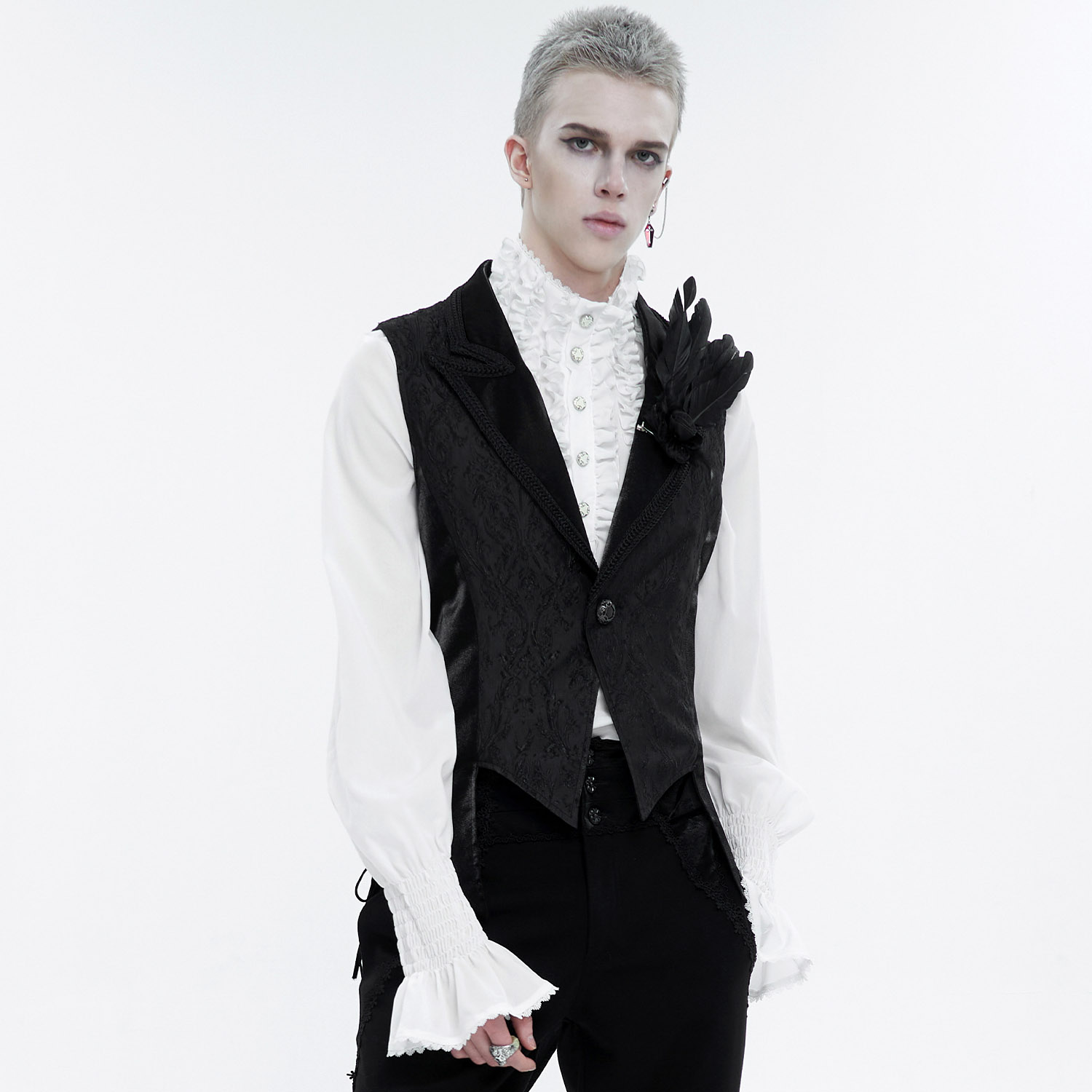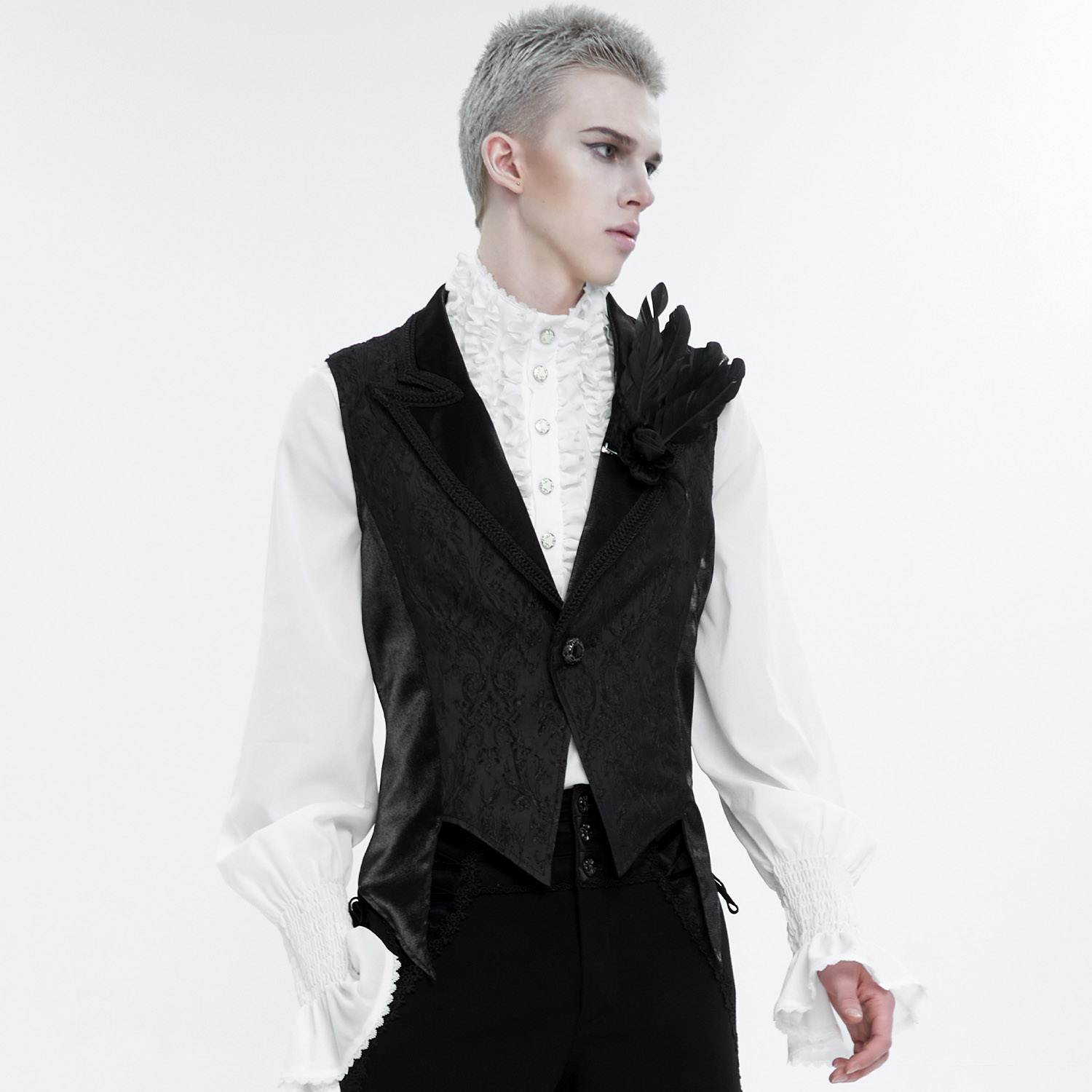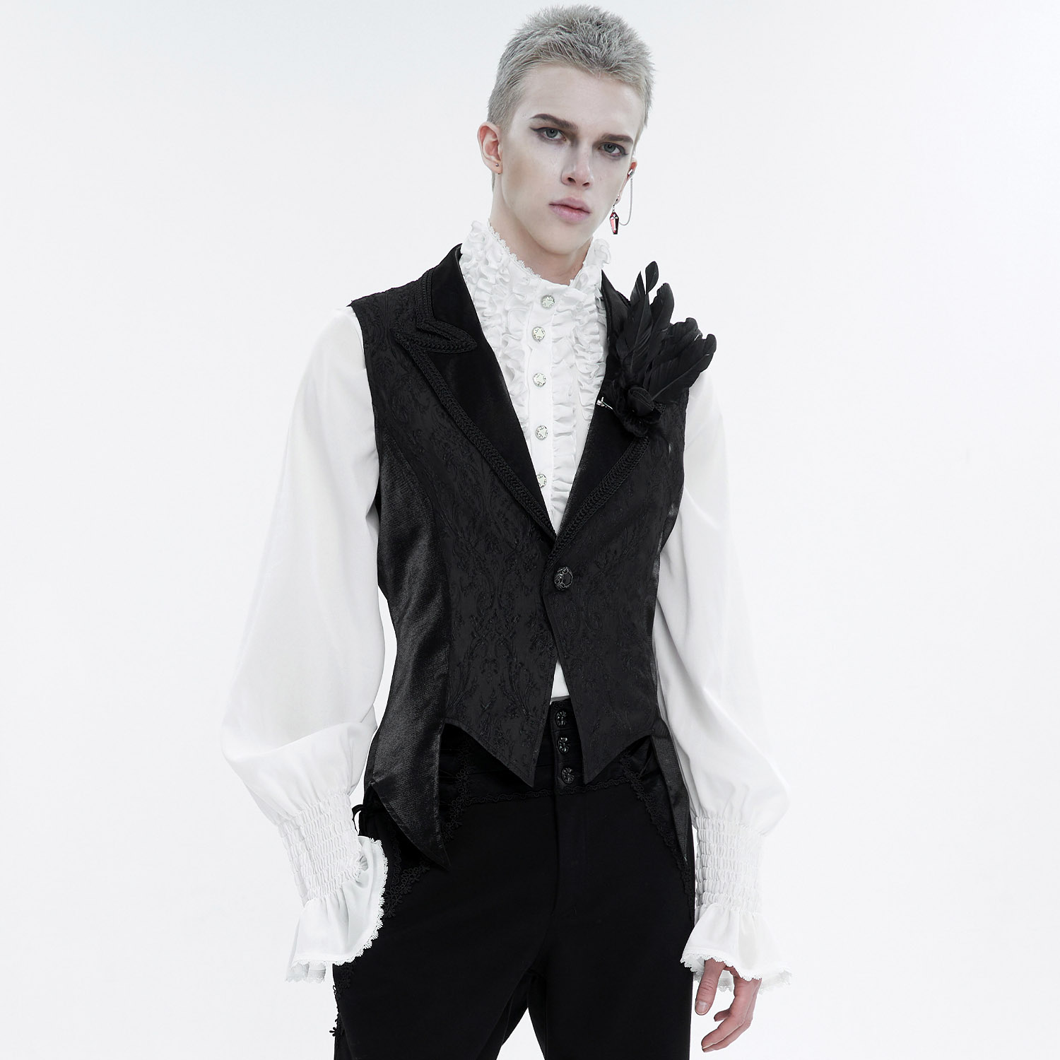 Victorian gothic waistcoat in black jacquard • Pattern has 3D effect • Cross cut on the front • Eight hand sewn buttons • Decorative chain on a strip of lace • Two patch pockets • Adjustable buckle...