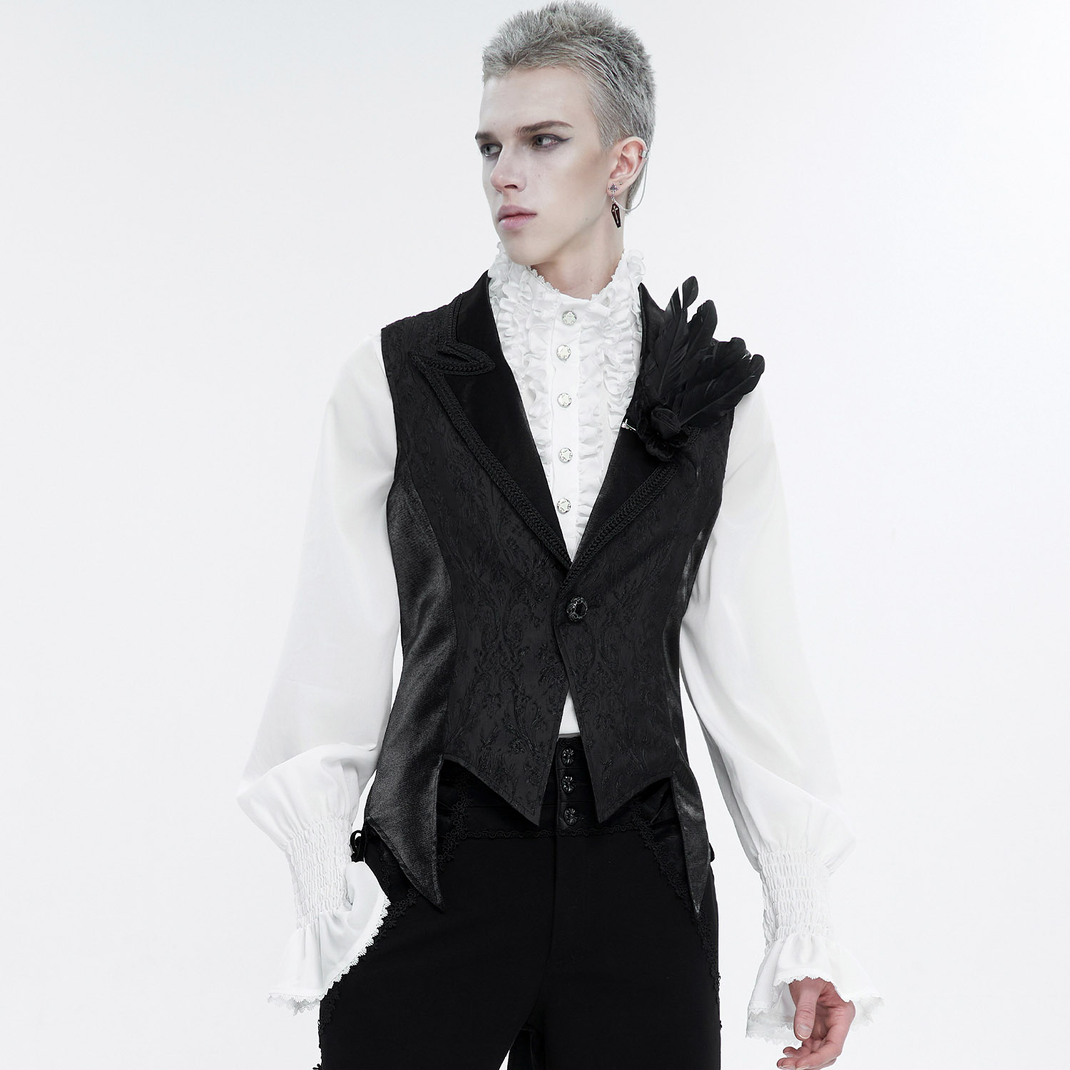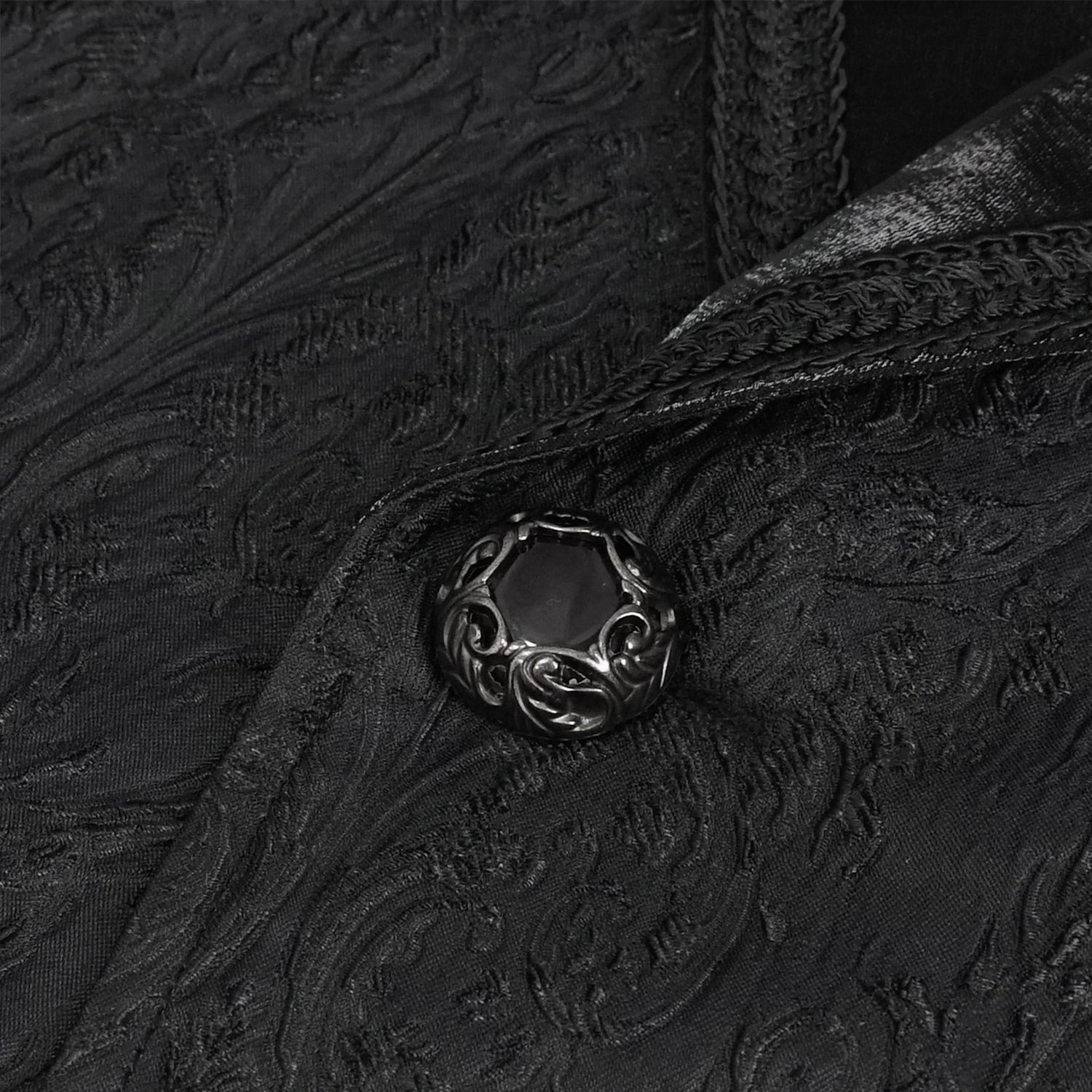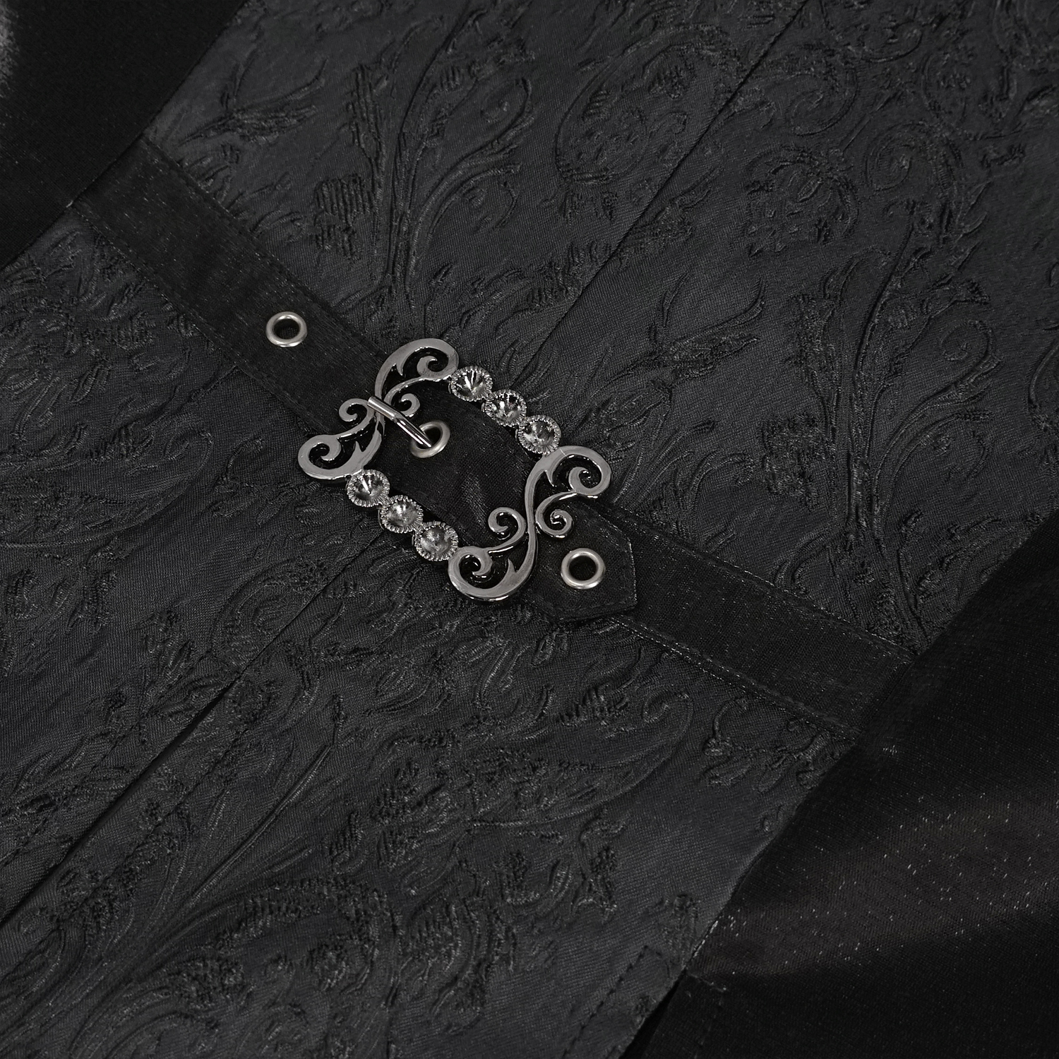 Men's Classic Black Gothic Vest with Cross Closure • Three oblique buttons covered with fabric • Fabric with floral pattern and fine stripes • Two pockets • Strap and buckle on the back for a...