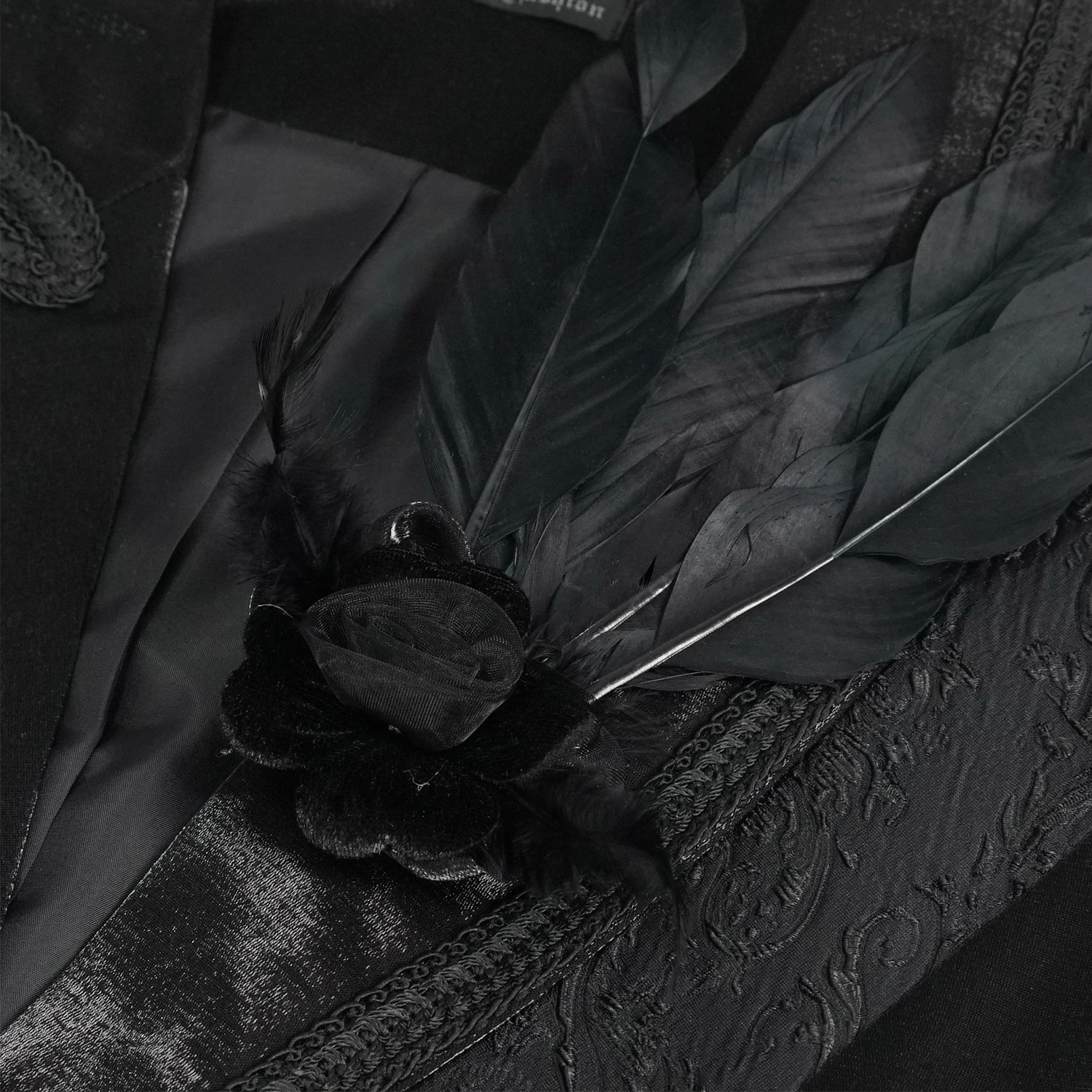 • Detachable brooch adorned with black feathers and a 3D fabric rose