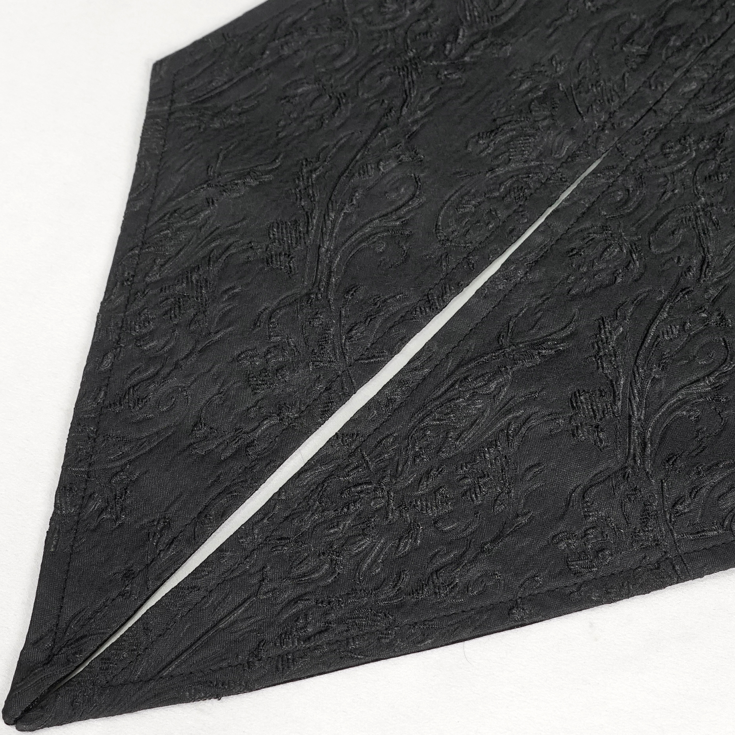 Black brocade jacquard and velvet victorian waistcoat • Embroidered high collar • Front zipper with molded pull tab • Horizontal black velvet bands and raised buttons • Black velvet shoulder...