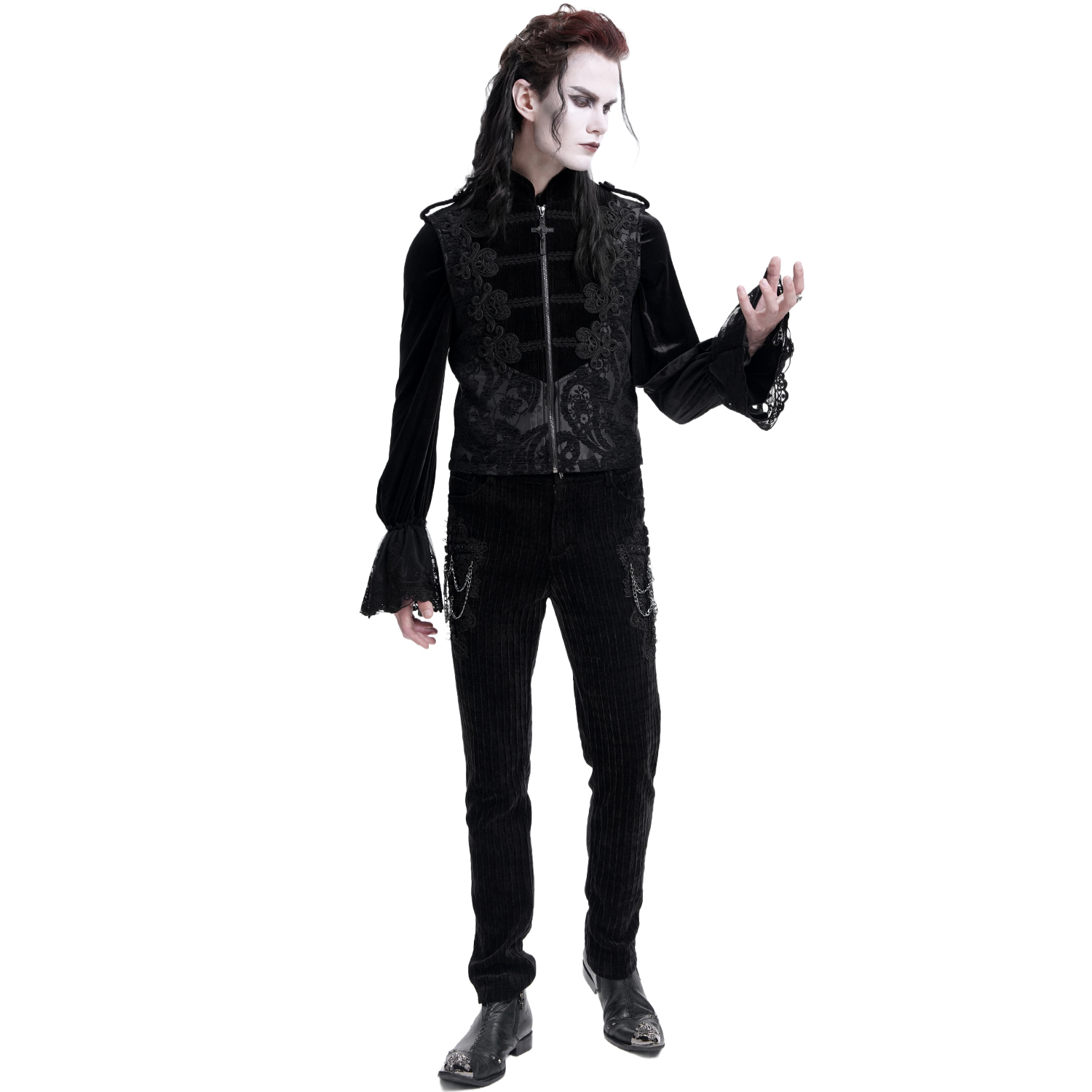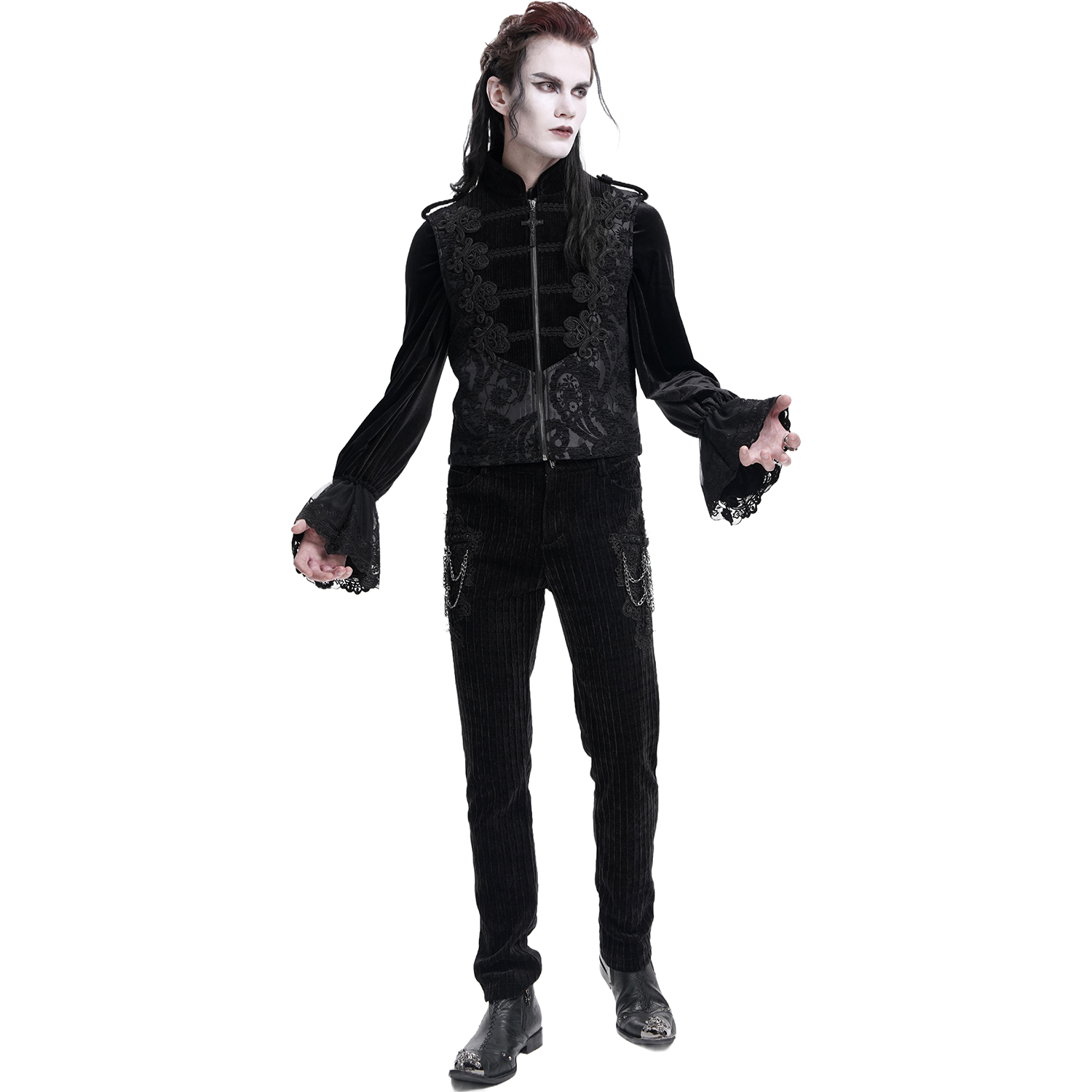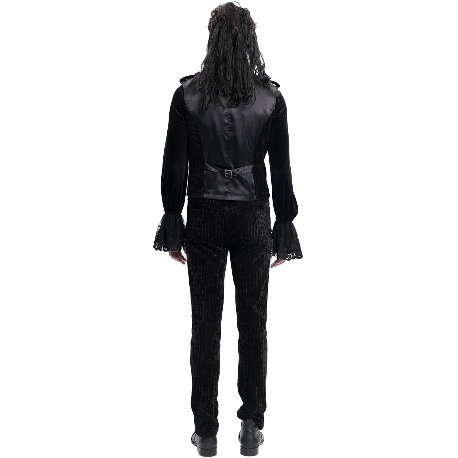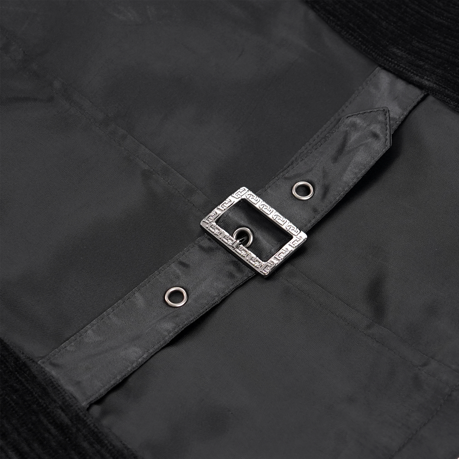 Men's Classic Black Gothic Vest with Cross Closure • Three oblique buttons covered with fabric • Fabric with floral pattern and fine stripes • Two pockets • Strap and buckle on the back for a...