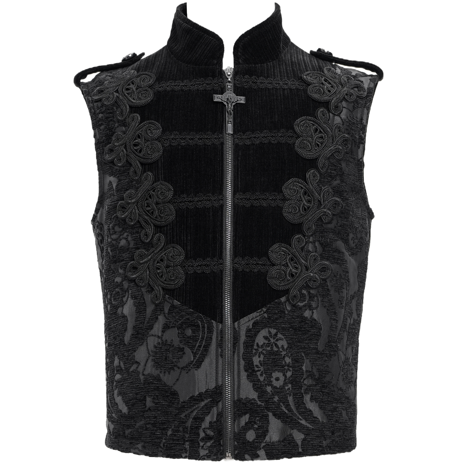 Black brocade jacquard and velvet victorian waistcoat • Embroidered high collar • Front zipper with molded pull tab • Horizontal black velvet bands and raised buttons • Black velvet shoulder...