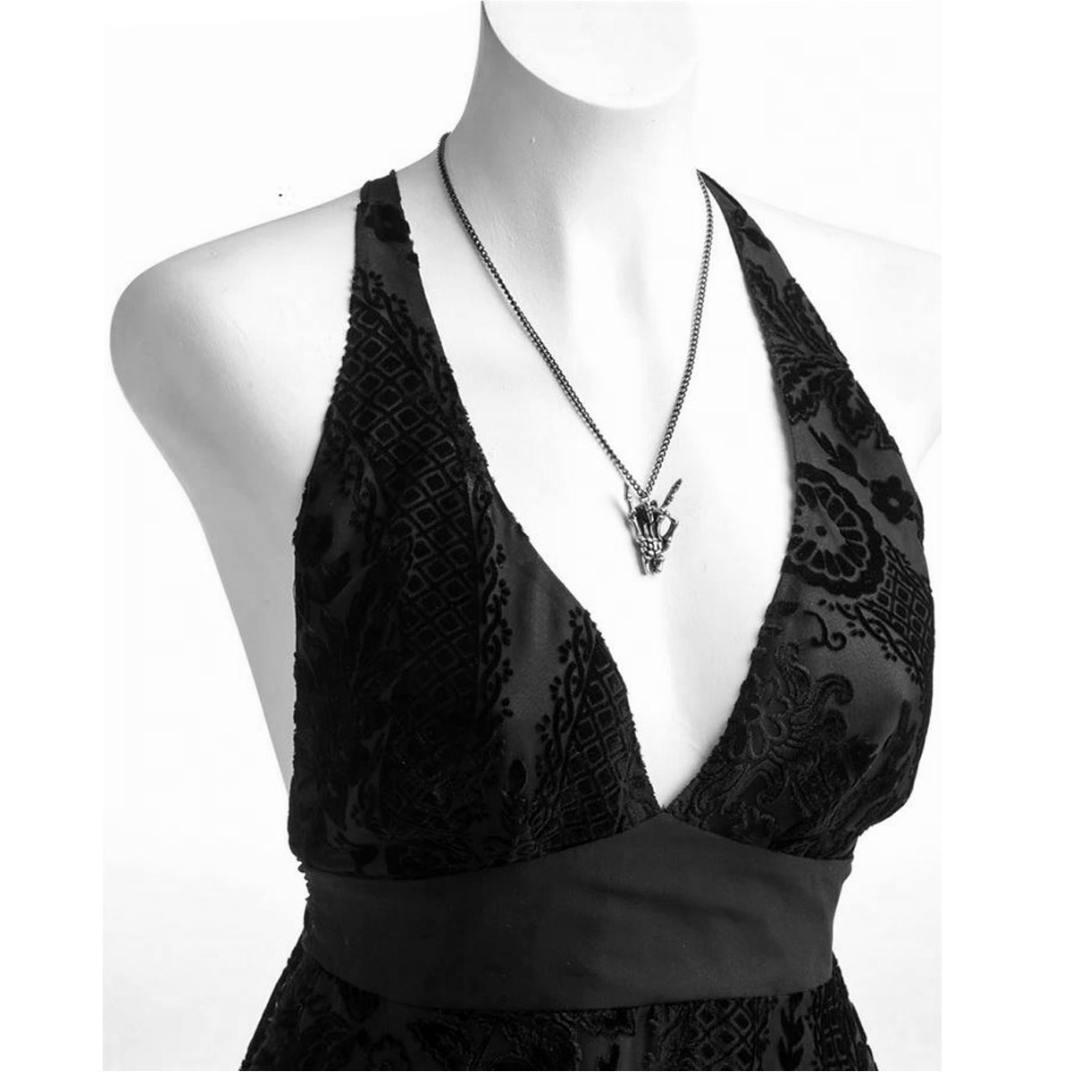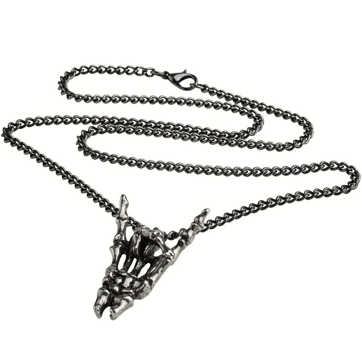 • An antiqued pewter skeletal hand pendant in the gesture of a traditional protection amulet and rock 'n roll salute; on a black 21" (53 cm) trace chain.