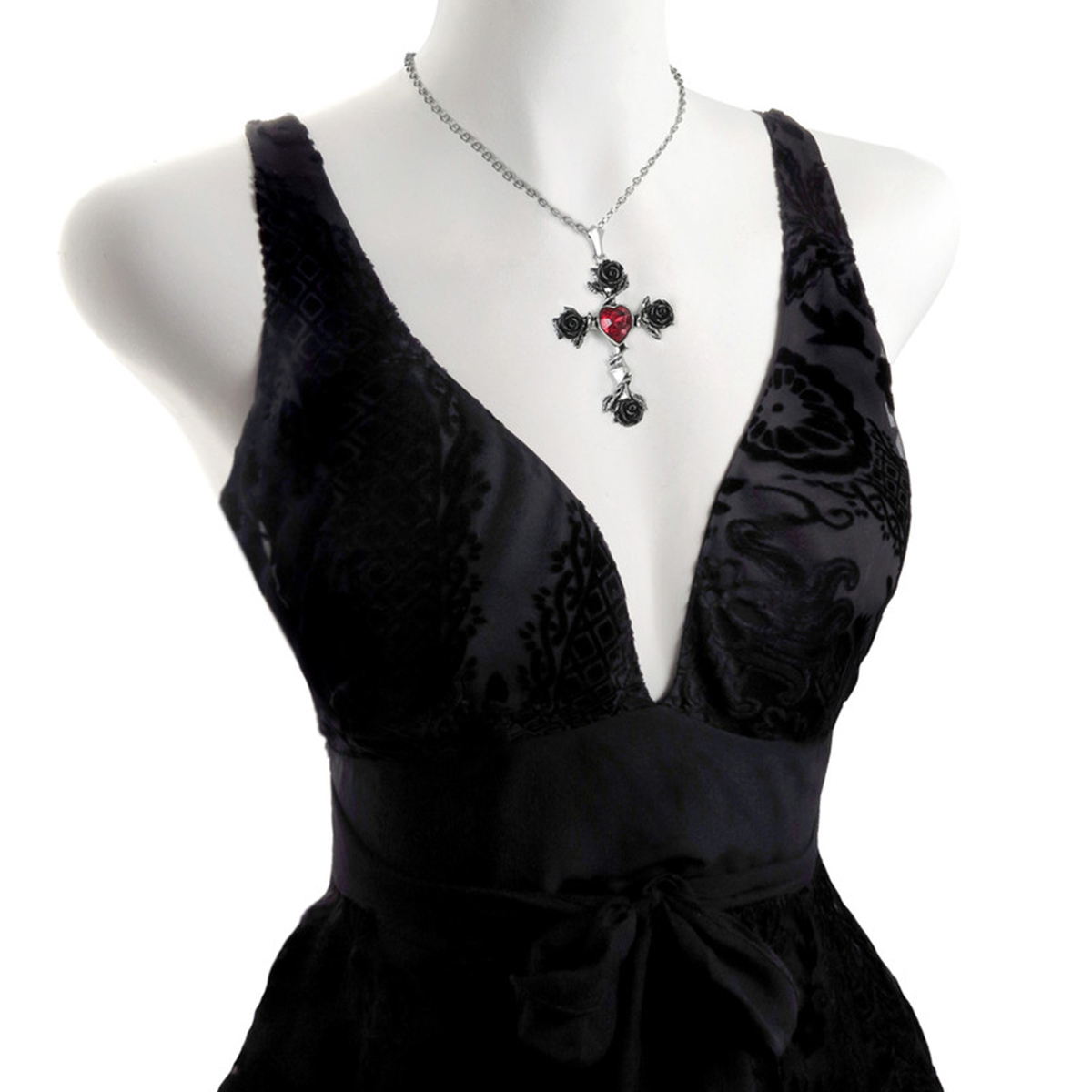 The cross of deep devotion, passion and eternal mystery; a crimson crystal heart, enigmatically extremitised by black roses.