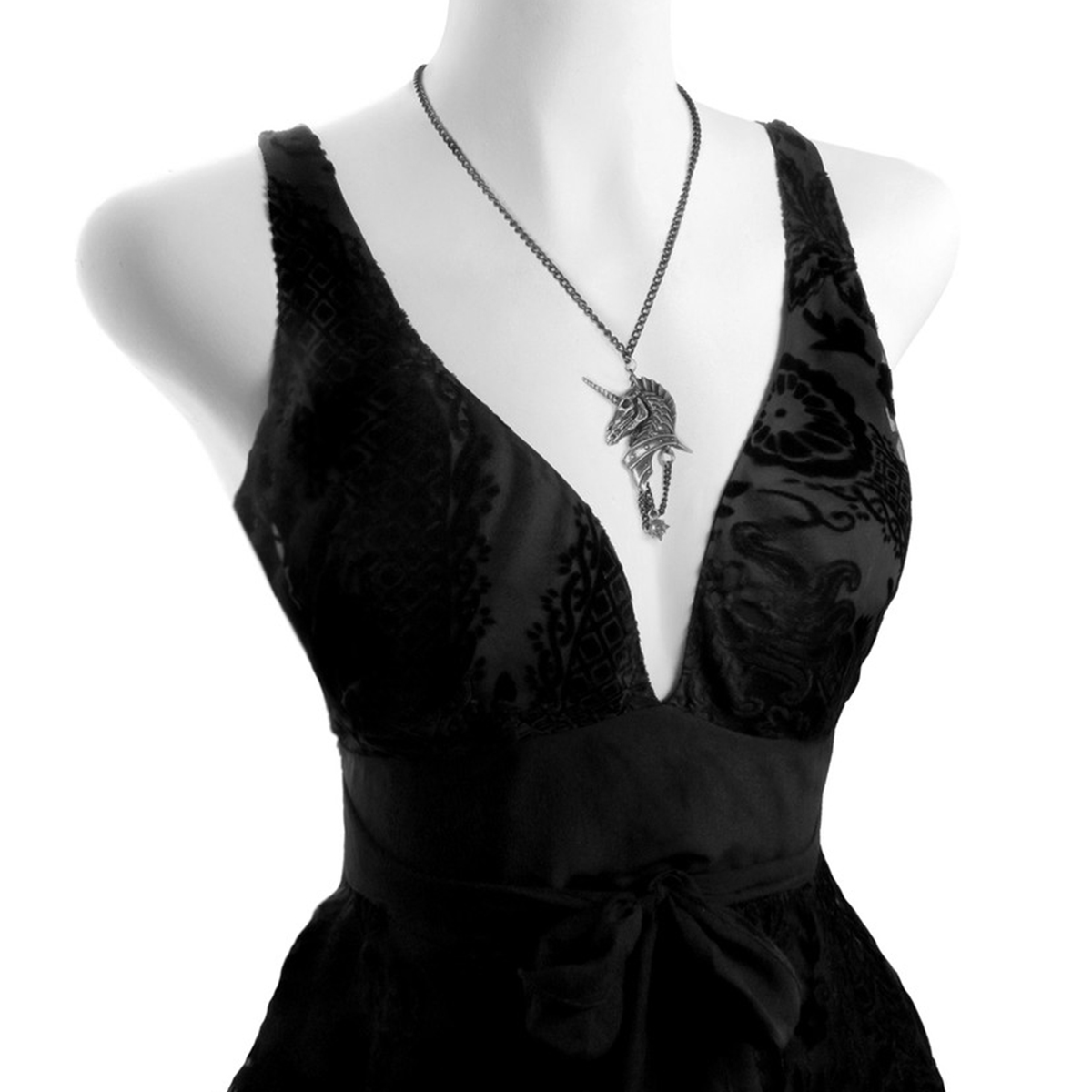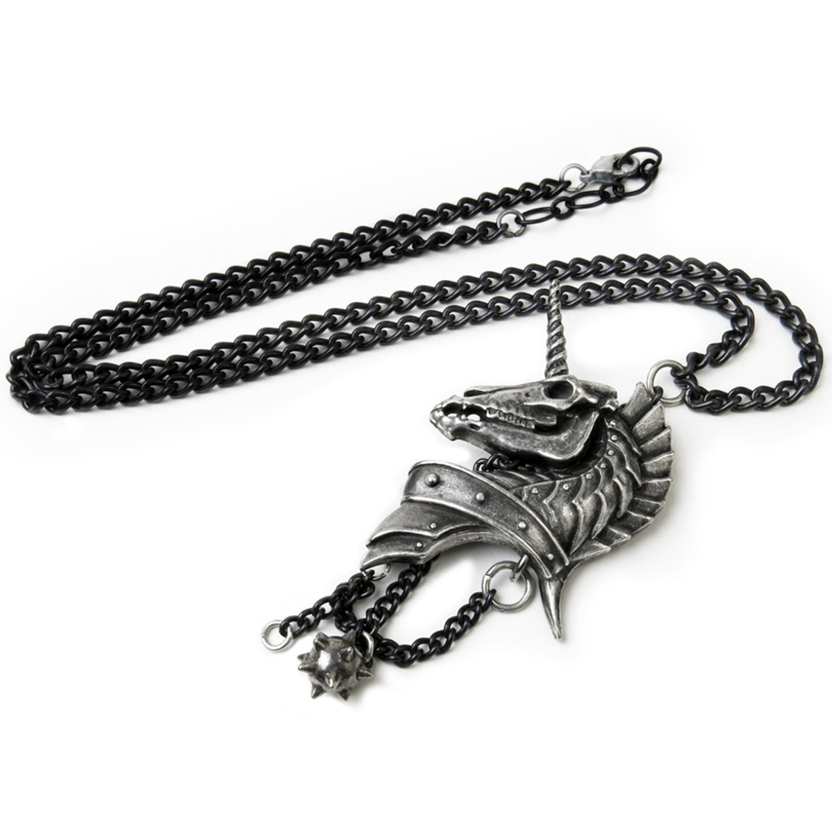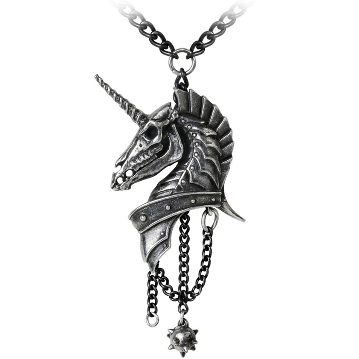 • Antiqued pewter pendant of a heavily armoured skeletal unicorn's head, in profile, with black chain and 'morning star' ball suspended beneath.