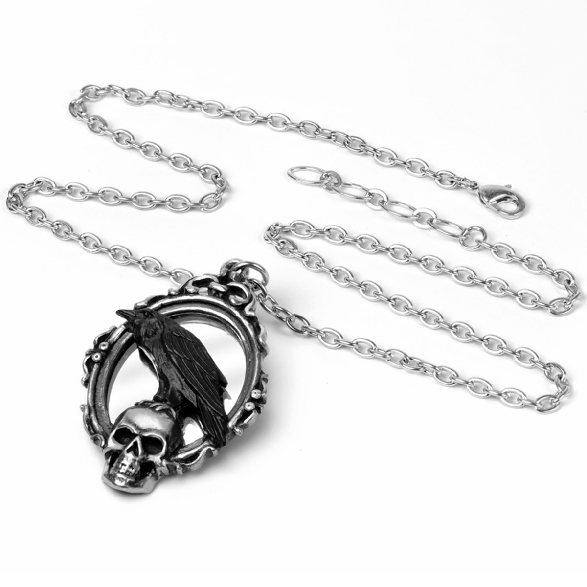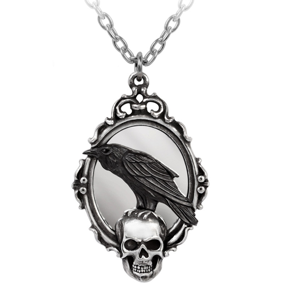 • A stunning mirror pendant with ornate frame featuring a polished skull. Inlaid with a contrasting jet black raven and on a split trace chain 18" (46 cm) overall, plus a 1.5" (3.8 mm) extender chain.