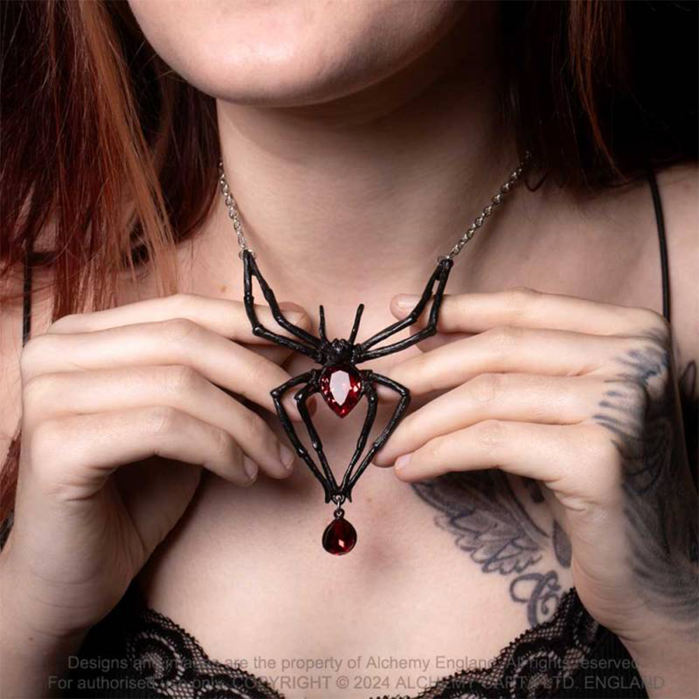 • A giant spider necklace in blackened pewter set with red Austrian crystals.