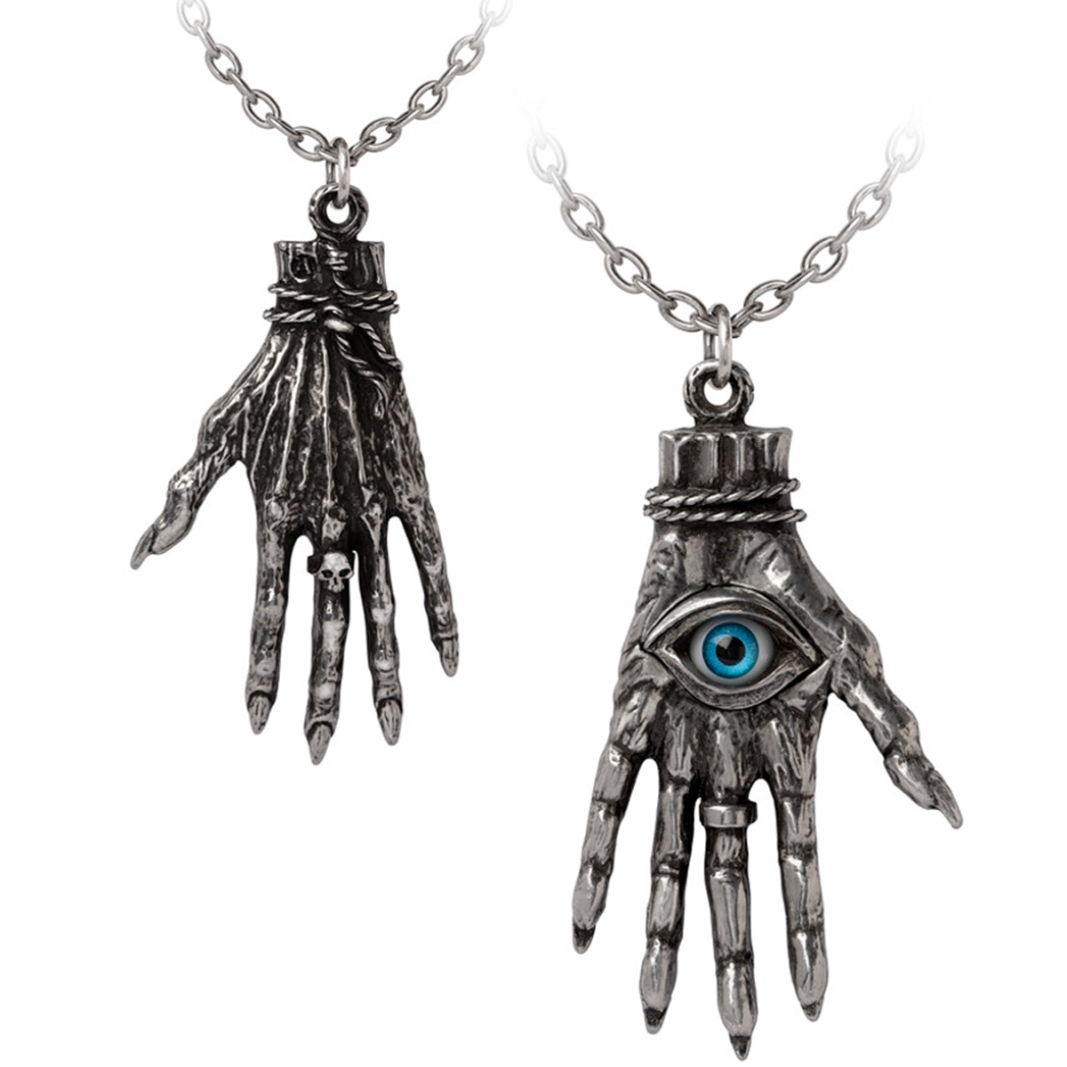 • A solid cast silver coloured replica hand with pointed finger nails, tiny skull ring detail and a blue inlaid eyeball.