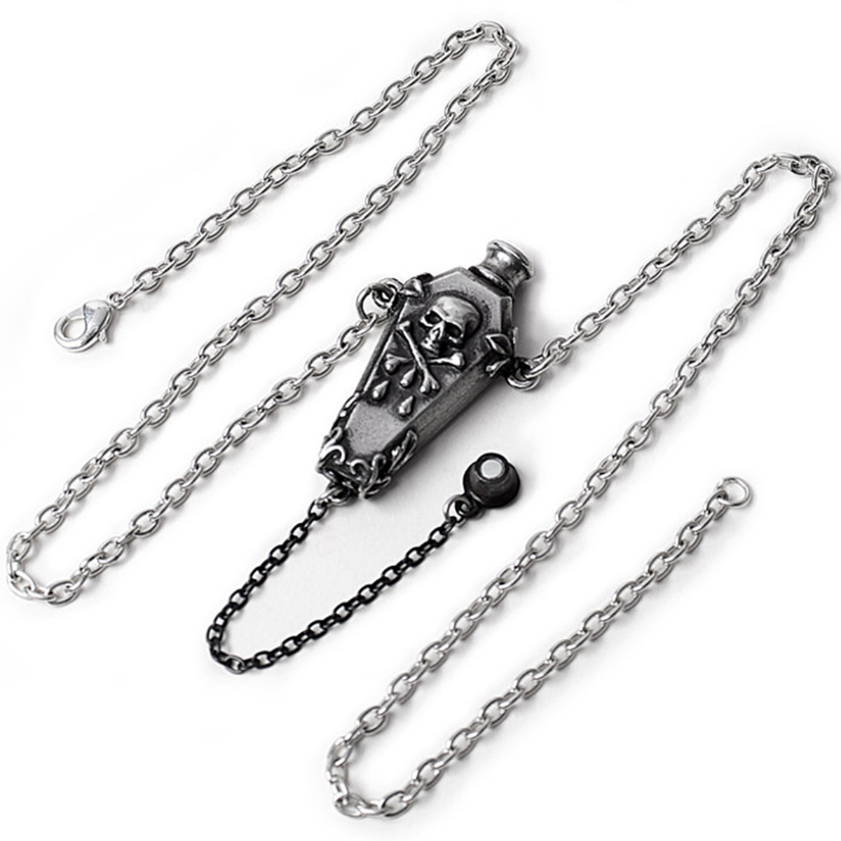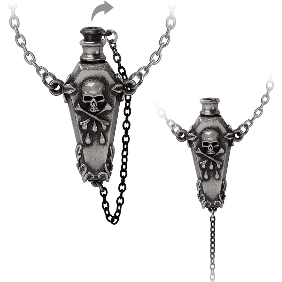 • An antique pewter coffin shaped poison bottle decorated with a skull and cross bones. Complete with a contrasting black removable lid.