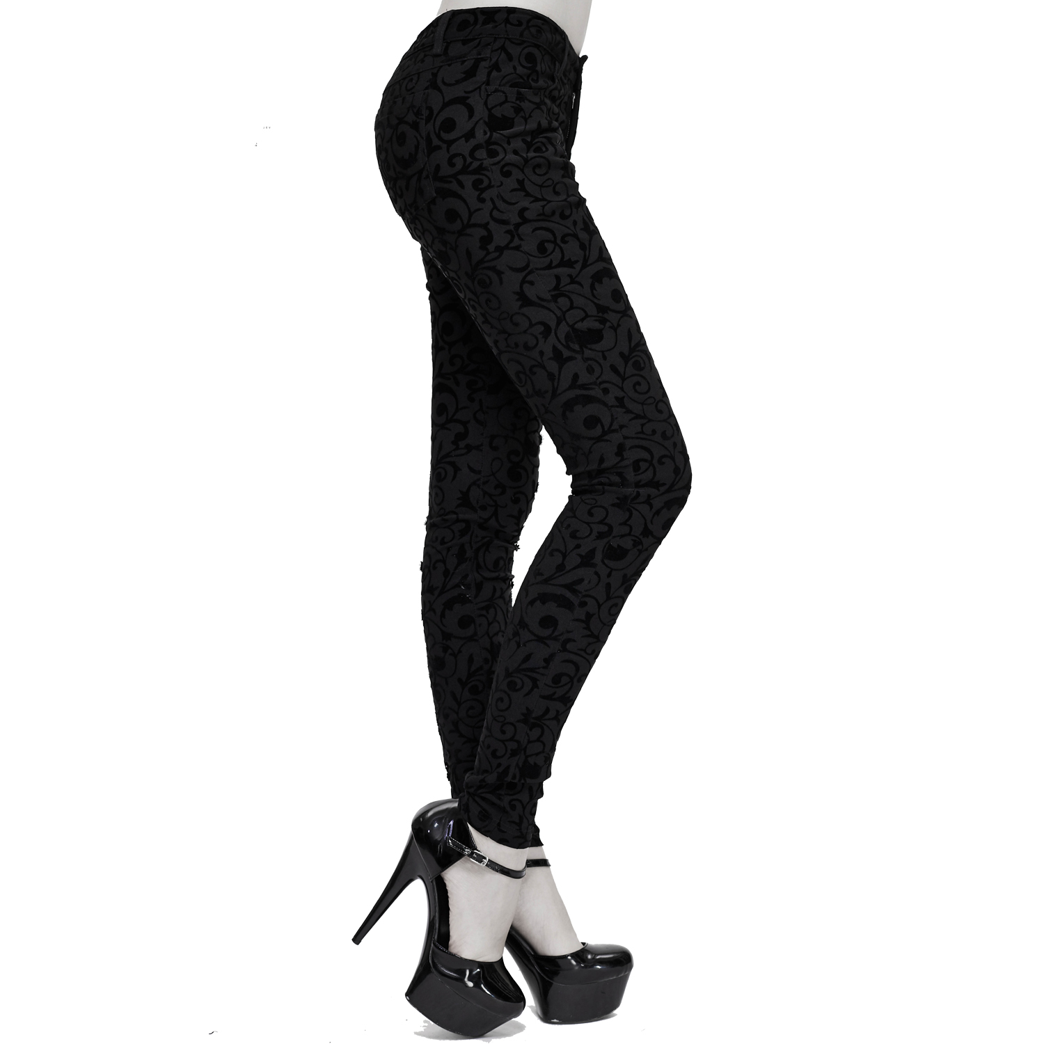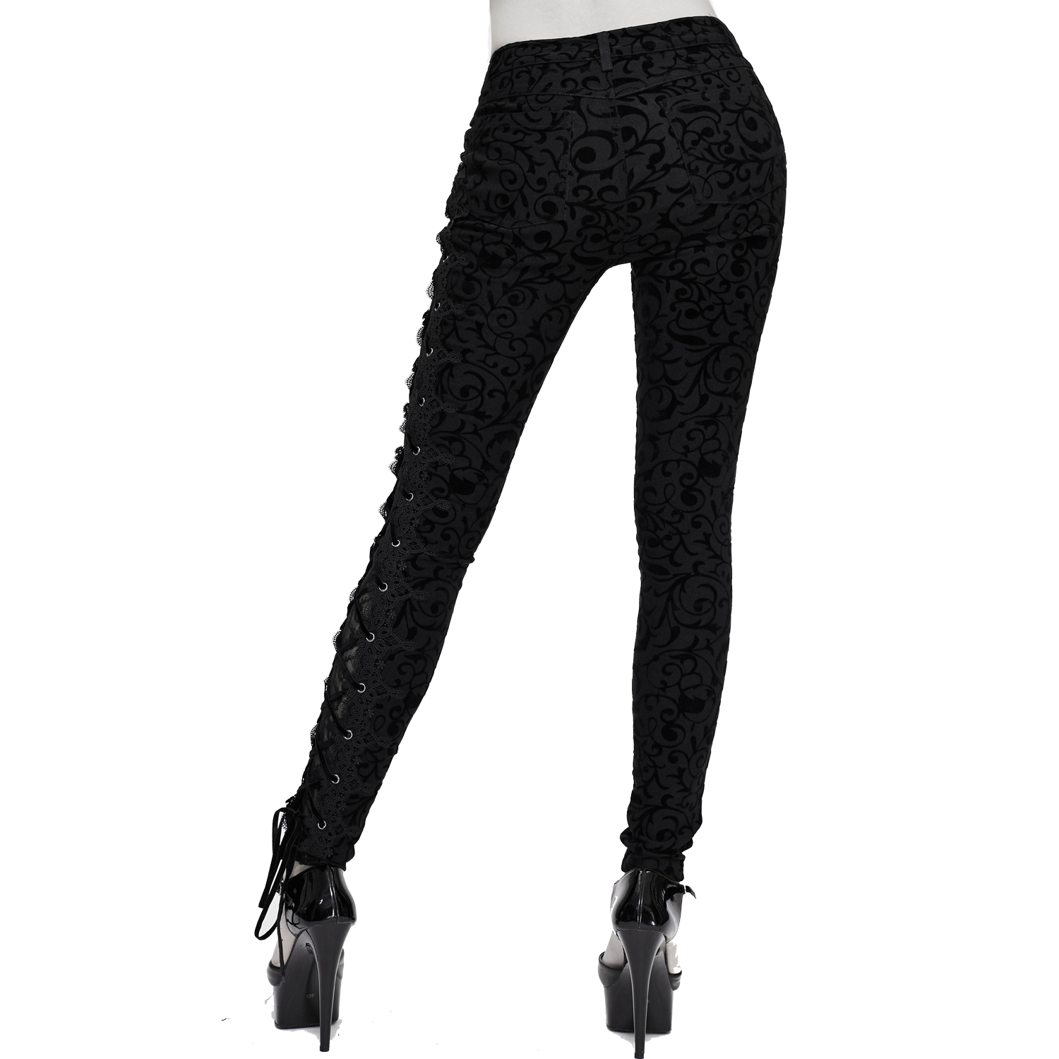 • In mesh and stretchy faux leather • Gothic cameo pattern print, roses and crosses on the front of the thighs • Lacing on the front of the thighs • Front zipper • Metal studs on faux leather on...