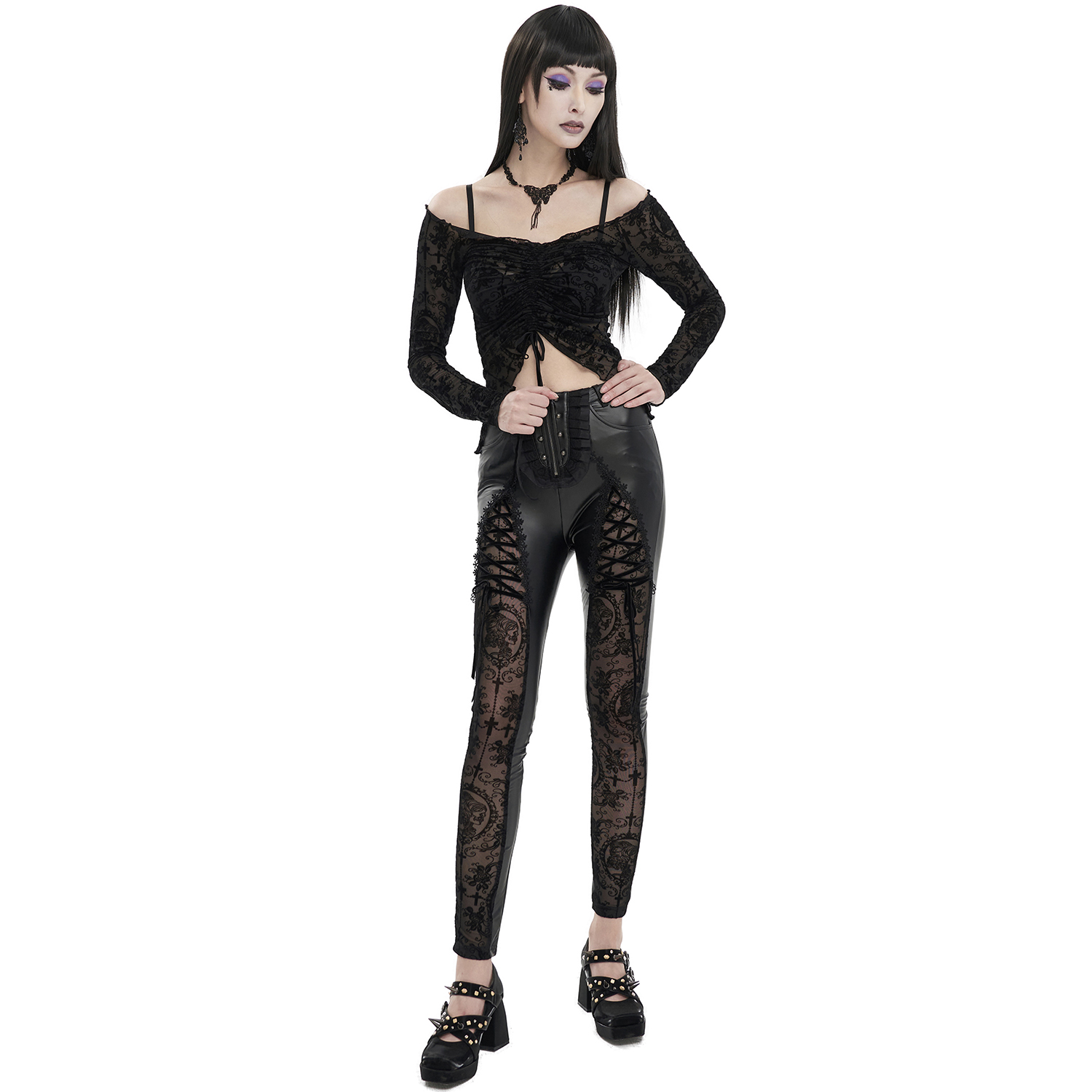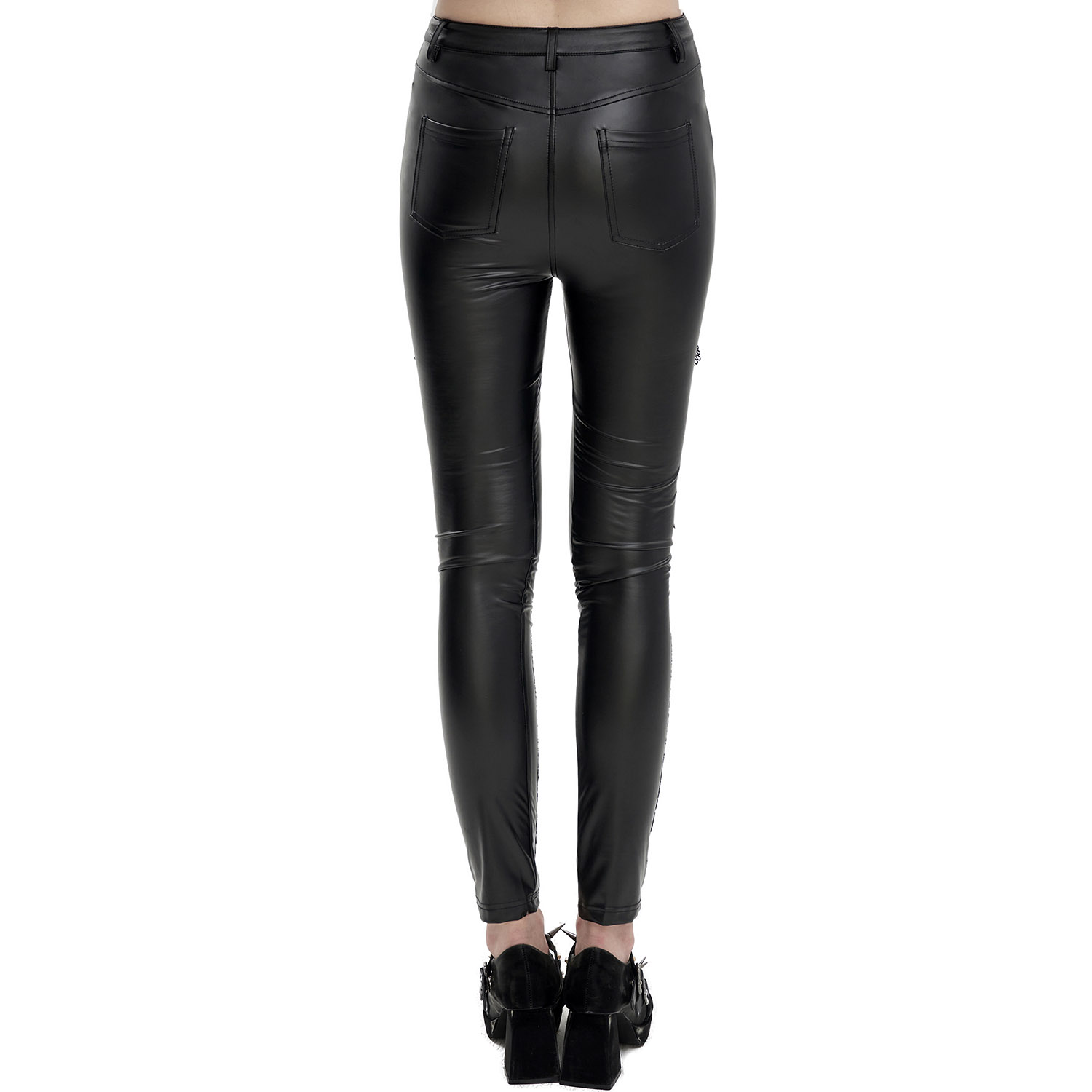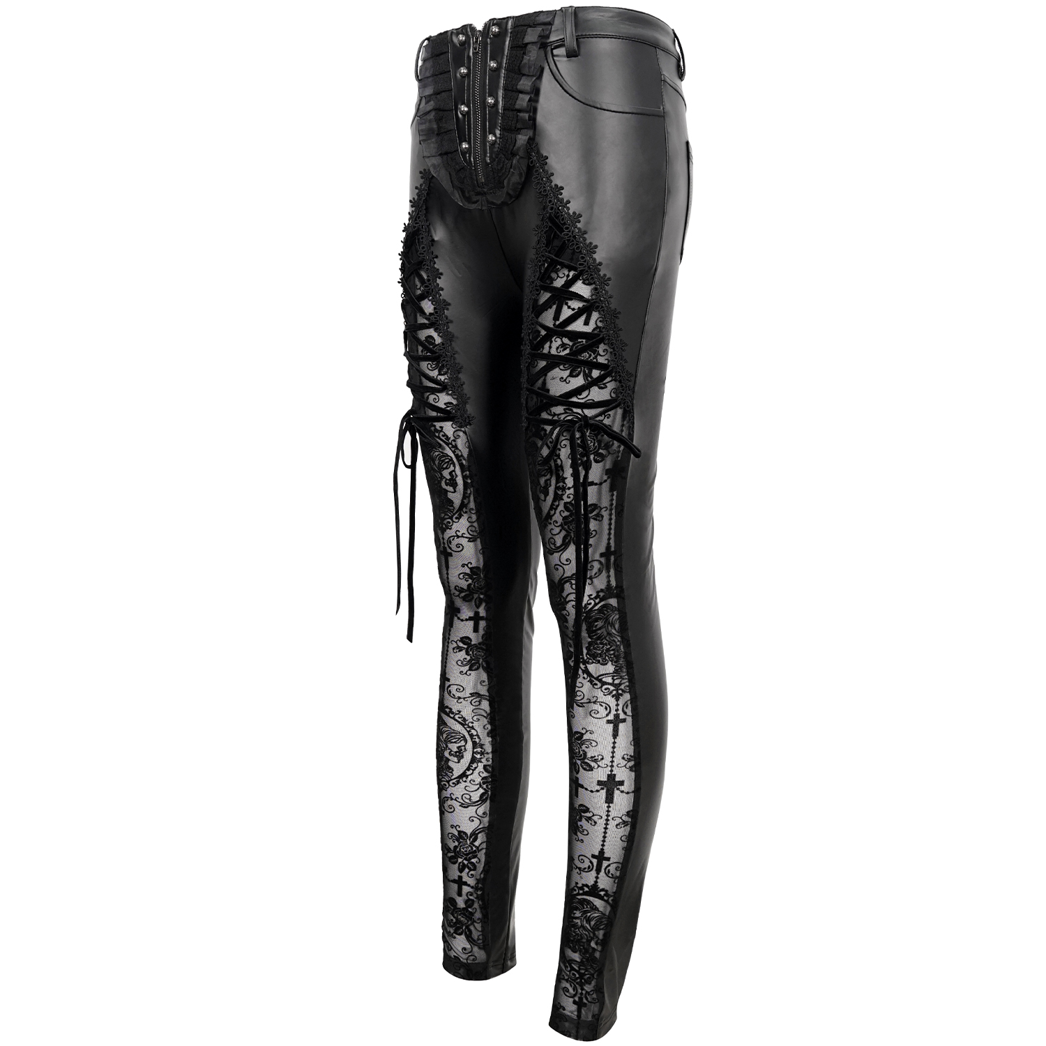 Gothic women's black vinyl slim fit trousers with cut-out laced calves and lacing at the front of the thighs. • Slim fit design • Made of mixed cotton and synthetic vegan leather knitted fabric...