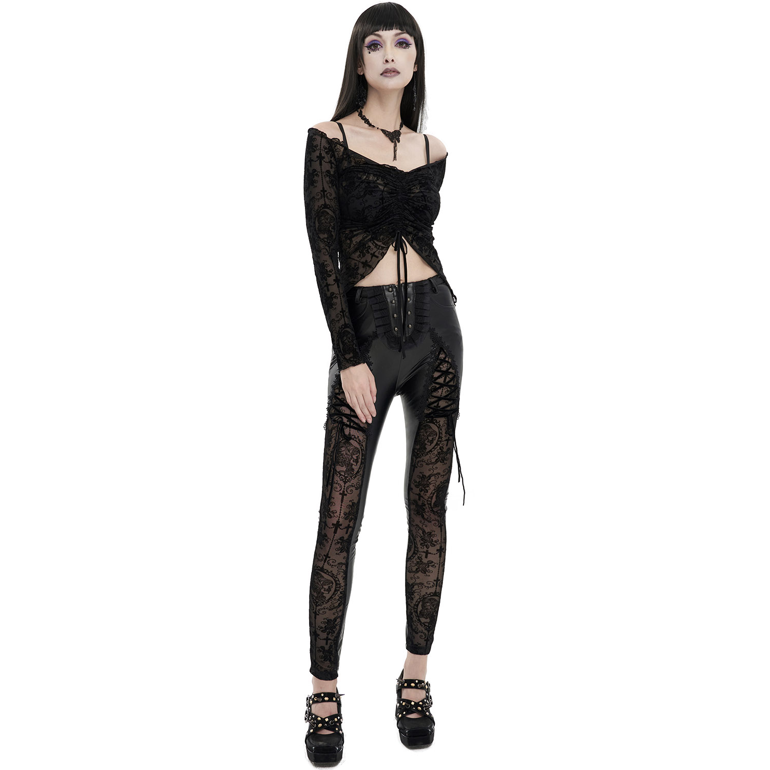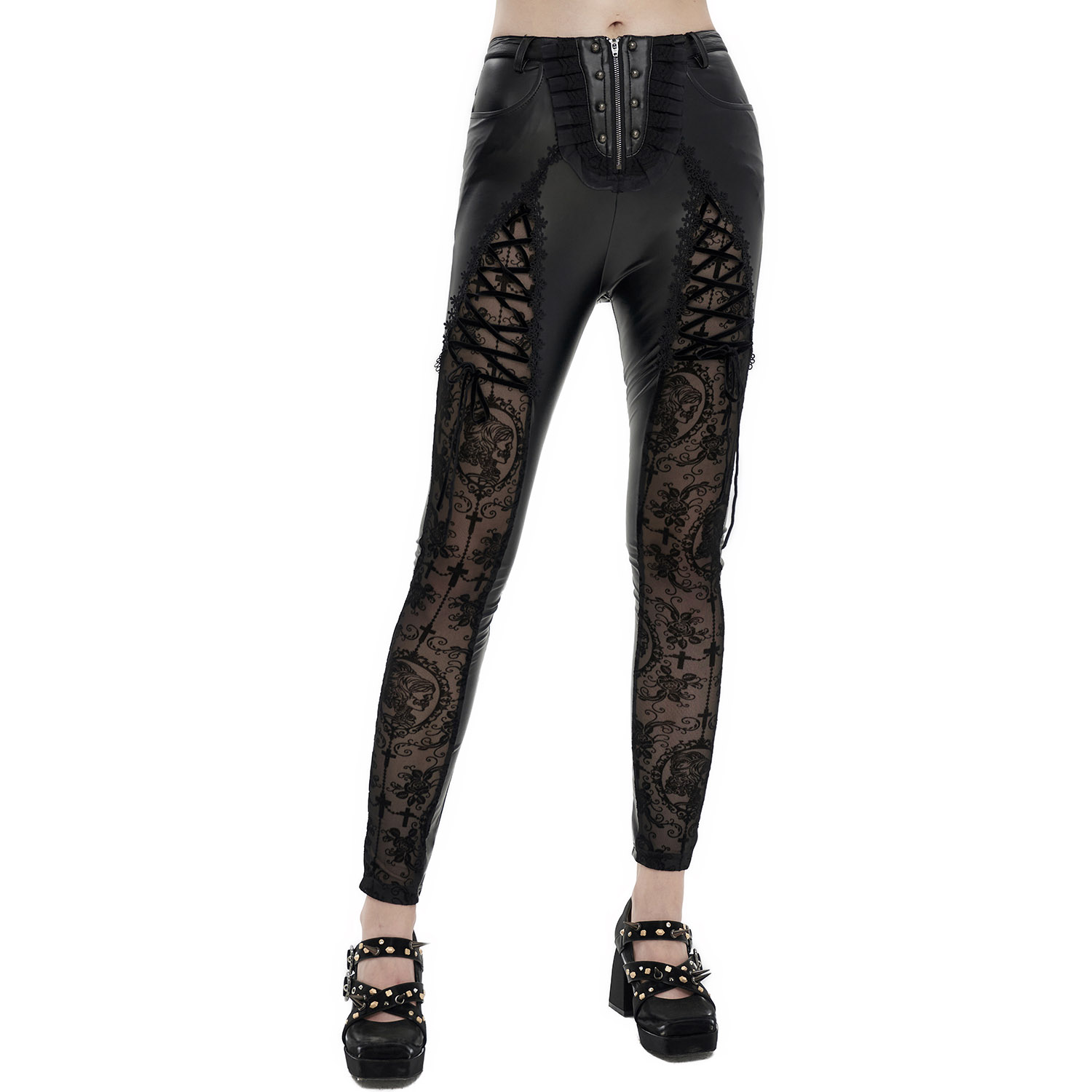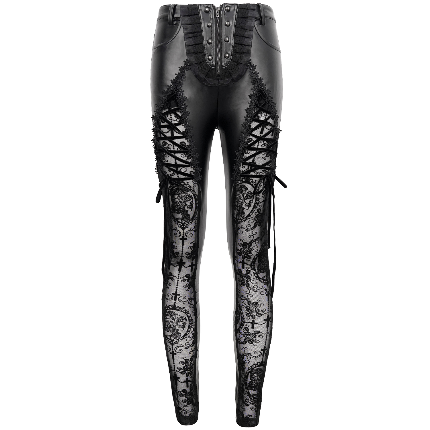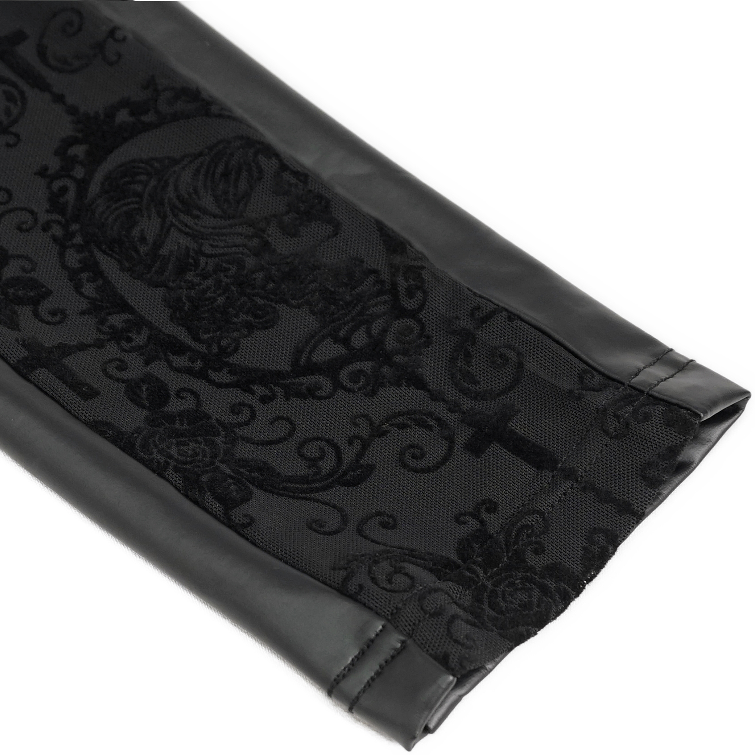 • In mesh and stretchy faux leather • Gothic cameo pattern print, roses and crosses on the front of the thighs • Lacing on the front of the thighs • Front zipper • Metal studs on faux leather on...